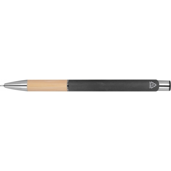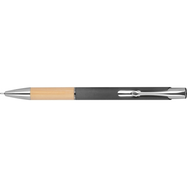 Piszący na niebiesko, pół żelowy długopis wykonany z aluminium pochodzącego z recyklingu ze srebrnymi elementami i bambusową strefą uchwytu.