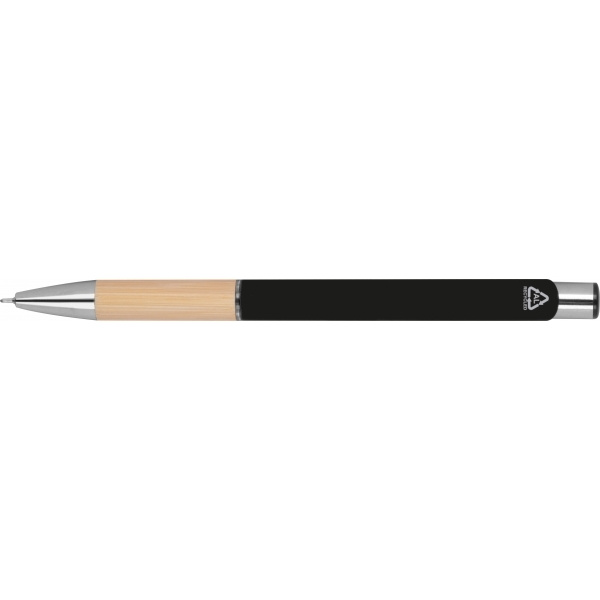 Piszący na niebiesko, pół żelowy długopis wykonany z aluminium pochodzącego z recyklingu ze srebrnymi elementami i bambusową strefą uchwytu.