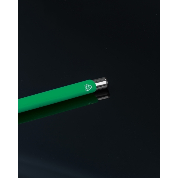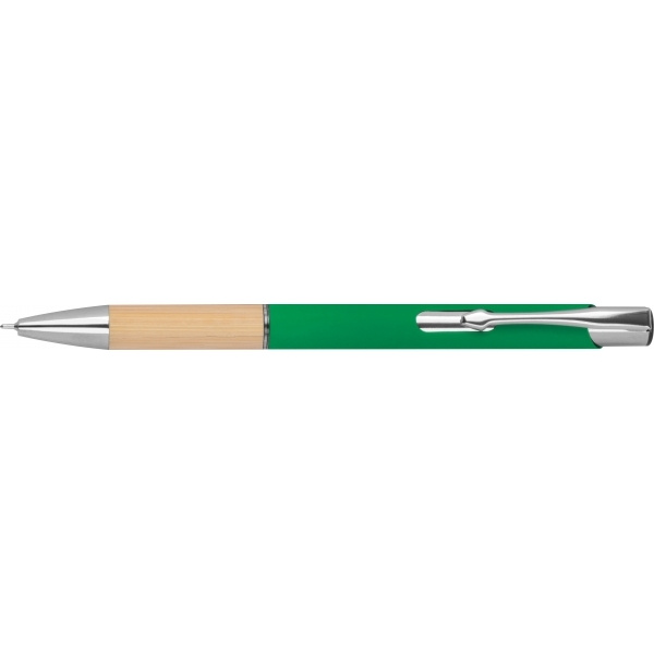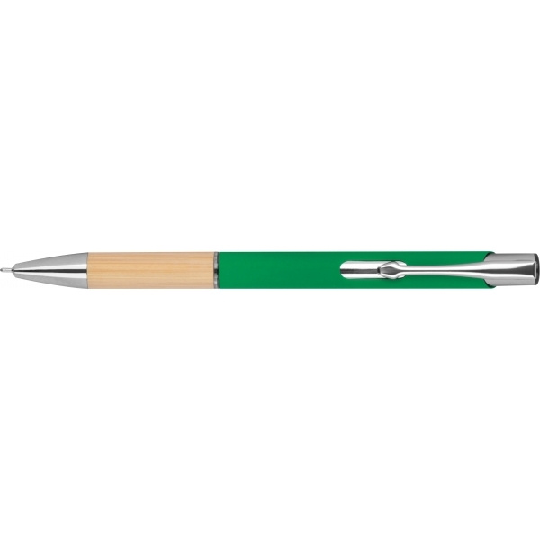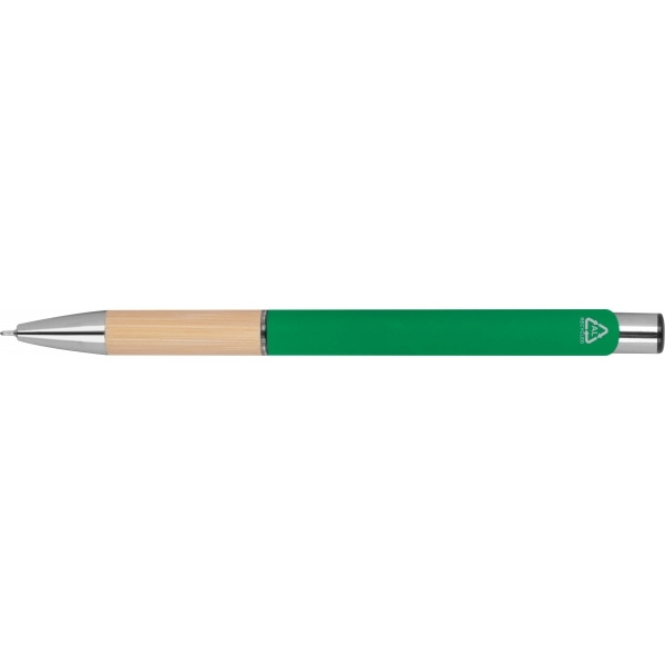 Piszący na niebiesko, pół żelowy długopis wykonany z aluminium pochodzącego z recyklingu ze srebrnymi elementami i bambusową strefą uchwytu.