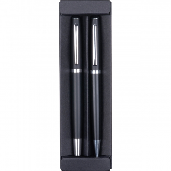 Zestaw składa się z pióra kulkowego i długopisu z półżelowym wkładem, piszącym na niebiesko (0,7 mm).