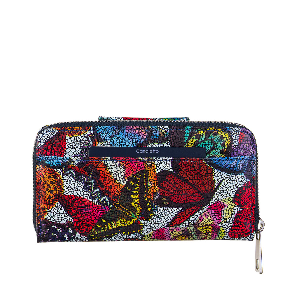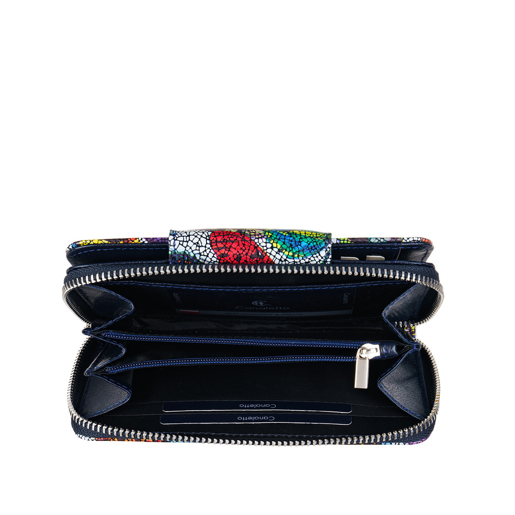 Portfel wykonano z naturalnej skóry licowej, która charakteryzuje się trwałością, odpornością na codzienne użytkowanie oraz pięknym, kolorowym wykończeniem. Wielobarwna kompozycja sprawia, że portfel wyróżnia się na tle innych modeli i wnosi odrobinę radości do codziennych stylizacji.