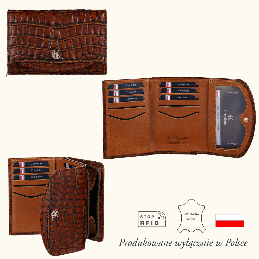 Damski portfel Canaletto ze skóry tłoczonej na wzór krokodyla to nie tylko modny dodatek – to wyraz Twojego stylu, dbałości o detale i zamiłowania do trwałych rozwiązań. Wybierz produkt, który spełnia najwyższe standardy – zarówno wizualne, jak i praktyczne.