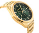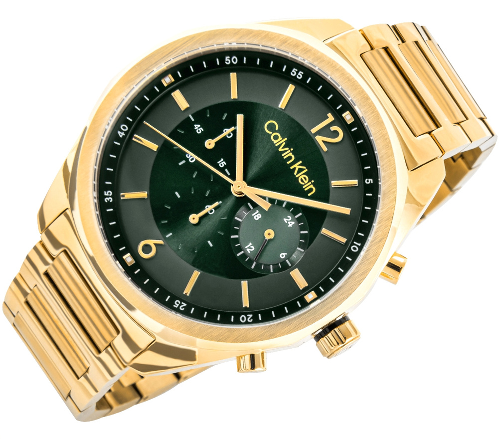 Model CALVIN KLEIN CK Force To projekt, który wybrzmiewa ciszą luksusu. Gładka, szczotkowana stal w odcieniu szampańskiego złota łączy się tu ze szmaragdową tarczą o dynamicznym efekcie sunray, który zmienia się zależnie od światła – niczym dobrze skalibrowany wyświetlacz. Geometryczna forma koperty w połączeniu ze szczotkowaną powierzchnią robi efekt „wow” bez zbędnego błysku. Trzy subtarcze odpowiadają za funkcję 24-godzinnego trybu, datownika oraz dnia tygodnia, zapewniając pełną kontrolę nad czasem. Ich układ został zaprojektowany tak, by zachować czytelność i równowagę wizualną całej tarczy. Całość zamyka solidna koperta z precyzyjnym bezelem, który podkreśla nowoczesny, męski styl. To zegarek, który płynnie przechodzi między biurem, spotkaniem biznesowym a wieczorem przy winie – bez zbędnych kompromisów. Zawsze z klasą, zawsze na poziomie.