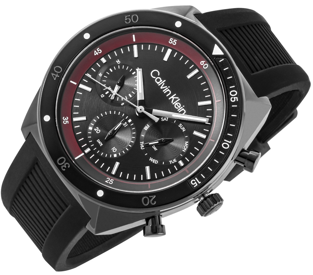 Model CALVIN KLEIN CK Flex to manifest miejskiego stylu z nutą adrenaliny. Kontrast czarnej tarczy i burgundowego pierścienia buduje napięcie wizualne, jakby zegarek miał zaraz wystartować. Na tarczy znajdziesz trzy subtarcze: 24-godzinny tryb, datownik oraz wskaźnik dnia tygodnia – wszystko rozmieszczone tak, by zapewnić intuicyjną czytelność i zachować balans. Solidny bezel i wyraziste przyciski wzmacniają sportowy, a zarazem wyrafinowany klimat zegarka. Gumowy pasek z żłobieniami dopełnia całości, oferując komfort noszenia - sportowy, praktyczny, ale wciąż elegancki. CALVIN KLEIN CK Flex to zegarek, który świetnie odnajdzie się zarówno przy biurku, w trakcie dynamicznych spotkań, jak i wieczorem – podczas spokojnego czasu dla siebie.