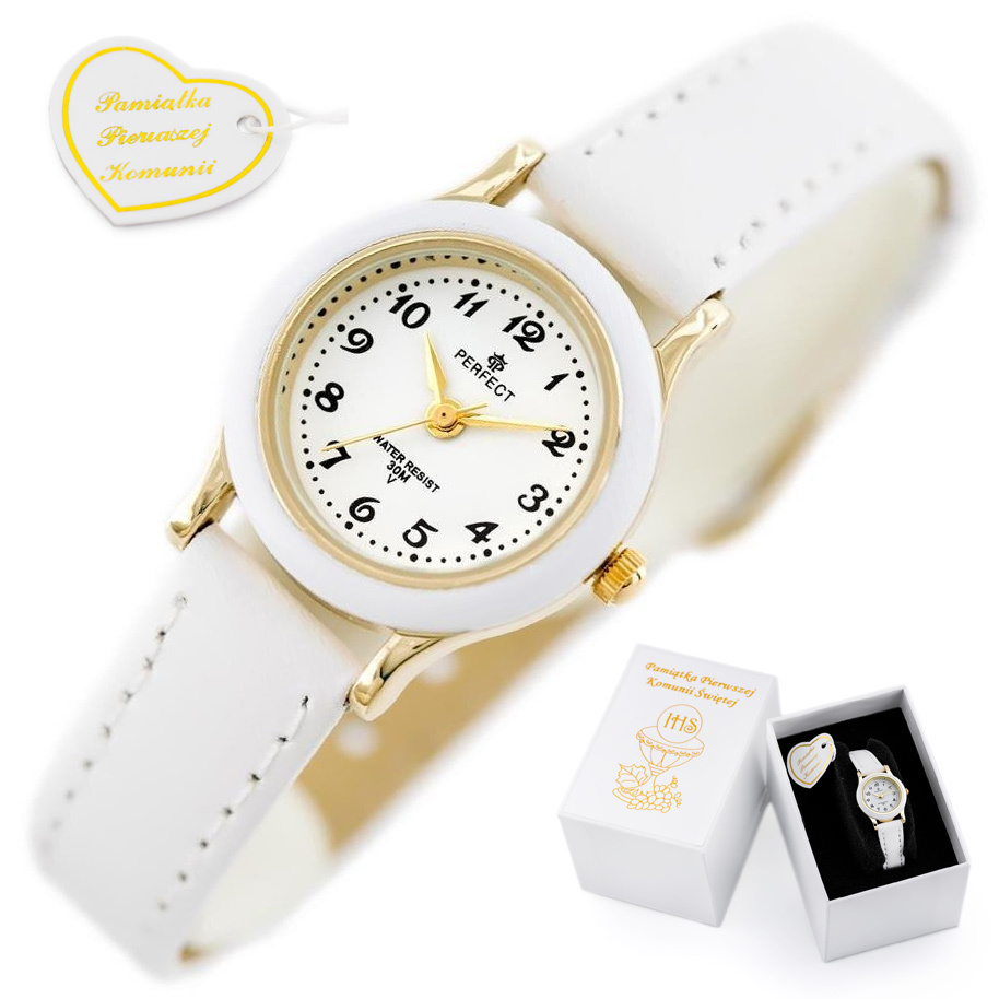 Zegarek dziecięcy PERFECT LP195-02 – KOMUNIJNY to wyjątkowy i delikatny dodatek, stworzony z myślą o tym szczególnym dniu. Posiada biały skórzany pasek, który doskonale komponuje się z białą kopertą i białą tarczą, tworząc elegancką, a zarazem subtelną całość. Złoty indeks nadaje zegarkowi klasy i sprawia, że czas jest łatwy do odczytania, nawet dla najmłodszych. Ten model to idealny prezent na Komunię Świętą – zarówno praktyczny, jak i symboliczny. Zegarek jest zapakowany w ozdobne pudełko z napisem "Pamiątka Pierwszej Komunii Świętej", co czyni go gotowym do wręczenia, bez potrzeby dodatkowego pakowania. To ponadczasowa pamiątka, która przez lata będzie przypominać o wyjątkowych chwilach tego dnia.