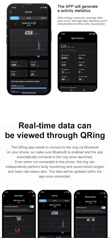 Dane w czasie rzeczywistym dostępne przez aplikację QRing. Nawet jeśli pierścień nie jest aktualnie połączony z telefonem, potrafi niezależnie monitorować organizm, rejestrować poziom tlenu we krwi oraz tętno. Dane zostaną zsynchronizowane z aplikacją przy następnym połączeniu.