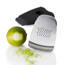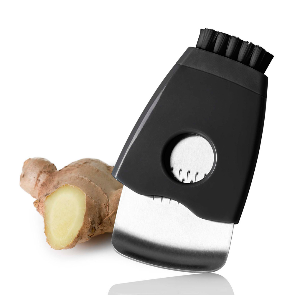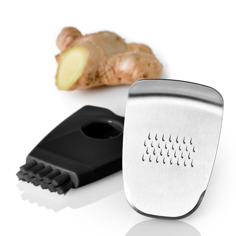 Oprócz tarcia imbiru świetnie poradzi sobie także z tarciem chrzanu czy selera. Sprawdzi się także przy ścieraniu skórki cytryny. Jej ostre jak żyletka ząbki pozwolą na idealne tarcie, a zintegrowana obieraczka umożliwi obranie imbiru ze skórki. Można ją wygodnie i bezpiecznie przechowywać w dołączonym etui, a zintegrowana z nim szczoteczka zdecydowanie ułatwi czyszczenie. Produkt został zaprojektowany przez AdHoc Design Team. Materiał: plastik/stal nierdzewna. Wymiary: wysokość – 11,4cm, szerokość – 7,2cm.