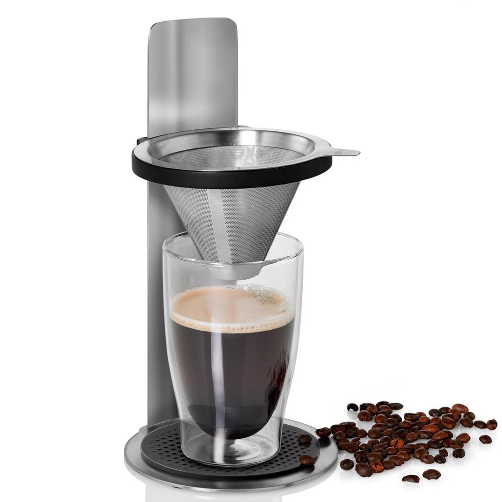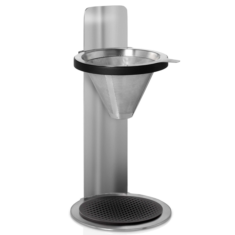 Dzięki magnetycznej regulacji wysokości filtra możliwe jest dopasowanie go do różnej wielkości naczyń. Dwuwarstwowy filtr ze stali nierdzewnej o niezwykle małych mikroporach nie pozostawia metalicznego smaku. Specjalny uchwyt pozwala na łatwe zdemontowanie filtra do czyszczenia. Produkt został zaprojektowany przez AdHoc Design Team. Wymiary: wysokość – 26,5cm, średnica – 12cm, filtr: wysokość – 8cm, średnica – 11,8cm. Materiał: stal nierdzewna/plastik/magnes. Czyszczenie: z zewnątrz czyścić jedynie miękkim, wilgotnym ręcznikiem. Następnie wysuszyć. Filtr należy opłukiwać pod bieżącą, gorącą wodą. Od czasu do czasu zaleca się czyszczenie filtra odtłuszczaczem.