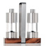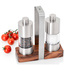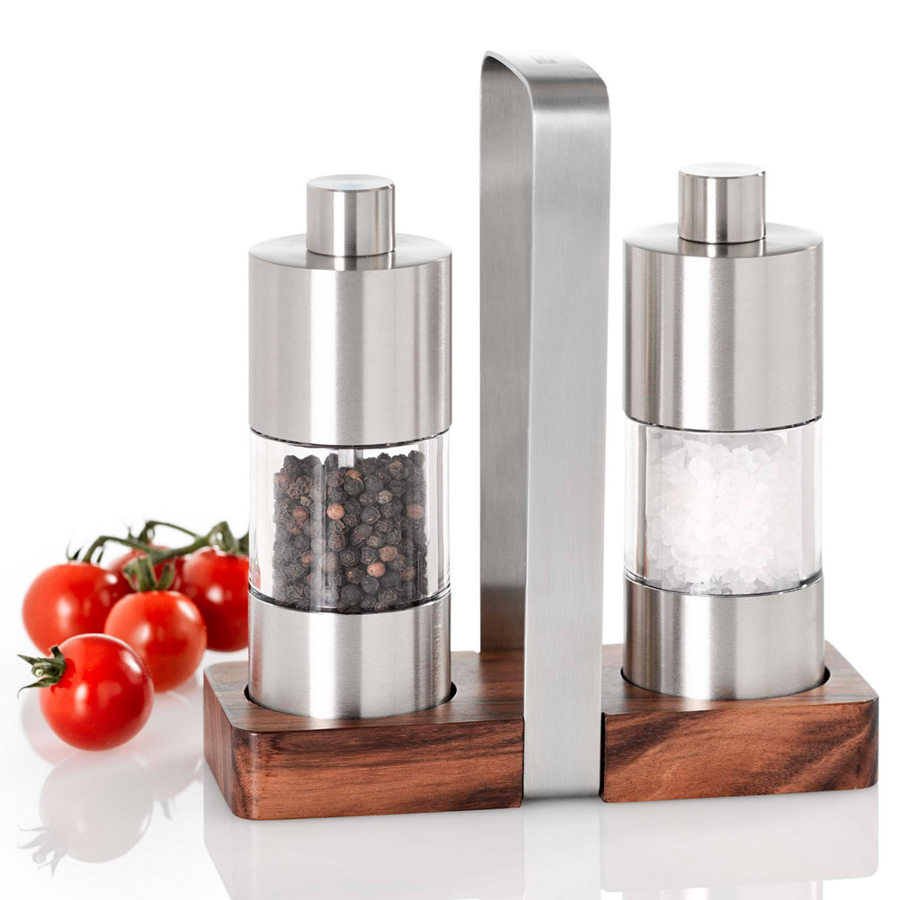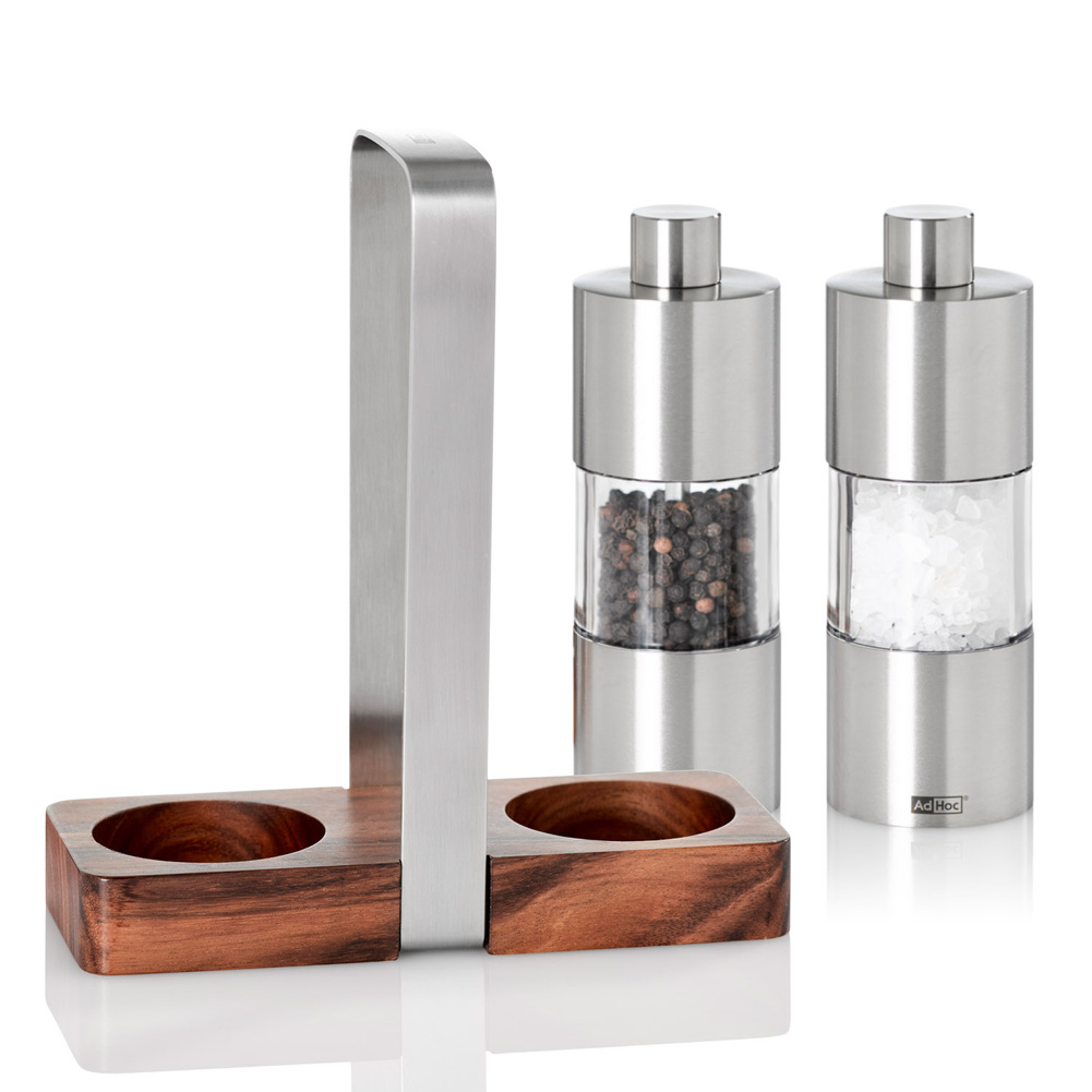 Są to młynki wyposażone w bardzo wydajne żarna CeraCut®, które są wolne od zapachów i smaków, a także są niezwykle odporne na korozje i zużycie. Młynki posiadają mechanizm doboru grubości mielenia w pełnej skali od drobnego do grubego rozmiaru. Zawarta w zestawie podstawka do przechowywania zapewni czystość blatu, a także może ułatwić przenoszenie młynków. Nie należy myć w zmywarce. Produkt został zaprojektowany przez AdHoc Design Team. Materiał: stal nierdzewna, akryl, drewno akacjowe. Wymiary młynka: średnica – 4,5cm, wysokość – 13cm. Wymiary podstawy: długość – 16cm, szerokość – 6cm, wysokość – 16cm.