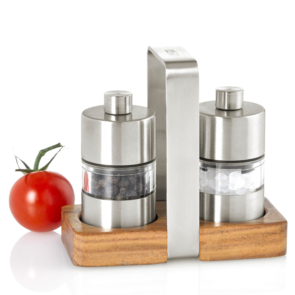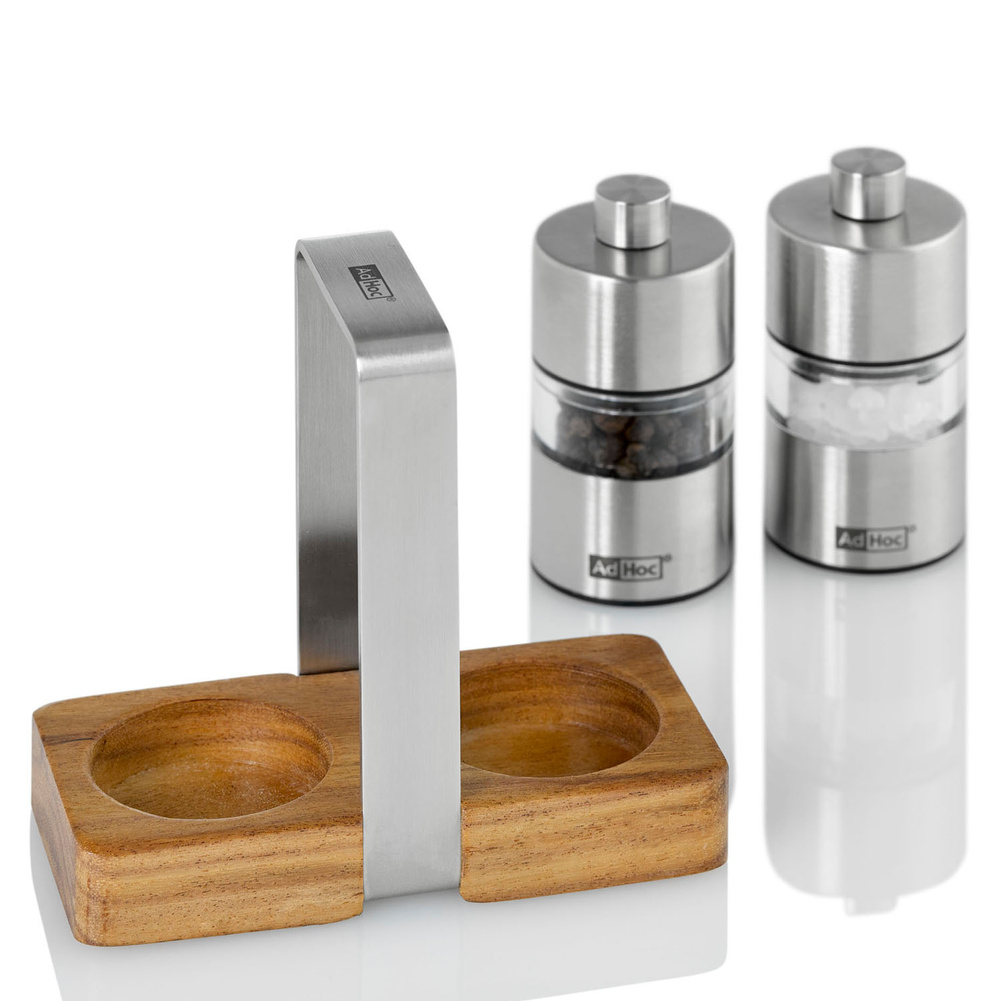 Są to młynki wyposażone w bardzo wydajne żarna CeraCut®, które są wolne od zapachów i smaków, a także są niezwykle odporne na korozje i zużycie. A poza tym są to najmniejsze na świecie młynki posiadające mechanizm doboru grubości mielenia w pełnej skali od drobnego do grubego rozmiaru. Zawarta w zestawie podstawka do przechowywania zapewni czystość blatu, a także może ułatwić przenoszenie młynków. Cały zestaw jest mały i kompaktowy, co uwydatnia komfort codziennego użytkowania. Nie należy myć w zmywarce. Produkt został zaprojektowany przez AdHoc Design Team. Materiał: stal nierdzewna, akryl, drewno akacjowe. Wymiary młynka: średnica – 3,2cm, wysokość – 6,2cm. Wymiary podstawy: długość – 9,2cm, szerokość – 4,5cm, wysokość – 8,5cm.