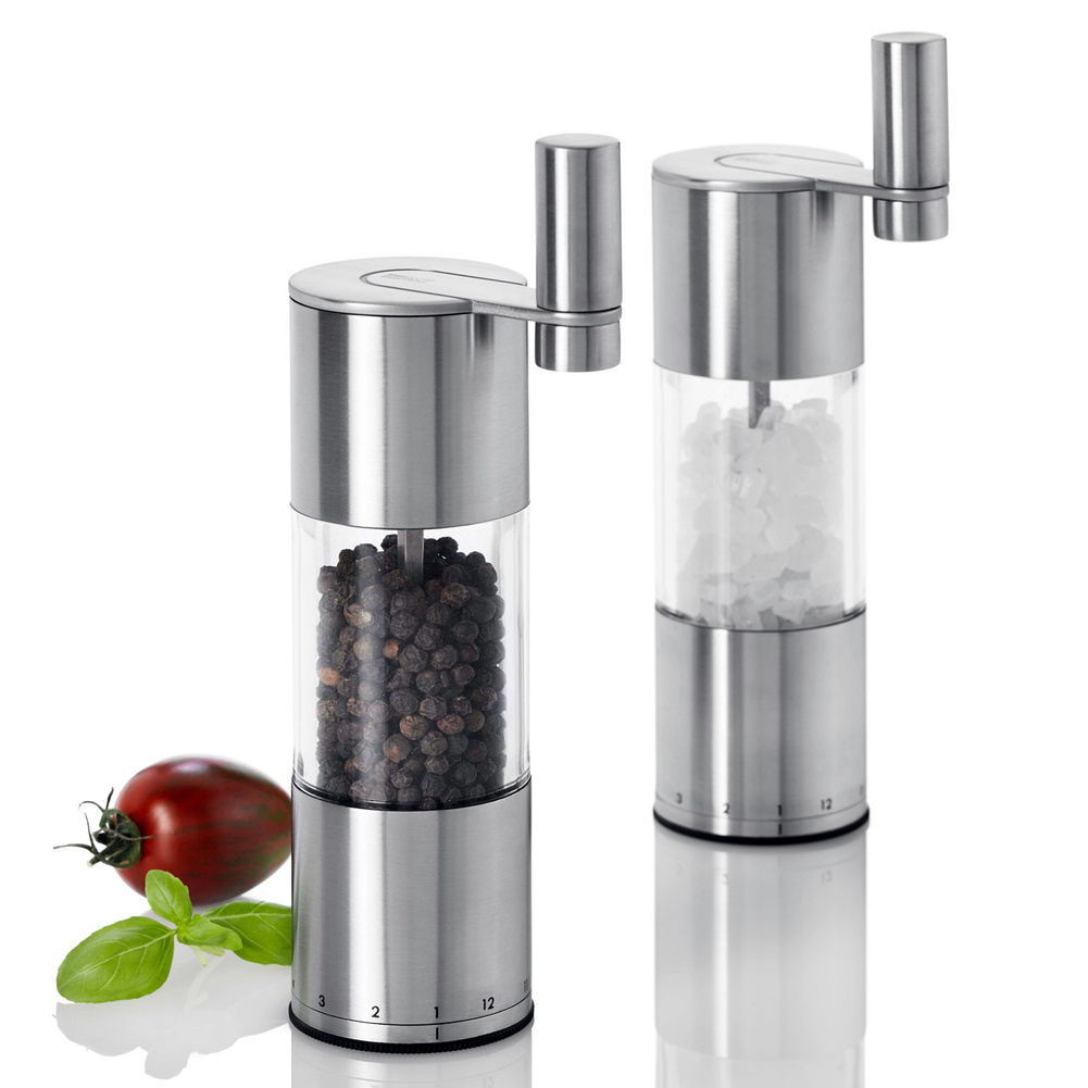 Młynek korbkowy SELECT został wyposażony w system przekładni PLANET+® ułatwiający mielenie dużych i twardych ziaren oraz w mechanizm precyzyjnego doboru grubości mielenia PRECISE+®. Zewnętrzny mechanizm precyzyjnego doboru grubości mielenia jest łatwy w użyciu i posiada 12 stopni, od proszku po grube kawałki. Młynek posiada także bardzo wydajne żarna CeraCut®, które są wolne od zapachów i smaków, a także są niezwykle odporne na zużycie i korozję. Produkt został zaprojektowany przez AdHoc Design Team. Materiał: stal nierdzewna, akryl, plastik, ceramiczne żarna CeraCut®. Wymiary: średnica – 8cm, wysokość – 20cm.