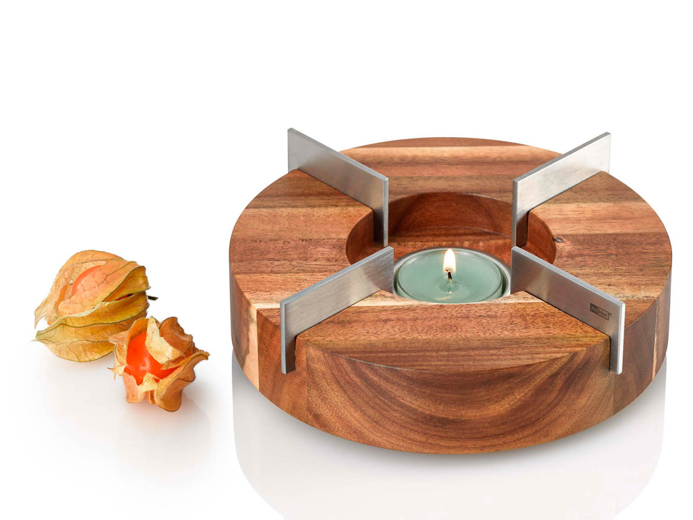 Podgrzewacz TUTO został stworzony do utrzymywania temperatury zawartości imbryczka ORIENT+ ale może być też wykorzystany do podgrzania garnków bądź misek. Produkt został zaprojektowany przez AdHoc Design Team. Materiał: drewno akacjowe, stal nierdzewna. Wymiary: średnica – 16cm, wysokość 5,5cm.