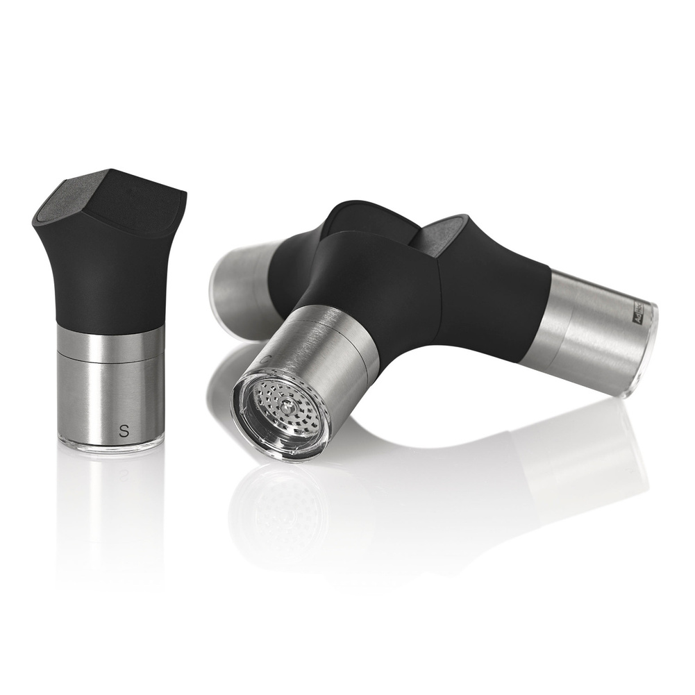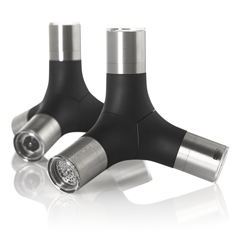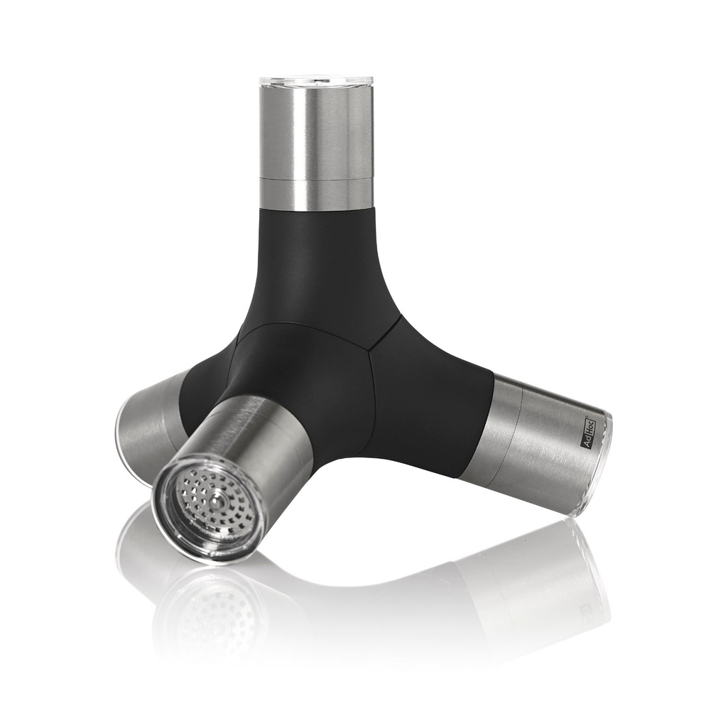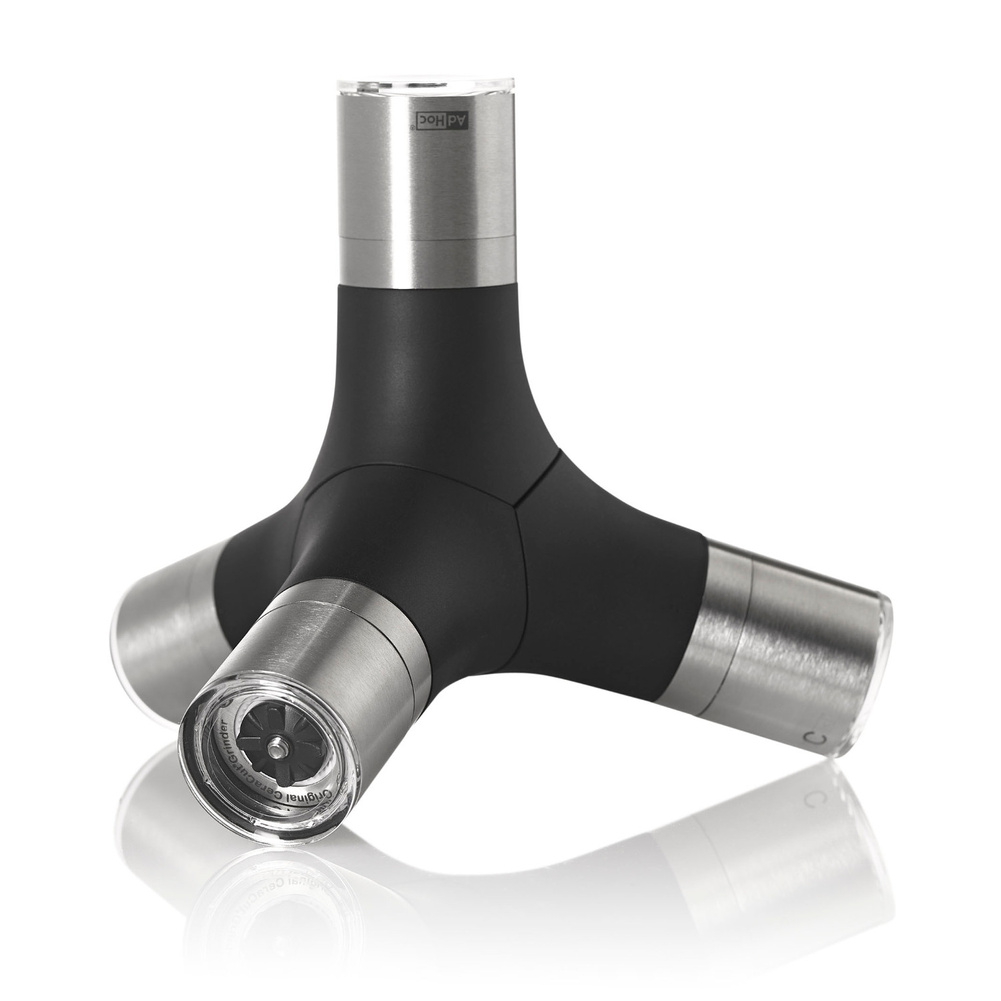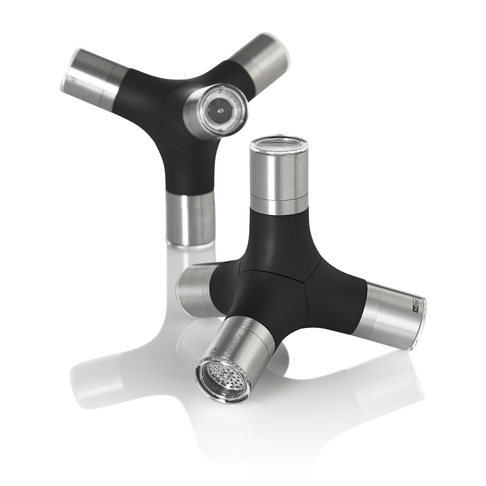 Trzy małe młynki i jeden krajacz do chili złączone mocnymi magnesami w jeden duży młynek to doskonałe połącznie funkcjonalności z ekscentrycznym designem. Młynek łączy w sobie walory użytkowe i dekoracyjne. Jeśli wolisz, w każdej chwili możesz go rozdzielić na cztery małe młynki. Młynki wyposażone zostały w ceramiczne żarna CeraCut® , krajacz do chilli w opatentowane ostrza PreciseCut®, które pokroją papryczki na bardzo drobne płatki. Młynki do pieprzu i soli posiadają płynną regulację grubości mielenia w szerokim zakresie co pozwoli ci przyprawić jak lubisz. Młynek zaleca się myć ręcznie. Produkt został zaprojektowany przez AdHoc Design Team oraz Rolanda Kreitera.