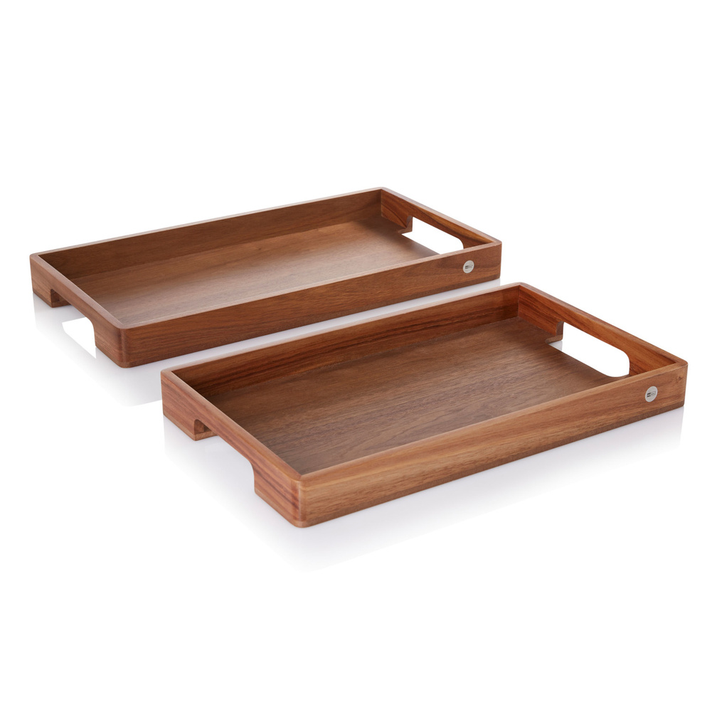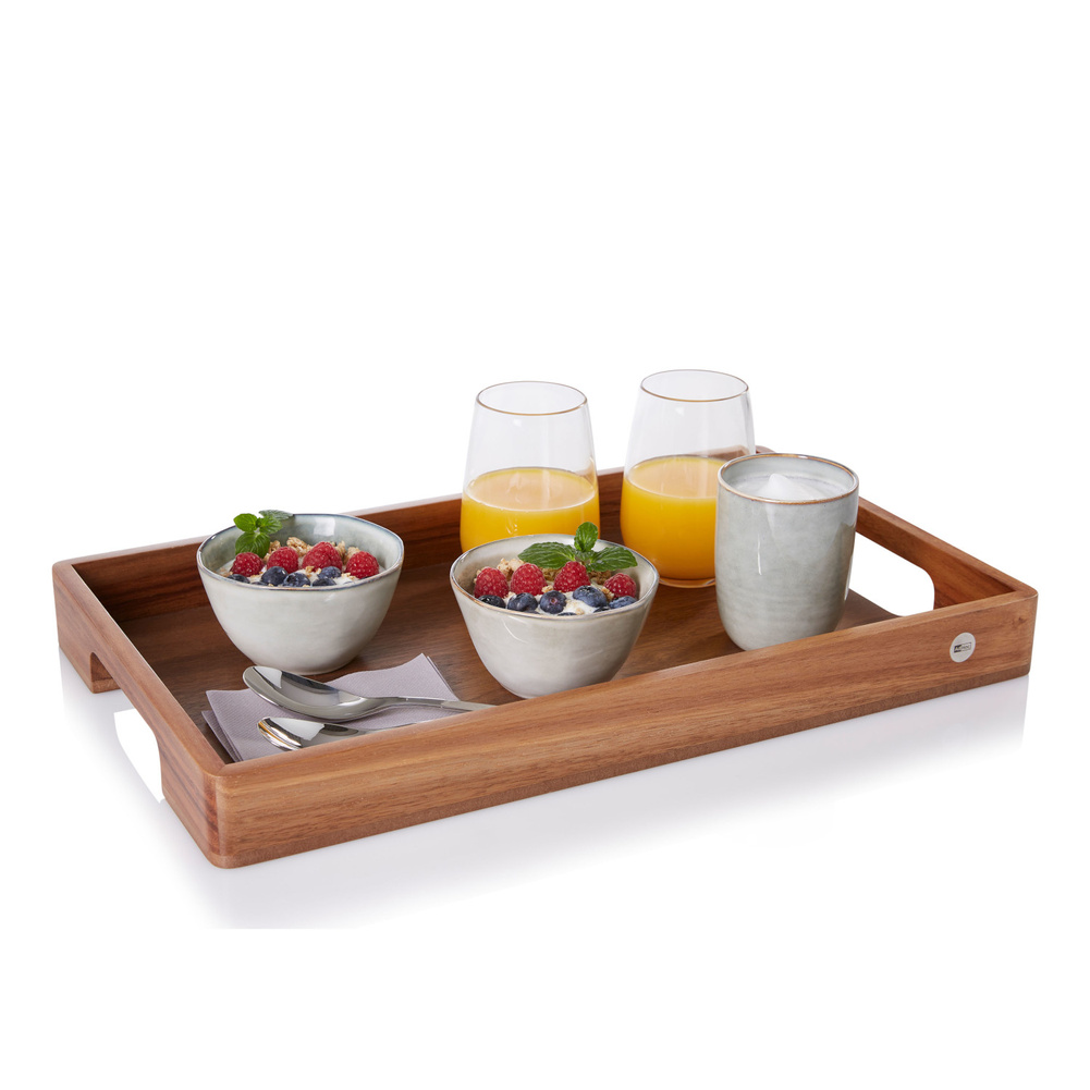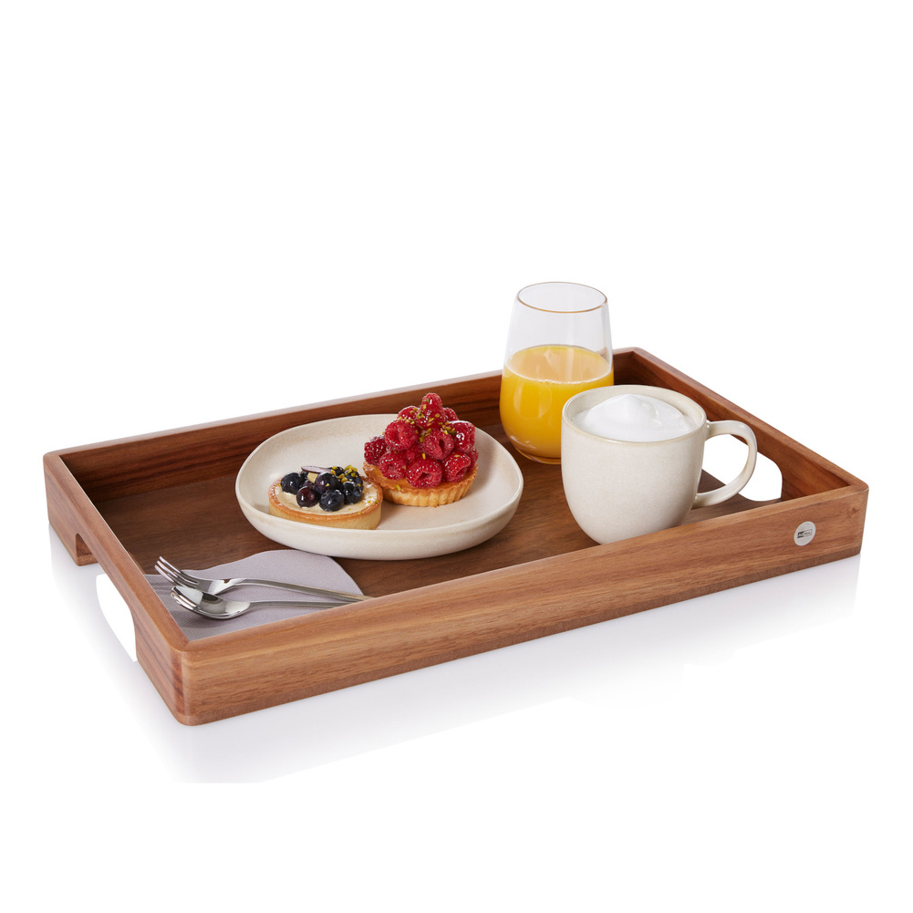 Elegancka taca pomieści talerze o średnicy do 28 cm, a także świetnie nadaje się do serwowania herbaty lub kawy z różnymi dodatkami. Taca pięknie prezentuje koloryt naturalnego drewna a wysokie boki skutecznie zabezpieczają transportowane naczynia. Taca z obu boków ma szerokie wycięcie umożliwiające przenoszenie. Dodatkowy komfort dają zaokrąglone krawędzie. Produkt został zaprojektowany przez AdHoc Design Team. Materiał: boki - drewno akacjowe, spód - płyta w okleinie z drewna orzechowego. Opakowanie: brak.