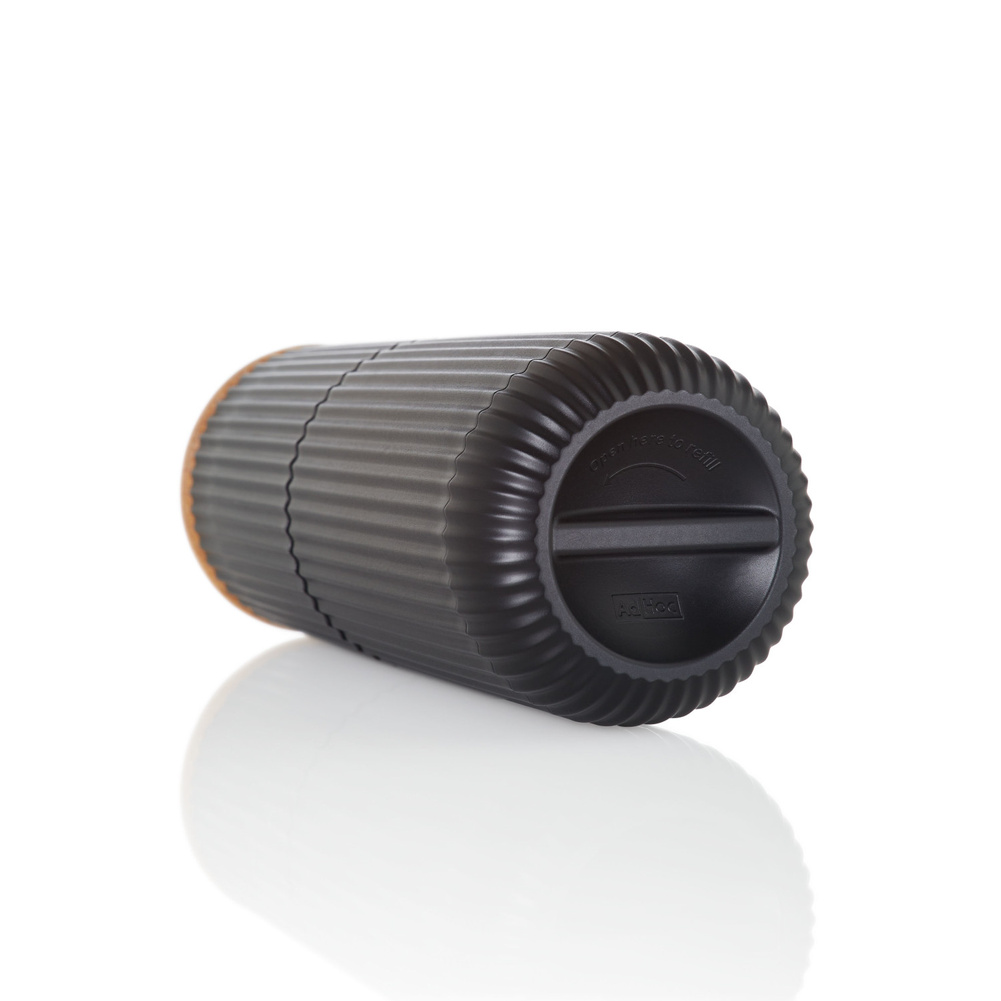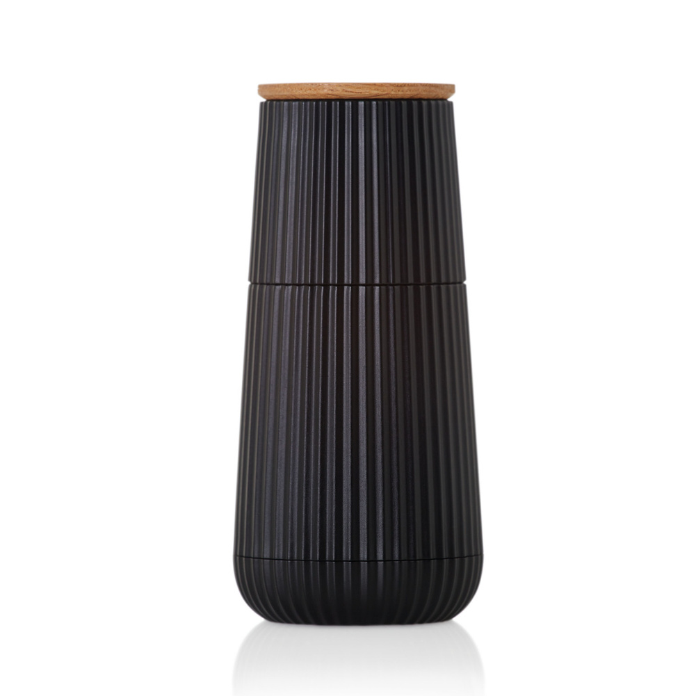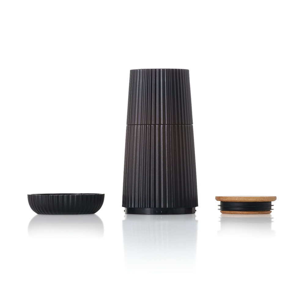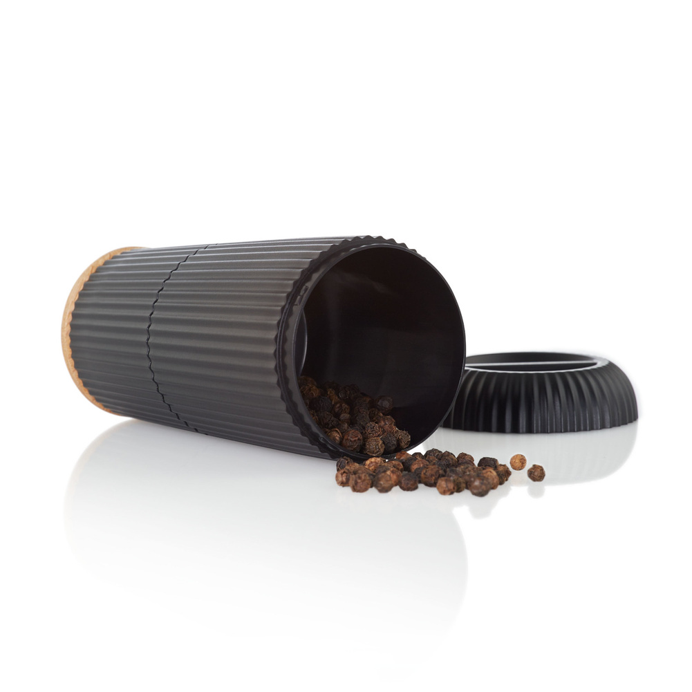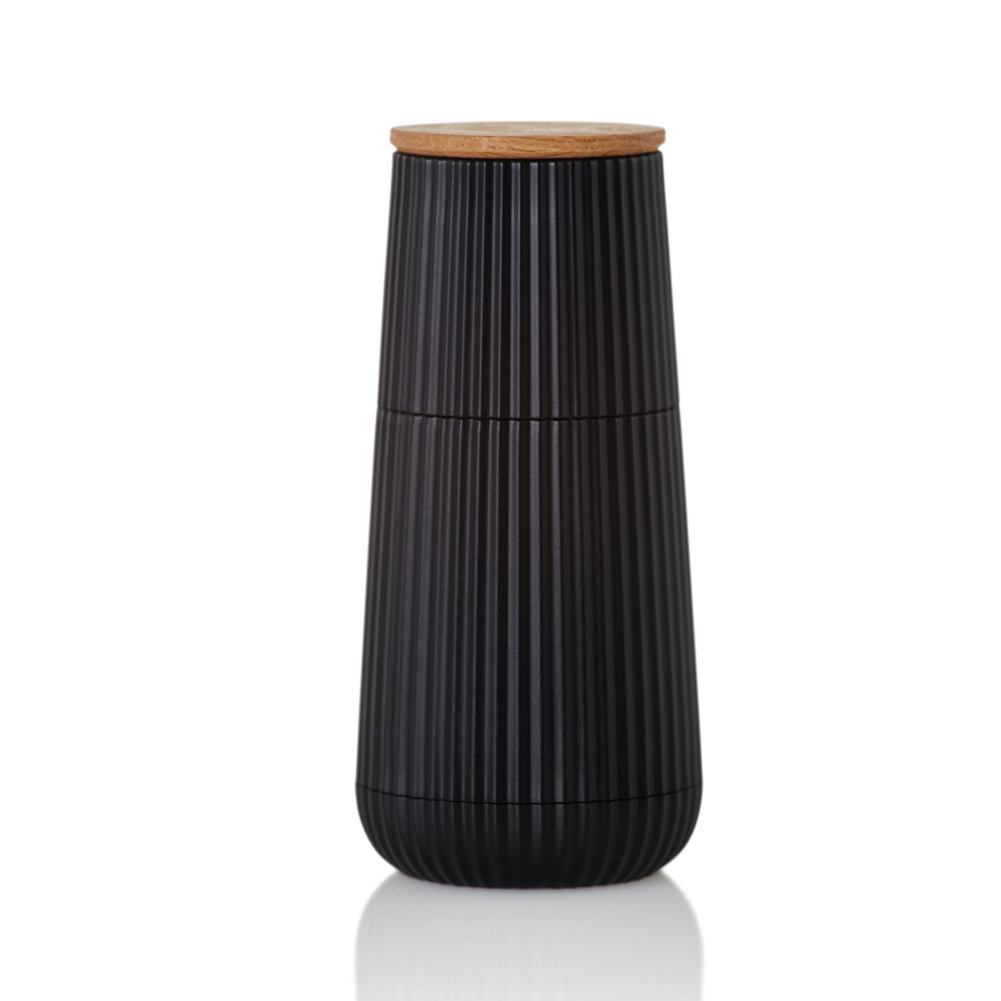 Cała boczna powierzchnia młynka SCAPE pokryta jest tłoczonym, prążkowanym wzorem, co sprawia że młynek nie tylko ciekawie wygląda, ale przede wszystkim pewnie leży w dłoni ułatwiając mielenie nawet najtwardszych przypraw. Młynek dostępny jest w dwóch kolorach: białym i czarnym. Zastosowane w urządzeniu żarna CeraCut® są wydajne, odporne na korozję i zużycie, również nie chłoną zapachów, dzięki czemu zawsze możesz cieszyć się czystym smakiem przypraw. Młynek posiada mechanizm doboru grubości mielenia w pełnej skali od drobnego do grubego rozmiaru. Drewniana pokrywka na górze nie tylko szczelnie chroni przed kurzem żarna, ale ogranicza wietrzenie przypraw. Młynek SCAPE ma spory pojemnik na przyprawy zamykany szeroką pokrywką. Aby napełnić młynek wystarczy przekręcić w przeciwną stronę do ruchu wskazówek zegara zatyczkę o ok. 0,5 cm, aby zwolnić zaczep bagnetowy. Nie zaleca się ubijania przyprawy wewnątrz pojemnika. Do swobodnego zamknięcia młynka niezbędne jest pozostawienie odpowiedniej ilości miejsca w pojemniku na przyprawy. Szczególną uwagę należy zwracać na czystość przypraw. Zanieczyszczenia mogą doprowadzić do uszkodzenia żaren. Pokrętło nad żarnami służy do regulacji grubości mielenia. W celu uzyskania bardziej rozdrobnionej przyprawy należy obracać pokrętłem zgodnie z ruchem wskazówek zegara, a gdy przyprawa powinna być zmielona grubiej należy obracać pokrętłem w przeciwnym kierunku do ruchu wskazówek zegara. Przed przystąpieniem do regulacji konieczne jest sprawdzenie czy pomiędzy żarnami nie zalega przyprawa, mogąca blokować regulację. Uwaga: Nigdy nie miel, jeżeli zbiornik na przyprawy jest pusty, może to doprowadzić do uszkodzenia żaren! Młynek należy czyścić lekko wilgotną, miękka ściereczką. Nigdy nie należy młynka zanurzać w wodzie. Żarna można oczyścić delikatnie szczoteczką. Nie należy myć w zmywarce. Produkt został zaprojektowany przez Rolanda Kreitera. Materiał: tworzywo sztuczne, drewno dębowe, stal nierdzewna, ceramika. Opakowanie: kartonowe pudełko prezentowe.