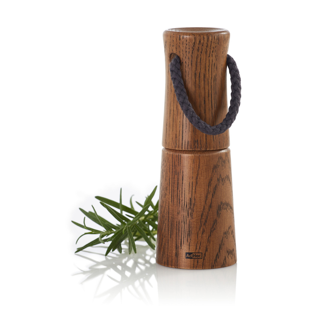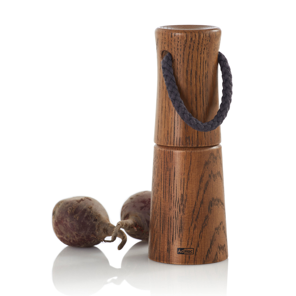 Młynek wykonany z olejowanego drewna dębowego, profilowana obudowa o zaokrąglonych krawędziach przyjemnie leży w dłoni. Bawełniany sznurek zamocowany w pokrywie młynka ułatwia przenoszenie. To udogodnienie docenią w szczególności miłośnicy ogrodowych przyjęć, czy pikników. Jak każdy młynek marki AdHoc, również i ten model, został wyposażony w ceramiczne żarna z płynną regulacją grubości mielenia o szerokim zakresie. Zastosowane w urządzeniu żarna CeraCut® są nie tylko wydajne, ale również odporne na korozję i zużycie. Żarna są obojętne na zapachy, co pozwala cieszyć się za każdym razem czystym smakiem zmielonych przypraw. Dzięki systemowi CAP otwieranie młynka jest łatwe, a napełnienie go przyprawami nie stanowi problemu. Wykorzystany w młynku system PreciseDrive równomiernie podaje przyprawy na żarna, zapewniając tym samym nieprzerwaną ciągłość mielenia aż do wyczerpania zasobnika. Młynek YASO dostępny jest w dwóch rozmiarach: 17cm i 20cm oraz dwóch wersjach drewna olejowanego jasnej i ciemnej. Aby napełnić młynek należy zdjąć górną część delikatnie zsuwając ją z trzpienia. Zaleca się unikać obracania żarnami podczas wykonywania tej czynności, aby nie doprowadzić do ich uszkodzenia. Po zdjęciu górnej części młynka możliwe jest napełnienie pojemnika na przyprawy. Nie zaleca się ubijania przyprawy wewnątrz pojemnika. Do swobodnego zamknięcia młynka niezbędne jest pozostawienie odpowiedniej ilości miejsca w pojemniku na przyprawy. Szczególną uwagę należy zwracać na czystość przypraw. Pewne zanieczyszczenia mogą doprowadzić do uszkodzenia żaren. Dolne pokrętło służy do regulacji grubości mielenia. W celu uzyskania bardziej rozdrobnionej przyprawy należy obracać pokrętłem zgodnie z ruchem wskazówek zegara, a gdy przyprawa powinna być zmielona grubiej należy obracać pokrętłem w przeciwnym kierunku do ruchu wskazówek zegara. Przed przystąpieniem do regulacji konieczne jest sprawdzenie czy pomiędzy żarnami nie zalega przyprawa, mogąca blokować regulację. Uwaga: Nigdy nie miel, jeżeli zbiornik na przyprawy jest pusty, może to doprowadzić do uszkodzenia żaren! Młynek należy czyścić wilgotną, miękka ściereczką. Nigdy nie należy młynka zanurzać w wodzie. Żarna można oczyścić delikatnie szczoteczką. Nie należy myć w zmywarce. Produkt został zaprojektowany przez Roberta Franzhelda. Materiały: naturalne olejowane drewno dębowe, bawełna. Opakowanie: kartonowe pudełko prezentowe.