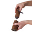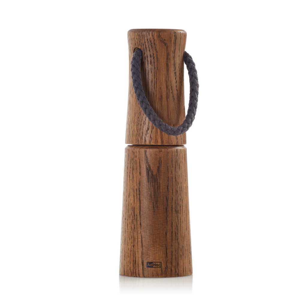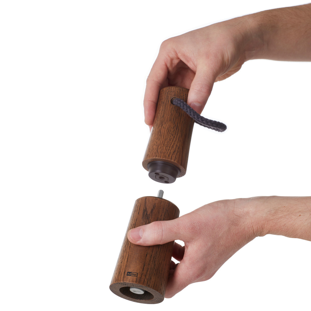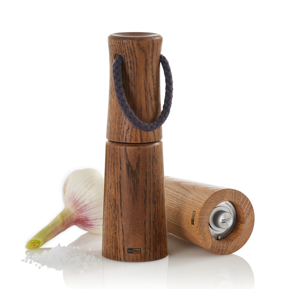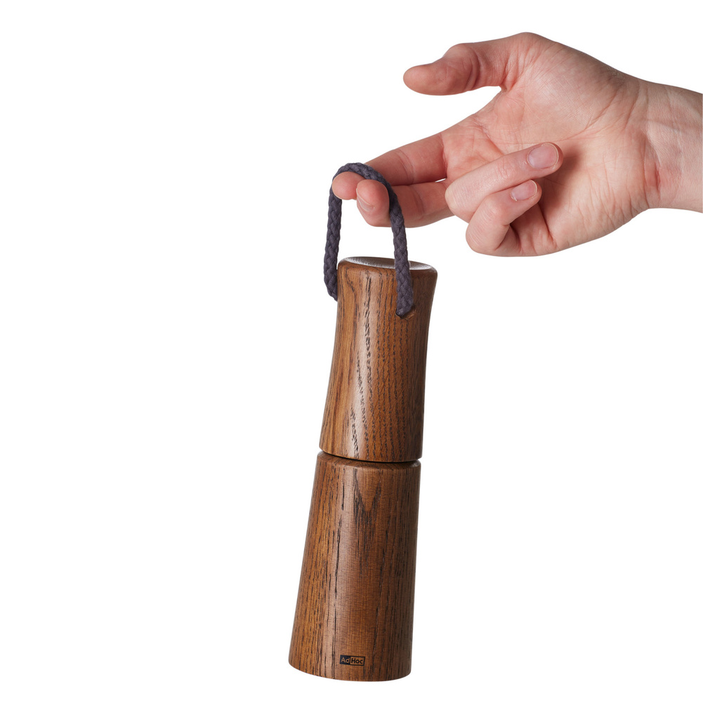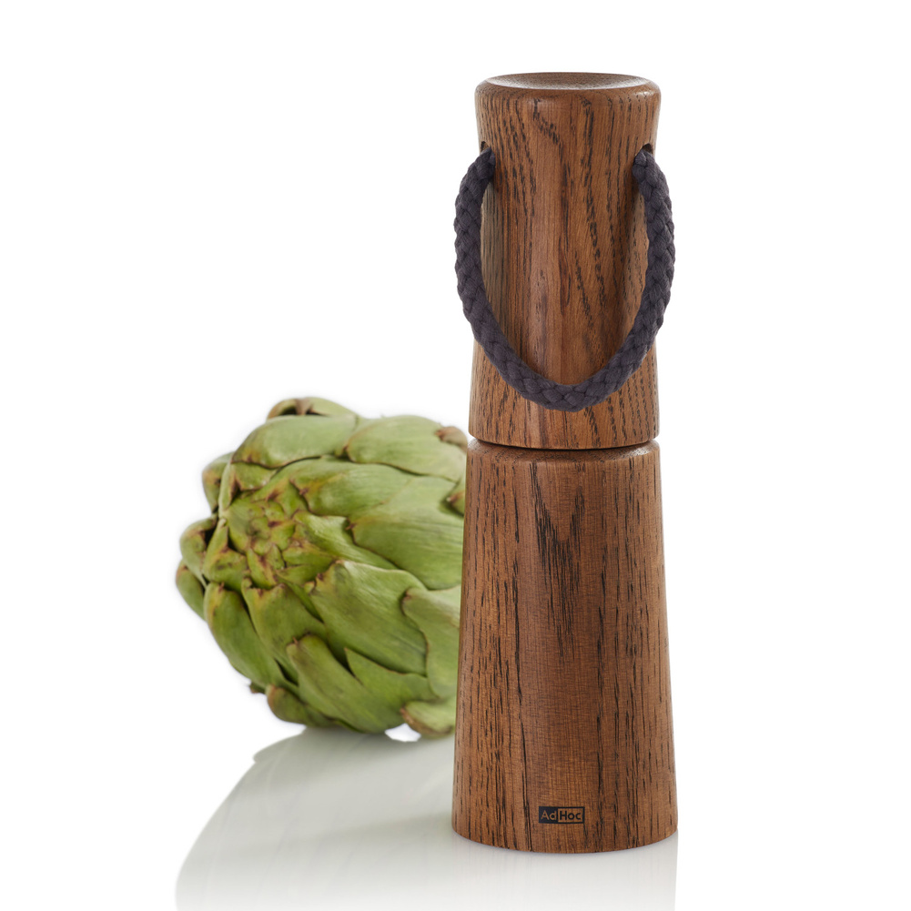Młynek wykonany z olejowanego drewna dębowego, profilowana obudowa o zaokrąglonych krawędziach przyjemnie leży w dłoni. Bawełniany sznurek zamocowany w pokrywie młynka ułatwia przenoszenie. To udogodnienie docenią w szczególności miłośnicy ogrodowych przyjęć, czy pikników. Jak każdy młynek marki AdHoc, również i ten model, został wyposażony w ceramiczne żarna z płynną regulacją grubości mielenia o szerokim zakresie. Zastosowane w urządzeniu żarna CeraCut® są nie tylko wydajne, ale również odporne na korozję i zużycie. Żarna są obojętne na zapachy, co pozwala cieszyć się za każdym razem czystym smakiem zmielonych przypraw. Dzięki systemowi CAP otwieranie młynka jest łatwe, a napełnienie go przyprawami nie stanowi problemu. Wykorzystany w młynku system PreciseDrive równomiernie podaje przyprawy na żarna, zapewniając tym samym nieprzerwaną ciągłość mielenia aż do wyczerpania zasobnika. Młynek YASO dostępny jest w dwóch rozmiarach: 17cm i 20cm oraz dwóch wersjach drewna olejowanego jasnej i ciemnej. Aby napełnić młynek należy zdjąć górną część delikatnie zsuwając ją z trzpienia. Zaleca się unikać obracania żarnami podczas wykonywania tej czynności, aby nie doprowadzić do ich uszkodzenia. Po zdjęciu górnej części młynka możliwe jest napełnienie pojemnika na przyprawy. Nie zaleca się ubijania przyprawy wewnątrz pojemnika. Do swobodnego zamknięcia młynka niezbędne jest pozostawienie odpowiedniej ilości miejsca w pojemniku na przyprawy. Szczególną uwagę należy zwracać na czystość przypraw. Pewne zanieczyszczenia mogą doprowadzić do uszkodzenia żaren. Dolne pokrętło służy do regulacji grubości mielenia. W celu uzyskania bardziej rozdrobnionej przyprawy należy obracać pokrętłem zgodnie z ruchem wskazówek zegara, a gdy przyprawa powinna być zmielona grubiej należy obracać pokrętłem w przeciwnym kierunku do ruchu wskazówek zegara. Przed przystąpieniem do regulacji konieczne jest sprawdzenie czy pomiędzy żarnami nie zalega przyprawa, mogąca blokować regulację. Uwaga: Nigdy nie miel, jeżeli zbiornik na przyprawy jest pusty, może to doprowadzić do uszkodzenia żaren! Młynek należy czyścić wilgotną, miękka ściereczką. Nigdy nie należy młynka zanurzać w wodzie. Żarna można oczyścić delikatnie szczoteczką. Nie należy myć w zmywarce. Produkt został zaprojektowany przez Roberta Franzhelda. Materiały: naturalne olejowane drewno dębowe, bawełna. Opakowanie: kartonowe pudełko prezentowe.