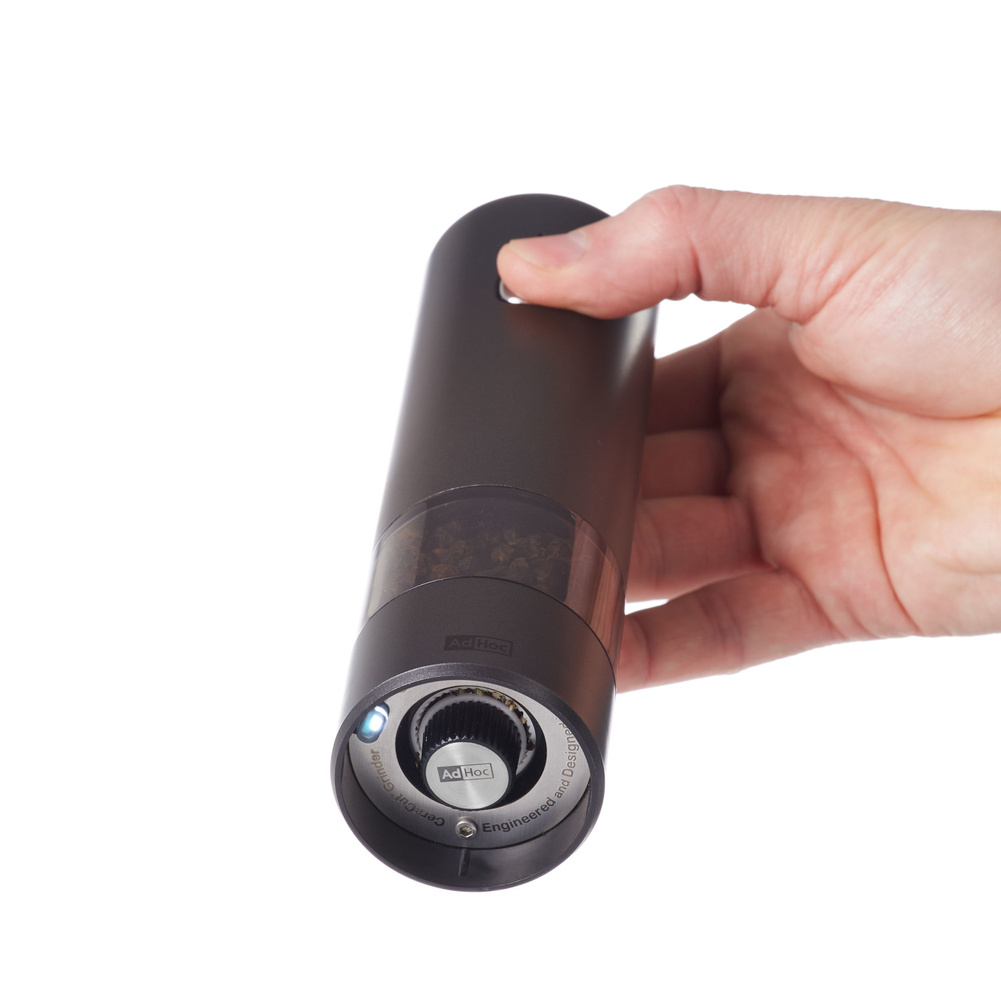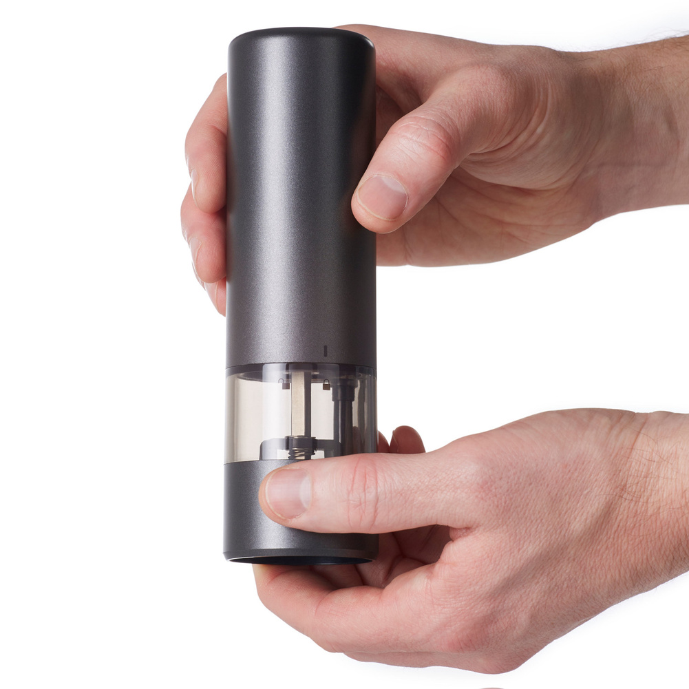 Z akumulatorowym młynkiem i.Mill przyprawisz potrawę za naciśnięciem przycisku używając tylko jednej ręki! Przy pomocy dołączonego do zestawu kabla USB-C bez problemu naładujesz wbudowany litowy akumulator Poziom naładowania wskazuje pojedyncza dioda LED, która miga podczas ładowania. Jedno naładowanie wystarcza na bardzo długo a nawet na kilkaset użyć (w zależności od długości procesu mielenia). Sercem młynka są ceramiczne żarna odporne na korozję i zużycie, które nie chłoną zapachów, dzięki czemu zawsze możesz cieszyć się czystym smakiem przypraw. Żarna są regulowane pokrętłem w szerokim zakresie, a oprócz tego obecna w młynku technologia MicroStep pozwala na precyzyjne dozowanie mielonej przyprawy. Z kolei technologia SilentDrive sprawia, że użytkowanie młynka jest przyjemne dla ucha i wiąże się przede wszystkim z dźwiękiem mielonej przyprawy, podczas gdy silnik pracuje niezwykle cicho. Nie mogło również zabraknąć oświetlenia w postaci diody LED umieszczonej na spodzie młynka obok żaren. Całości dopełnia kapselek szczelnie osłaniający żarna od spodu, chroniący przyprawy przed wietrzeniem, a blat przed zabrudzeniem. Instrukcja: W celu napełnienia pojemnika na przyprawy należy przekręcić górną cześć zgodnie z oznaczeniem i ustawić pionową kreskę na symbolu otwartej kłódki. Następnie należy zdjąć górną część z silniczkiem, odsłaniając pojemnik na przyprawy. Nie zaleca się ubijania przyprawy wewnątrz pojemnika. Do swobodnego zamknięcia młynka niezbędne jest pozostawienie odpowiedniej ilości miejsca w pojemniku na przyprawy. Szczególną uwagę należy zwracać na czystość przypraw. Pewne zanieczyszczenia mogą doprowadzić do uszkodzenia żaren. Przed uruchomieniem młynka konieczne jest upewnienie się, że wszystkie elementy są na miejscu a młynek został poprawnie złożony i zamknięty: pionowa kreska na symbolu zamkniętej kłódki. Wylot przypraw jest otwierany, poprzez zdjęcie zatyczki na spodzie młynka. Aby wybrać grubość mielenia należy młynek odwrócić (przycisk uruchamiający powinien być na dole), upewnić się że żarna są czyste, nie ma zablokowanych kawałków przypraw - delikatnie potrząsnąć, a następnie ustawić grubość mielenia przy pomocy pokrętła pod żarnami. W celu uzyskania bardziej rozdrobnionej przyprawy należy obracać pokrętłem zgodnie z ruchem wskazówek zegara, a gdy przyprawa powinna być zmielona grubiej należy obracać pokrętłem w przeciwnym kierunku do ruchu wskazówek zegara. Jeżeli młynek miele coraz wolniej należy przerwać mielenie, odwrócić młynek wylotem przypraw do góry i lekko potrząsnąć jednocześnie uruchamiając młynek. Twardszy kawałek pieprzu lub soli może blokować żarna. Nie należy myć w zmywarce. Młynek należy czyścić suchą, miękka ściereczką. Nigdy nie należy młynka zanurzać w wodzie. Żarna można oczyścić delikatnie szczoteczką. Produkt został zaprojektowany przez Rolanda Kreitera. Materiały: stal nierdzewna, akryl, żarna ceramika. Opakowanie: kartonowe pudełko prezentowe.