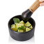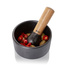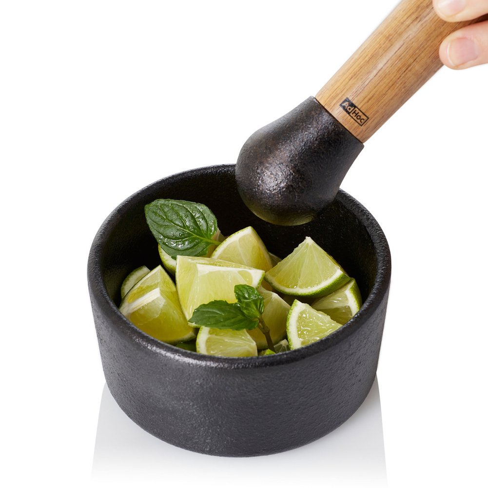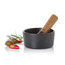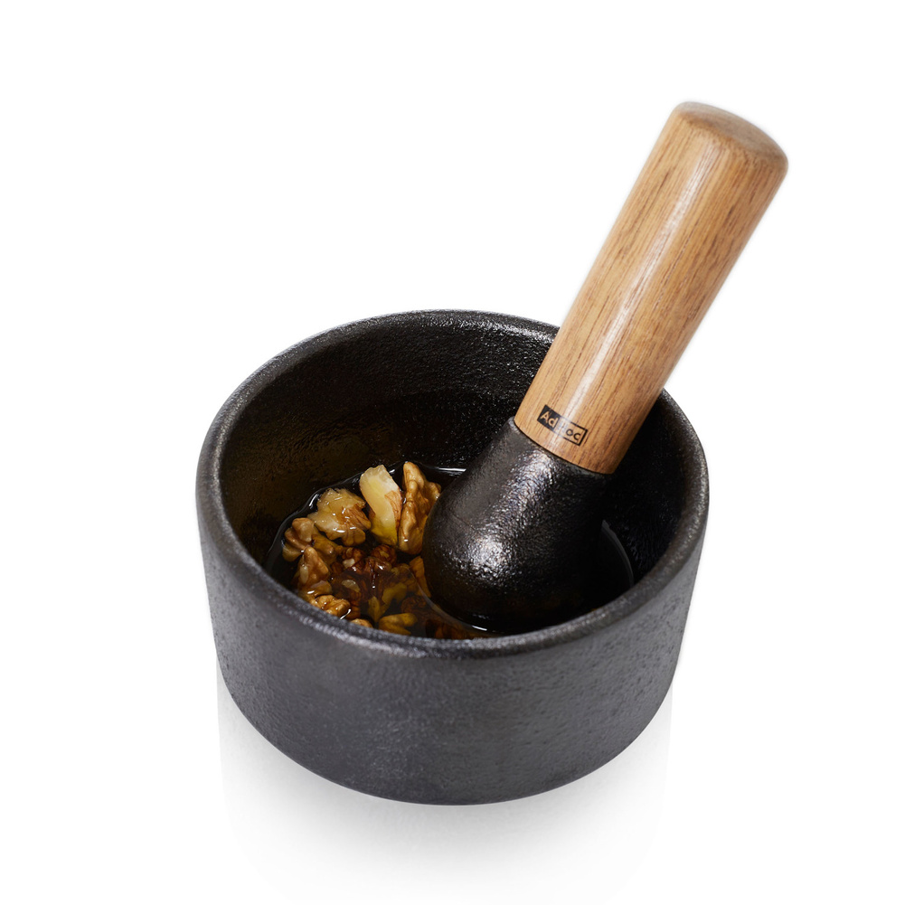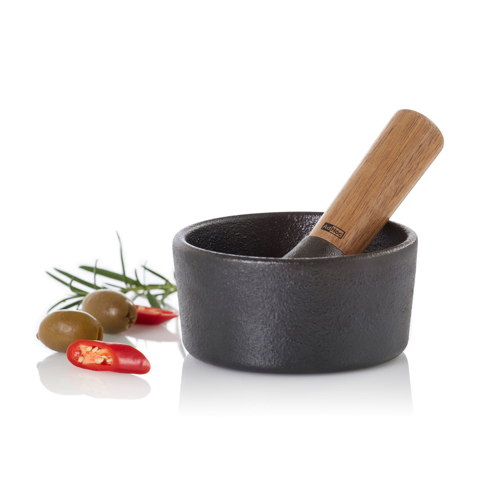 Żeliwny moździerz dzięki znakomitym właściwościom trącym idealnie nadaje się do miażdżenia, ucierania, kruszenia suszonych jak i świeżych ziół oraz przypraw, przyrządzania past lub orzechowych pesto. Kształt miski oraz tłuczka umożliwiają różne sposoby rozdrabniania, które pozwolą wydobyć z miażdżonych składników możliwie jak najbogatszą gamę aromatów i smaków. Duża pojemność około 360ml pozwala na sporą kreatywność w kuchni. Rękojeść została wykonana z wygodnie wyprofilowanego drewna akacjowego, a antypoślizgowe nóżki umieszczone na spodzie miski zapewniają bezpieczną pracą oraz chronią blat przed uszkodzeniami. Produkt został zaprojektowany przez Rolanda Kreitera. Materiały: żeliwo, drewno akacjowe. Opakowanie: kartonowe pudełko prezentowe.