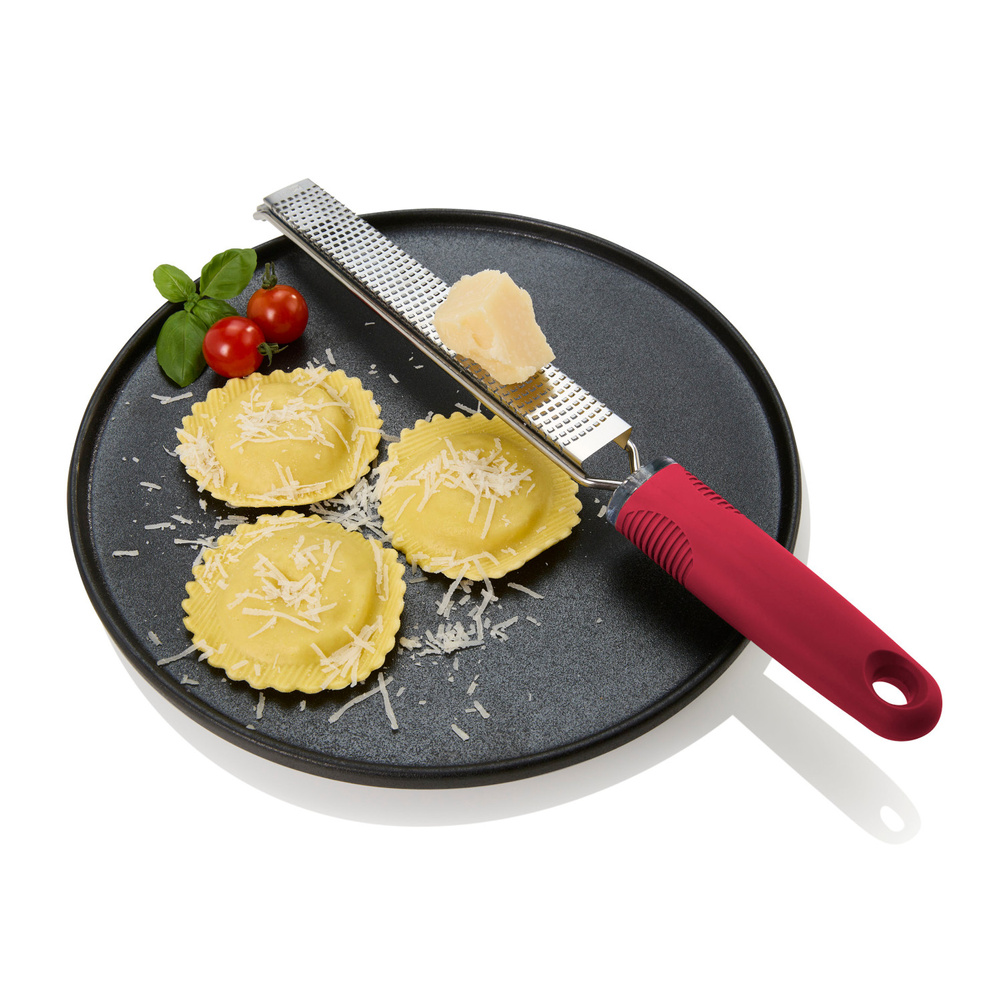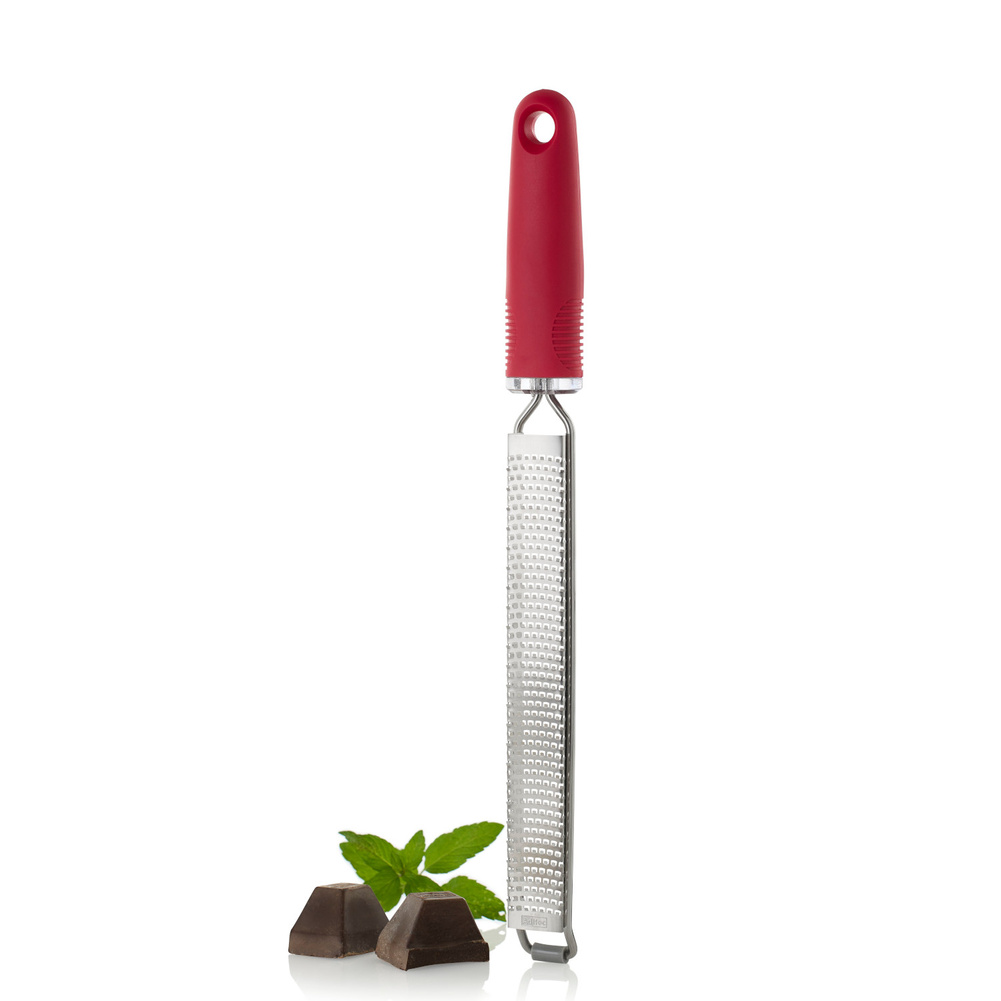 Tarka GIANO posiada 494 fototrawione, ostre jak brzytwa ostrza PreciseGrate ułożone w zakrzywiony sposób, które z łatwością trą tak twarde składniki jak parmezan, czekolada, marchewka i wiele innych! Dzięki tak wysokiej ostrości ostrzy wydajność tarki nie ma sobie równych. Sztywna konstrukcja wykorzystująca ramę okalającą tarkę oraz gumowa antypoślizgowa nakładka, czynią tarkę solidną i pewną w użyciu. Nie należy myć w zmywarce. Produkt został zaprojektowany przez AdHoc Design Team. Materiał: stal nierdzewna, plastik. Opakowanie: kartonowe pudełko prezentowe.