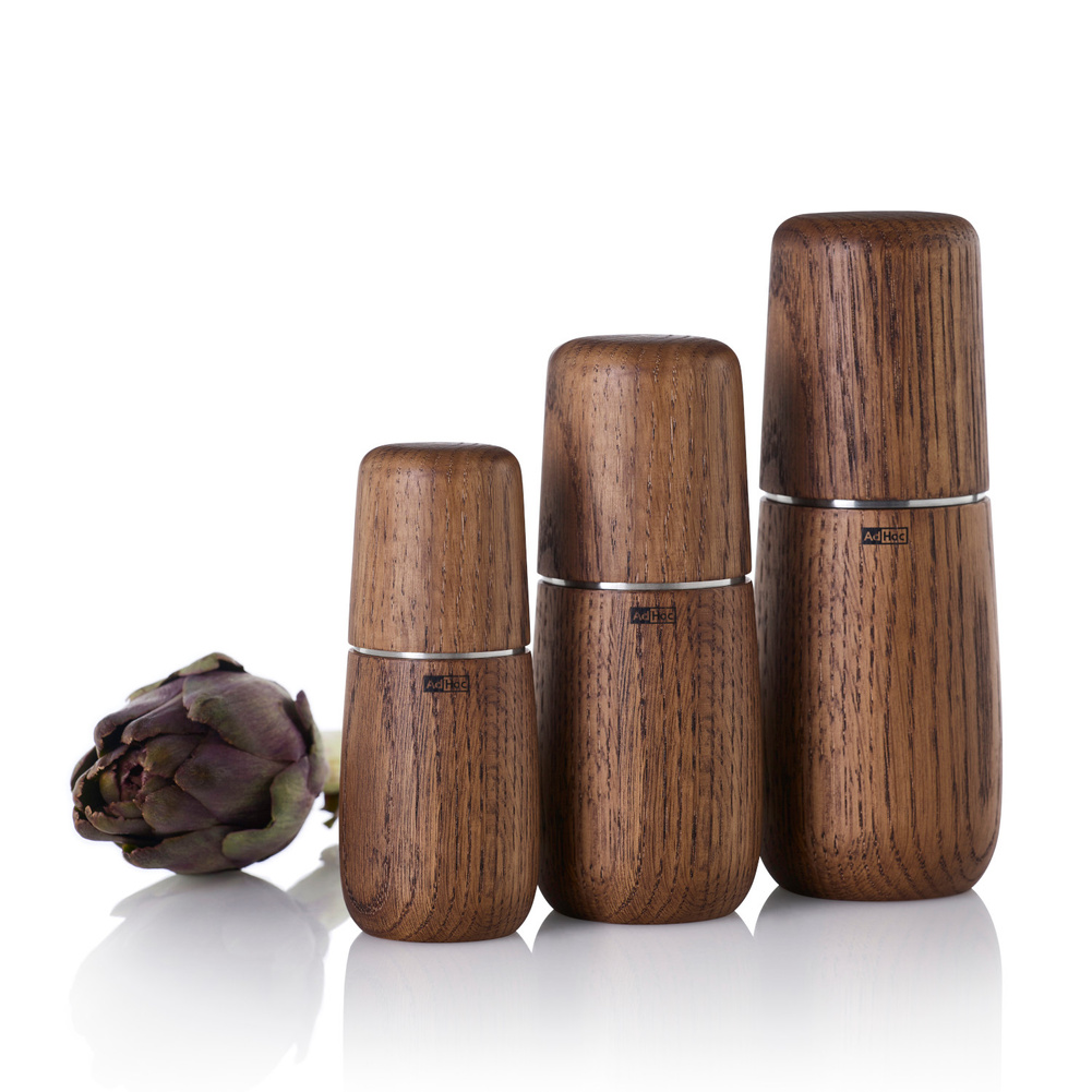 Młynek do pieprzu lub soli z ceramicznymi żarnami CeraCut® o wysokiej wydajności zapewnia idealne mielenie przypraw. Żarna nie chłoną zapachów, dzięki czemu zawsze możesz cieszyć się czystym, niczym niezakłóconym aromatem przypraw. Dodatkowo młynek posiada szeroki, płynny zakres regulacji grubości mielenia od drobnego proszku do grubych kawałków. Zastosowany system CAP ułatwia zdjęcie głowicy i pozwala na łatwe napełnianie młynka. Jego naturalny, opływowy kształt dopasuje się do Twojej dłoni. Młynek dostępny jest w różnych rozmiarach i rodzajach drewna: akacja, jasny i ciemny dąb. Produkt został zaprojektowany przez Roberta Franzhelda. Nie zaleca się ubijania przyprawy wewnątrz pojemnika. Do swobodnego zamknięcia młynka niezbędne jest pozostawienie odpowiedniej ilości miejsca w pojemniku na przyprawy. Szczególną uwagę należy zwracać na czystość przypraw. Pewne zanieczyszczenia mogą doprowadzić do uszkodzenia żaren. Dolne pokrętło służy do regulacji grubości mielenia. W celu uzyskania bardziej rozdrobnionej przyprawy należy obracać pokrętłem zgodnie z ruchem wskazówek zegara, a gdy przyprawa powinna być zmielona grubiej należy obracać pokrętłem w przeciwnym kierunku do ruchu wskazówek zegara. Przed przystąpieniem do regulacji konieczne jest sprawdzenie czy pomiędzy żarnami nie zalega przyprawa, mogąca blokować regulację. Uwaga: Nigdy nie miel, jeżeli zbiornik na przyprawy jest pusty, może to doprowadzić do uszkodzenia żaren!