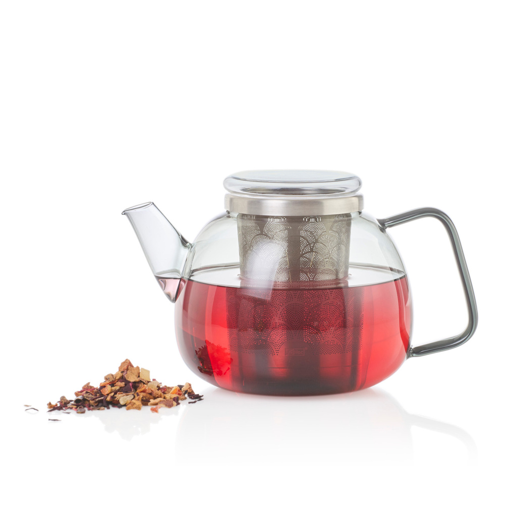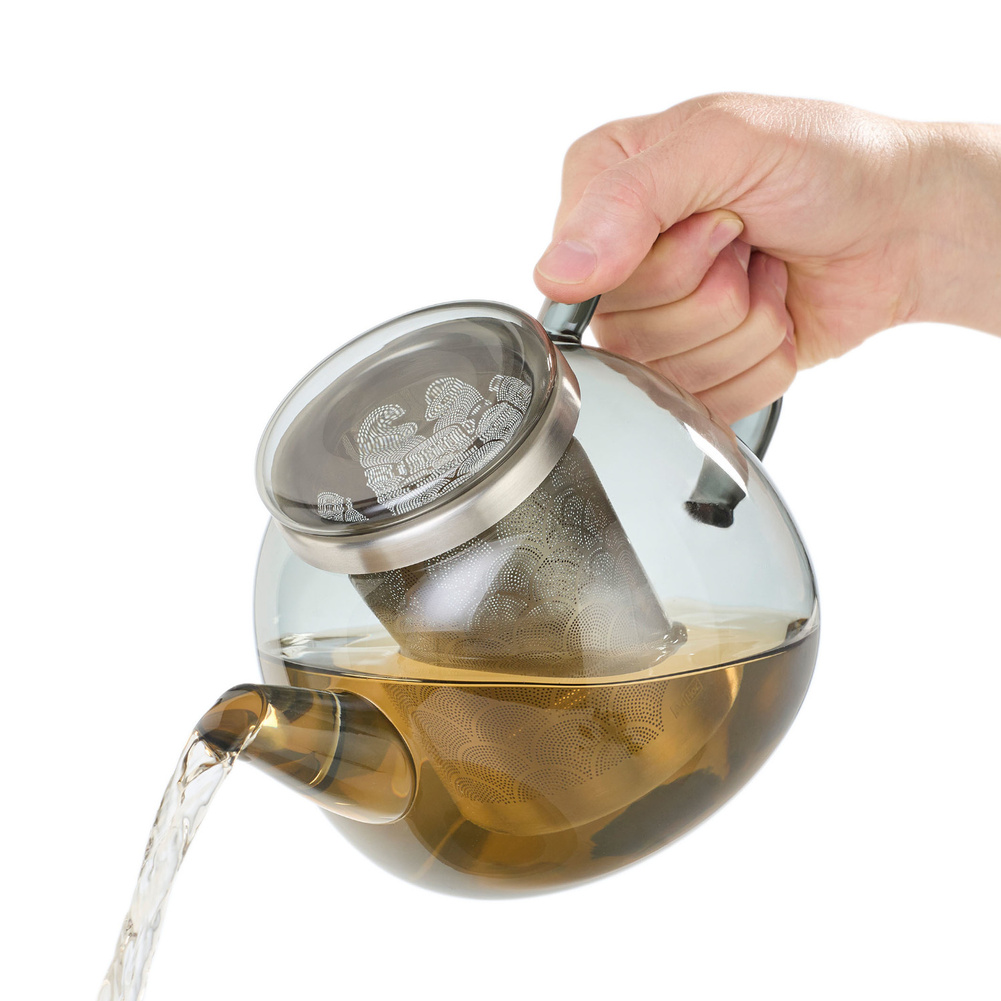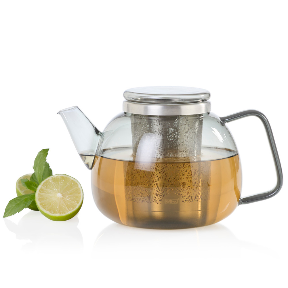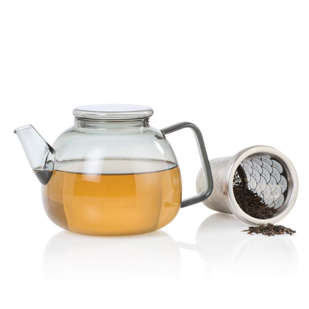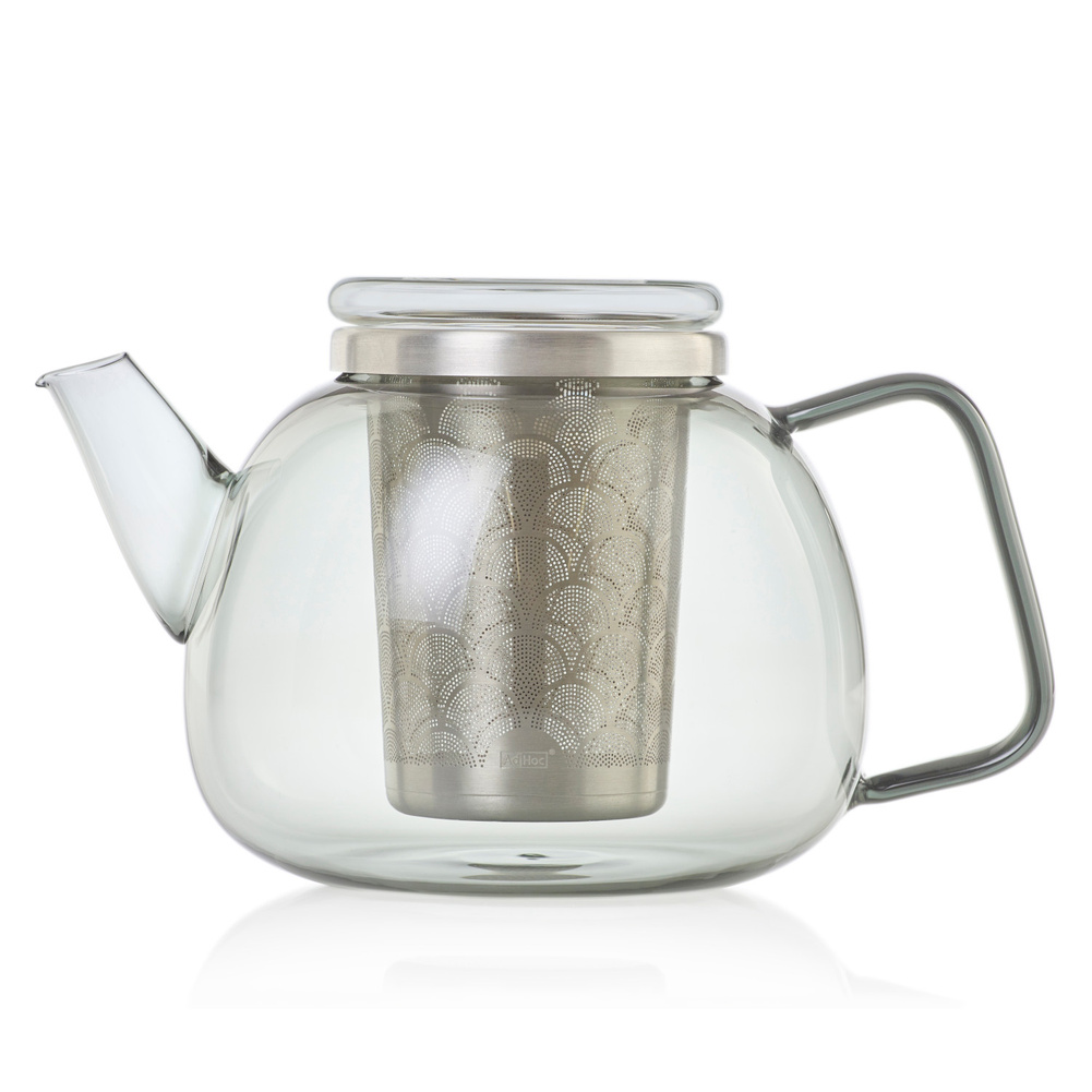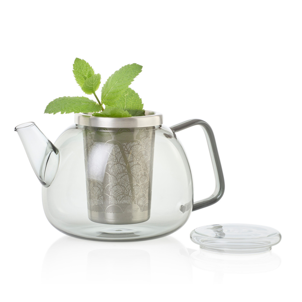 Imbryczek Yuna z przydymionego szkła z dużym filtrem ze stali nierdzewnej, który pozwala liściom herbaty na pełne uwolnienie swojego aromatu. Dzięki zastosowaniu filtra o niezwykle drobnych otworach, możliwe jest stosowanie sypkich herbat i jednocześnie uzyskiwanie bardzo klarownego naparu pozbawionego osadu z herbaty. Korpus imbryczka został wykonany ze szkła dmuchanego, co sprawia, że każdy egzemplarz jest wyjątkowy. Krawędź filtra ze stali nierdzewnej została tak wyprofilowana, aby jeszcze łatwej wyjąć go z imbryczka. Przykrywka imbryczka może służyć również jako podstawka dla stalowego filtra. Czajniczek pasuje do podgrzewacza do Tuto AH-TK48. Produkt został zaprojektowany przez Rolanda Kreitera. Materiał: szkło dmuchane borokrzemowe, stal nierdzewna. Przybliżone wymiary imbryczka: wysokość - 13cm, średnica korpusu czajniczka - 15cm, średnica z dzióbkiem i uchem - 23cm. Pojemność: 1,2L. Przybliżone wymiary filtra: wysokość - 11cm, średnica - 8,5cm. Przybliżone wymiary brutto: wysokość - 16 cm, długość - 21,5cm, szerokość - 19,2cm. Przybliżona waga brutto: 0,690kg. Opakowanie: kartonowe pudełko prezentowe.