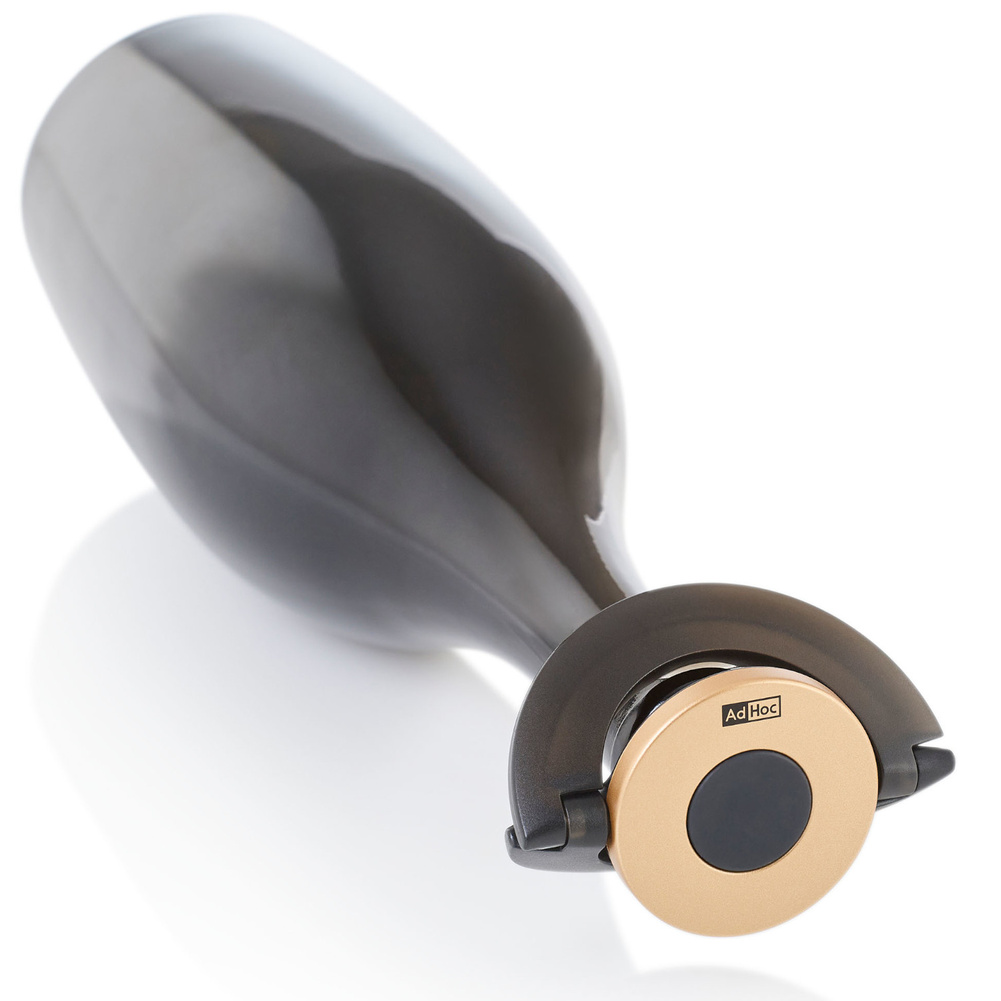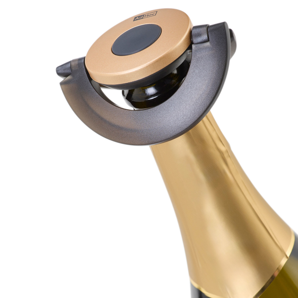 Korek do szampana Gusto czarno-złoty wyjątkowo niski i płaski, idealnie sprawdza się, kiedy trzeba przechować otwartą butelkę szampana w lodówce! Silikonową uszczelkę blokujesz na szyjce butelki za pomocą ruchomych półokręgów - uch, całkowicie ją uszczelniając. Idealny do przechowywania butelki w drzwiach lodówki. Sprawdzi się do butelek szampana, wina musującego i crémant. Produkt został zaprojektowany przez AdHoc Design Team. Materiał: plastik oraz silikon. Przybliżone wymiary: wysokość - 1,7cm, średnica - 8,2cm. Przybliżone wymiary brutto: wysokość - 8,2cm, długość - 8,2cm, szerokość - 2cm. Przybliżona waga brutto: 0,056kg. Opakowanie: kartonowe pudełko prezentowe.