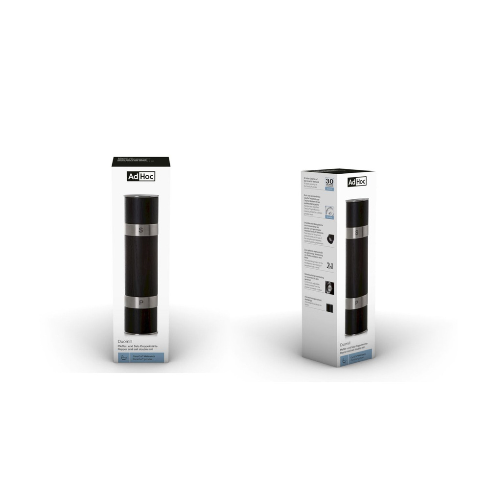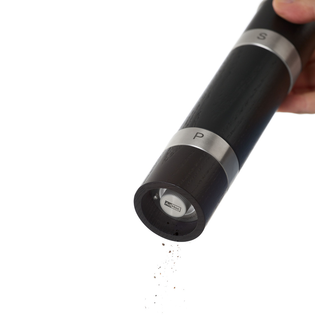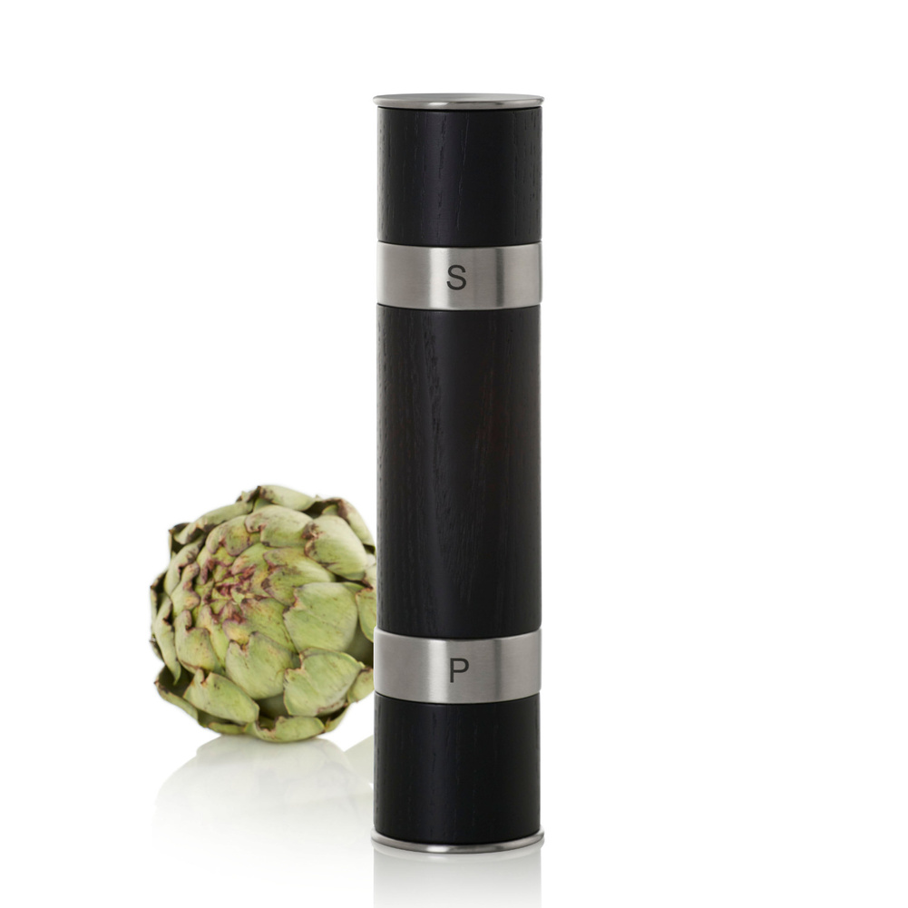 Młynek do pieprzu/soli podwójny DUOMILL czarny, który umożliwia mielenie z jednej strony pieprzu, a z drugiej soli. Młynek został wykonany z drewna akacjowego ze stalowymi elementami. Całość prezentuje się wyjątkowo elegancko. Duży rozmiar młynka sprawia, że urządzenie pewnie leży w dłoni. Zastosowane w urządzeniu żarna CeraCut® są nie tylko wydajne, odporne na korozję i zużycie, ale nie chłoną zapachów. Z obu stron znajdują się stalowe zatyczki z silikonowym kołnierzem, co ułatwia utrzymanie blatu w czystości i spowalnia proces wietrzenia. Nie należy ubijać przyprawy wewnątrz pojemnika. Pozostaw przestrzeń na górze pojemnika, aby móc swobodnie go zamknąć. Zwracaj uwagę na jakość przypraw, szczególnie czy nie są zanieczyszczone. Aby wybrać grubość mielenia należy młynek odwrócić, upewnić się że żarna są czyste, nie ma zablokowanych kawałków przypraw - delikatnie potrząsnąć, a następnie ustawić grubość mielenia. W celu uzyskania bardziej rozdrobnionej przyprawy należy obracać pokrętłem zgodnie z ruchem wskazówek zegara, a gdy przyprawa powinna być zmielona grubiej należy obracać pokrętłem w przeciwnym kierunku do ruchu wskazówek zegara. Przed przystąpieniem do regulacji konieczne jest sprawdzenie czy pomiędzy żarnami nie zalega przyprawa, mogąca blokować regulację. Uwaga: nie należy mielić, jeżeli zbiornik na przyprawy jest pusty, może to doprowadzić do uszkodzenia żaren! Konserwacja: należy czyścić miękką, suchą ściereczką, nie należy urządzenia zamoczyć. Materiał: drewno akacjowe, stal nierdzewna, ceramiczne żarna CeraCut®. Przybliżone wymiary: wysokość - 23cm, średnica - 5,4cm. Przybliżone wymiary brutto: wysokość - 23,5cm, długość - 6,3cm, szerokość - 6,3cm. Przybliżona waga brutto: 0,390kg. Opakowanie: kartonowe pudełko prezentowe.