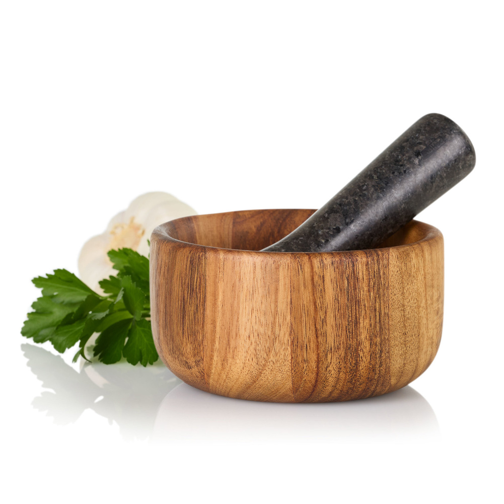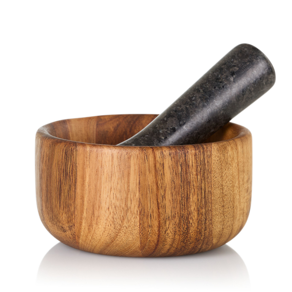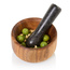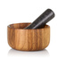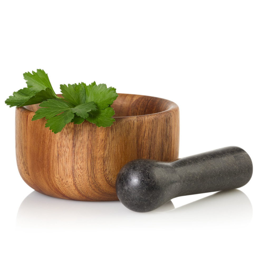 Moździerz Taru o pojemności 360ml, która rozbudzi kuchenną kreatywność. Wykonany z naturalnych materiałów ułatwi miażdżenie i ścieranie zarówno wysuszonych jak i świeżych ziół oraz przypraw, uwalniając pełnię smaków. Kształt tłuczka oraz misy są idealnie dopasowane, aby umożliwić wszechstronne użytkowanie. Miska została wykonana z antybakteryjnego drewna akacjowego, natomiast tłuczek z neutralnego smakowo granitu. Produkt został zaprojektowany przez Rolanda Kreitera. Materiał: miska drewno akacjowe, granit. Przybliżone wymiary miski: średnica - 13,2cm, wysokość - 6cm. Przybliżone wymiary tłuczka: średnica - 4cm, wysokość - 14cm. Przybliżone wymiary brutto: wysokość - 12,2cm, długość - 13,6cm, szerokość - 13,7cm. Przybliżona waga brutto: 0,745kg. Opakowanie: kartonowe pudełko prezentowe.