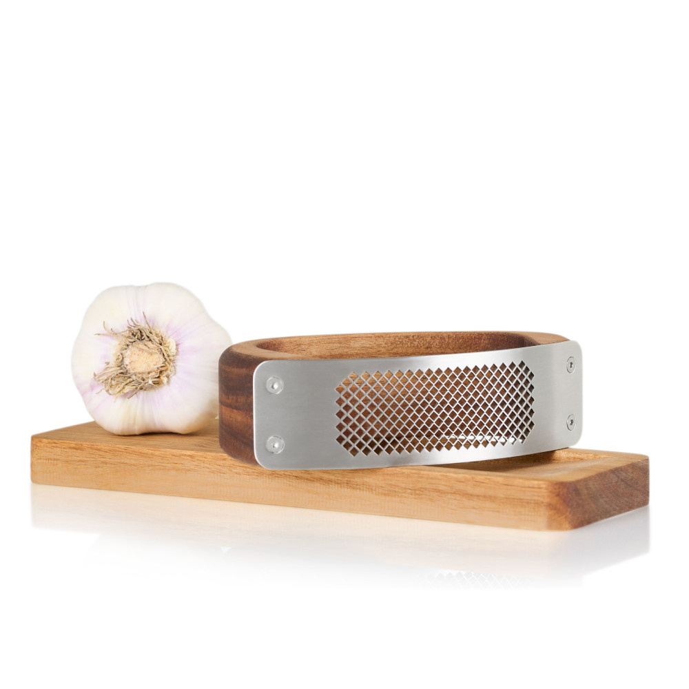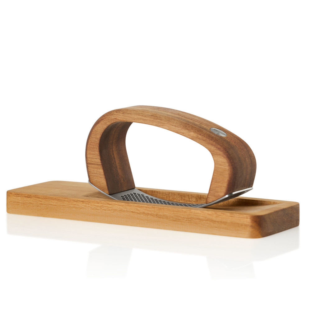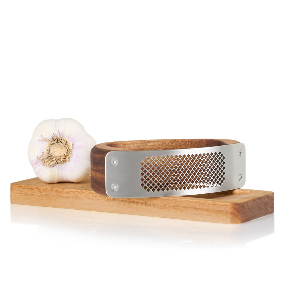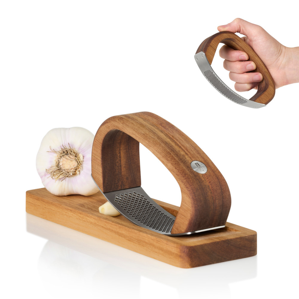 RoccaAlio to nowa propozycja rozdrabniania czosnku. Narzędzie składa się z szerokiego ostrza z ergonomicznym uchwytem oraz solidnej akacjowej deski z wgłębieniem ułatwiającym przeciskanie ząbków czosnku. Ostrze zostało laserowo wycięte i pozwala na równomierne rozdrobnienie czosnku, uwalniając pełnię smaku. Antybakteryjność drewna akacjowego czyni je szczególnie odpowiednim do kontaktu z jedzeniem. Produkt został zaprojektowany przez Roberta Franzhelda. Nie należy myć w zmywarce. Materiał: drewno akacjowe, stal nierdzewna. Przybliżone wymiary całości: wysokość - 9cm, długość - 24cm, szerokość - 7,6cm. Przybliżone wymiary ostrza z uchwytem: wysokość - 7,5cm, długość - 14,2cm, szerokość - 4cm, wymiary powierzchni do przeciskania: 8,5cm x 3,5cm. Przybliżone wymiary podstawki: wysokość - 1,8cm, długość - 24cm, szerokość - 7,6cm. Przybliżone wymiary brutto: wysokość - 24,5cm, długość - 10cm, szerokość - 8,3cm. Przybliżona waga brutto: 0,348kg. Opakowanie: kartonowe pudełko prezentowe.