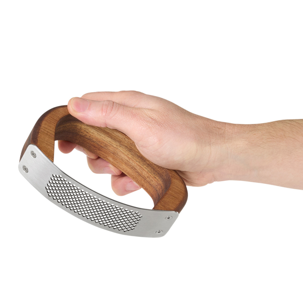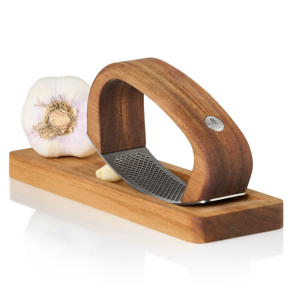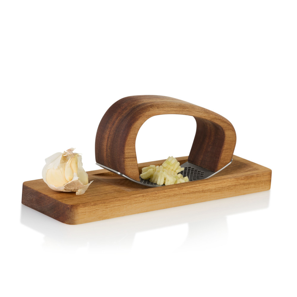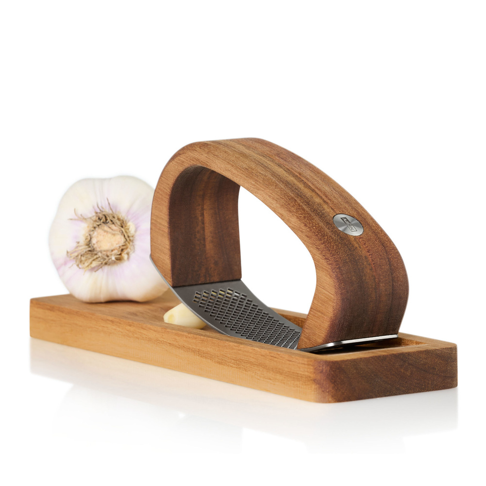 RoccaAlio to nowa propozycja rozdrabniania czosnku. Narzędzie składa się z szerokiego ostrza z ergonomicznym uchwytem oraz solidnej akacjowej deski z wgłębieniem ułatwiającym przeciskanie ząbków czosnku. Ostrze zostało laserowo wycięte i pozwala na równomierne rozdrobnienie czosnku, uwalniając pełnię smaku. Antybakteryjność drewna akacjowego czyni je szczególnie odpowiednim do kontaktu z jedzeniem. Produkt został zaprojektowany przez Roberta Franzhelda. Nie należy myć w zmywarce. Materiał: drewno akacjowe, stal nierdzewna. Przybliżone wymiary całości: wysokość - 9cm, długość - 24cm, szerokość - 7,6cm. Przybliżone wymiary ostrza z uchwytem: wysokość - 7,5cm, długość - 14,2cm, szerokość - 4cm, wymiary powierzchni do przeciskania: 8,5cm x 3,5cm. Przybliżone wymiary podstawki: wysokość - 1,8cm, długość - 24cm, szerokość - 7,6cm. Przybliżone wymiary brutto: wysokość - 24,5cm, długość - 10cm, szerokość - 8,3cm. Przybliżona waga brutto: 0,348kg. Opakowanie: kartonowe pudełko prezentowe.