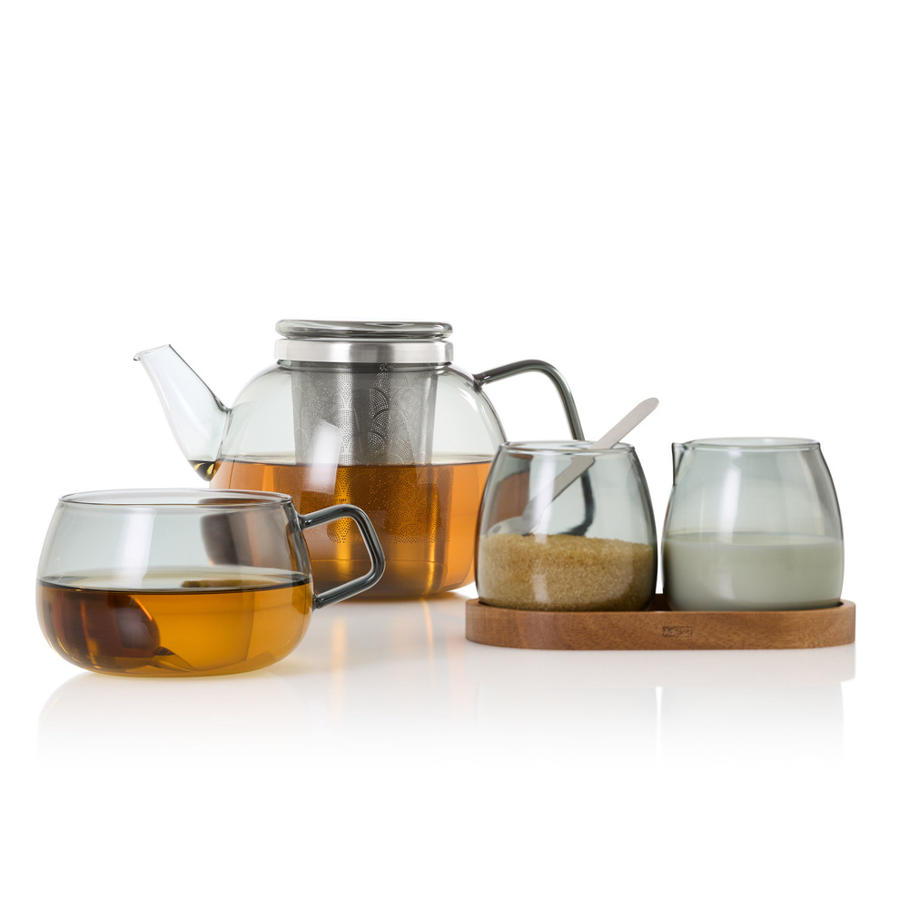Każdy egzemplarz filiżanki Yuna jest wyjątkowy, ponieważ został wykonany z odpornego na gorąco, dmuchanego szkła borokrzemowego. Gładka powierzchnia szkła brokrzmowego nie wchodzi w reakcję z zawartością filiżanki co oznacza, że nie przechodzi smakiem ani zapachem. Jest to całkowicie neutralny materiał. Filiżanki Yuna nawiązują, swoim kształtem i przydymionym kolorem do innych przedmiotów z linii Yuna, w której można znaleźć imbryk, cukiernicę z mlecznikiem czy lampiony. Skandynawski charakter i zaokrąglony kształt filiżanek sprawia, że wygodnie spoczywają w dłoni, a ich 400 mililitrowa pojemność pomieści herbatę, kawę, desery, a nawet zupę. Produkt został zaprojektowany przez Rolanda Kreitera. Można myć w zmywarce. Przybliżone wymiary pojedynczej filiżanki: wysokość - 6,5cm, średnica bez ucha - 10cm, średnica z uchem - 12,5cm, pojemność - 400ml. Przybliżone wymiary brutto: wysokość - 13,5cm, długość - 25,5cm, szerokość -14cm. Przybliżona waga brutto: 0,399kg. Opakowanie: kartonowe pudełko prezentowe.