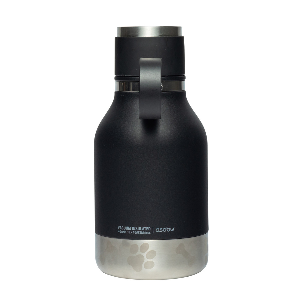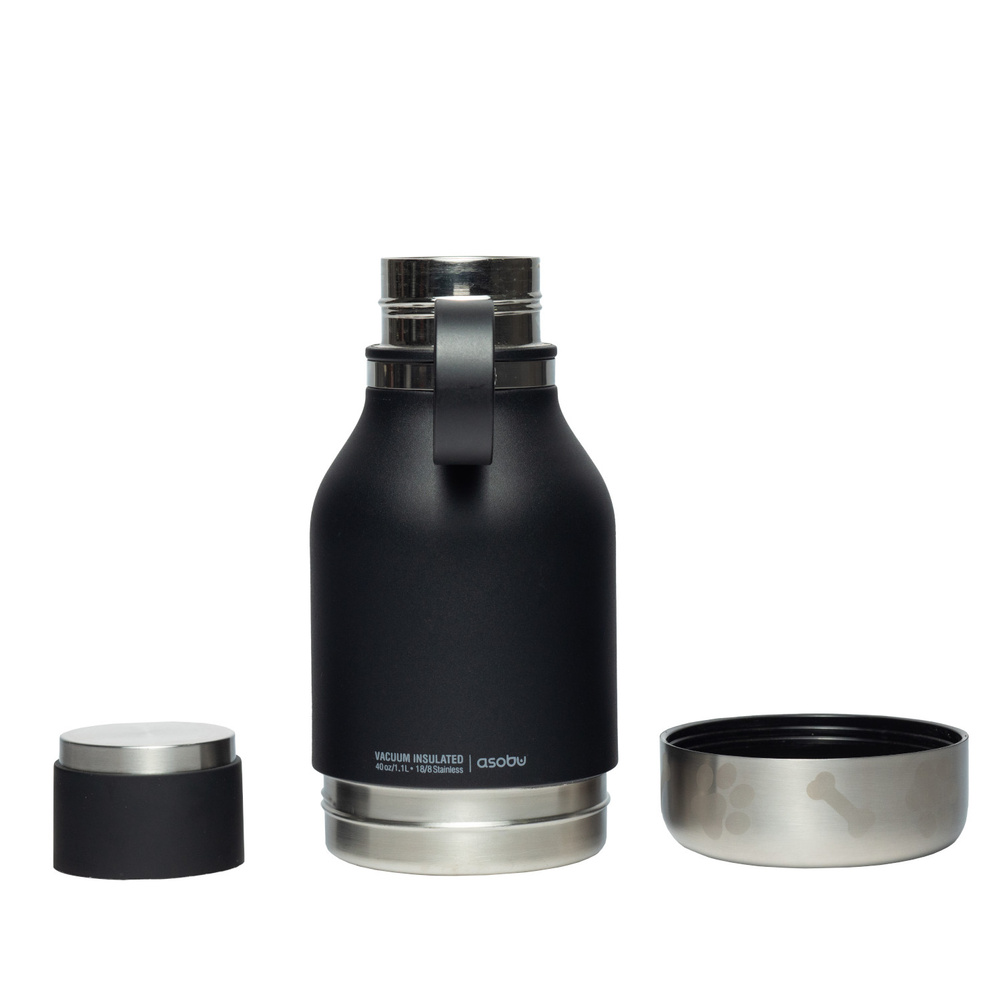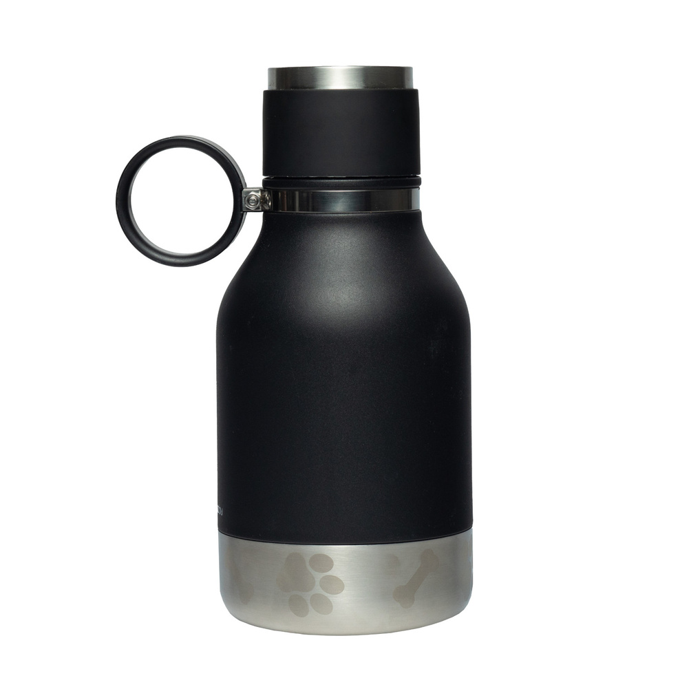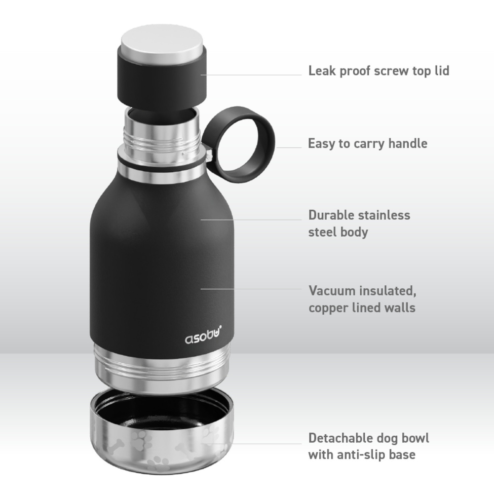 Duża, stalowa butelka na wodę o pojemności 975ml z miską dla pupila i wygodnym uchwytem. Dzielenie się oznacza troskę, a z butelką ASOBU napojenie naszego pupila jest łatwiejsze niż kiedykolwiek wcześniej. Izolowana próżniowo butelka ze stali nierdzewnej utrzymuje idealnie schłodzoną wodę przez wiele godzin, a odkręcana miska sprawia, że dzielenie się wodą z najlepszym przyjacielem jest proste i przyjemne. Szczelna zakrętka, trwała konstrukcja i ułatwiający przenoszenie uchwyt zachęcają do jeszcze dłuższych spacerów. Miska ma antypoślizgowe dno, na zewnątrz jest stalowa, wewnątrz wyścielona tworzywem. W trosce o środowisko i zdrowie produkty ASOBU wykonane są z trwałych i bezpiecznych materiałów jak stal nierdzewna 18/8, tritan i tworzywa BPA FREE. Tworzywo BPA Free oznacza, że jest bezpieczne i wolne od szkodliwych substancji. Dwuścienna konstrukcja butelek/termosów nie tylko dłużej utrzymuje temperaturę, ale też zapobiega kondensacji. Dwuścienne ścianki wewnątrz są pokryte dodatkowo miedzią dla jeszcze lepszej izolacji. Zalecenia: - Przed pierwszym użyciem umyj wszystkie elementy naczynia ręcznie. - Przed napełnieniem, zimnym lub gorącym płynem zaleca się butelkę przepłukać odpowiednio zimną lub gorącą wodą. - Pij ostrożnie z butelki szczególnie jeśli została napełniona gorącym płynem! Uwaga: 1. Produkt nie jest odpowiedni dla dzieci. 2. Nie należy zamrażać lub podgrzewać butelki/termosu na płytach kuchennych, w piekarniku lub kuchence mikrofalowej, butelka służy do napełniania płynem i nie jest odpowiednim naczyniem do podgrzewania lub zamrażania. 3. Nie należy wlewać napojów gazowanych, produktów mlecznych i żywności dla dzieci ze względu na ryzyko rozwoju bakterii. 4. Nie należy umieszczać kostek lodu wewnątrz. 5. Butelka nie służy do przechowywania wody, czy innych płynów dłużej niż 24 godziny. 6. Wszystkie elementy butelek/termosów należy myć ręcznie, gąbką i płynem do naczyń. Umyte naczynie należy dokładnie osuszyć i pozostawić do doschnięcia w suchym dobrze wentylowanym miejscu. 7. Nie należy stosować agresywnych środków czyszczących takich jak chlor, wybielacz czy też soda. Materiał: stal nierdzewna 18/8, tworzywo BPA Free, silikon, miedź. Przybliżone wymiary całości: wysokość - 24cm, średnica z uchem - 15cm, średnica dół - 11cm. Pojemność: 975ml. Przybliżone wymiary miski: wysokość - 4,3m, średnica - 11cm. Pojemność miski: 360ml. Przybliżone wymiary brutto: wysokość - 25cm, długość - 13cm, szerokość - 12,7cm. Przybliżona waga brutto: 0,734kg. Opakowanie: kartonowe pudełko prezentowe.