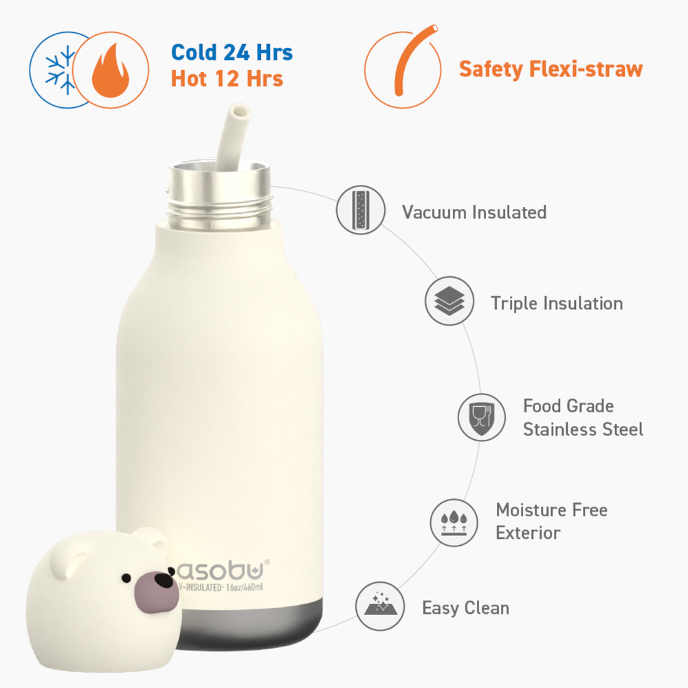 Szukasz zabawnej i funkcjonalnej butelki na wodę dla swojego malucha? Butelka Asobu z linii Bestie to urocza butelka na wodę dla dzieci ze stali nierdzewnej z różnymi główkami na zakrętce! Butelkę pokrywa na zewnątrz tworzywo typu SOFT TOUCH, co sprawia, że butelka jest przyjemna w dotyku. Wewnątrz butelki znajduje się wyjmowana słomka z miękkim ustnikiem. Na spodzie butelki koło z antypoślizgowego silikonu. Butelka przeznaczona jest dla dzieci od 4 roku życia. W trosce o środowisko i zdrowie produkty ASOBU wykonane są z trwałych i bezpiecznych materiałów jak stal nierdzewna, tritan i tworzywa BPA FREE. Tworzywo BPA Free oznacza, że jest bezpieczne i wolne od szkodliwych substancji. Dwuścienna konstrukcja butelek/termosów nie tylko dłużej utrzymuje temperaturę, ale też zapobiega kondensacji. Dwuścienne ścianki wewnątrz są pokryte dodatkowo miedzią dla jeszcze lepszej izolacji. Zalecenia: - Przed pierwszym użyciem umyj wszystkie elementy naczynia ręcznie. - Przed napełnieniem, zimnym lub gorącym płynem zaleca się butelkę przepłukać odpowiednio zimną lub gorącą wodą. - Pij ostrożnie z butelki szczególnie jeśli została napełniona gorącym płynem! Uwaga: 1. Nie należy zamrażać lub podgrzewać butelki/termosu na płytach kuchennych, w piekarniku lub kuchence mikrofalowej, butelka służy do napełniania płynem i nie jest odpowiednim naczyniem do podgrzewania lub zamrażania. 2. Nie należy wlewać napojów gazowanych, produktów mlecznych i żywności dla dzieci ze względu na ryzyko rozwoju bakterii. 3. Nie należy umieszczać kostek lodu wewnątrz. 4. Butelka nie służy do przechowywania wody, czy innych płynów dłużej niż 24 godziny. 5. Wszystkie elementy butelek/termosów należy myć ręcznie, gąbką i płynem do naczyń. Umyte naczynie należy dokładnie osuszyć i pozostawić do doschnięcia w suchym dobrze wentylowanym miejscu. 6. Nie należy stosować agresywnych środków czyszczących takich jak chlor, wybielacz czy też soda. Materiał: stal nierdzewna, tworzywo BPA FREE, silikon, miedź. Przybliżone wymiary: wysokość - 20,5cm, średnica - 7,5cm, pojemność: 460ml. Przybliżone wymiary brutto: wysokość - 22cm, długość - 8,4cm, szerokość - 8,2cm. Przybliżona waga brutto: 0,371kg. Opakowanie: kartonowe pudełko prezentowe.