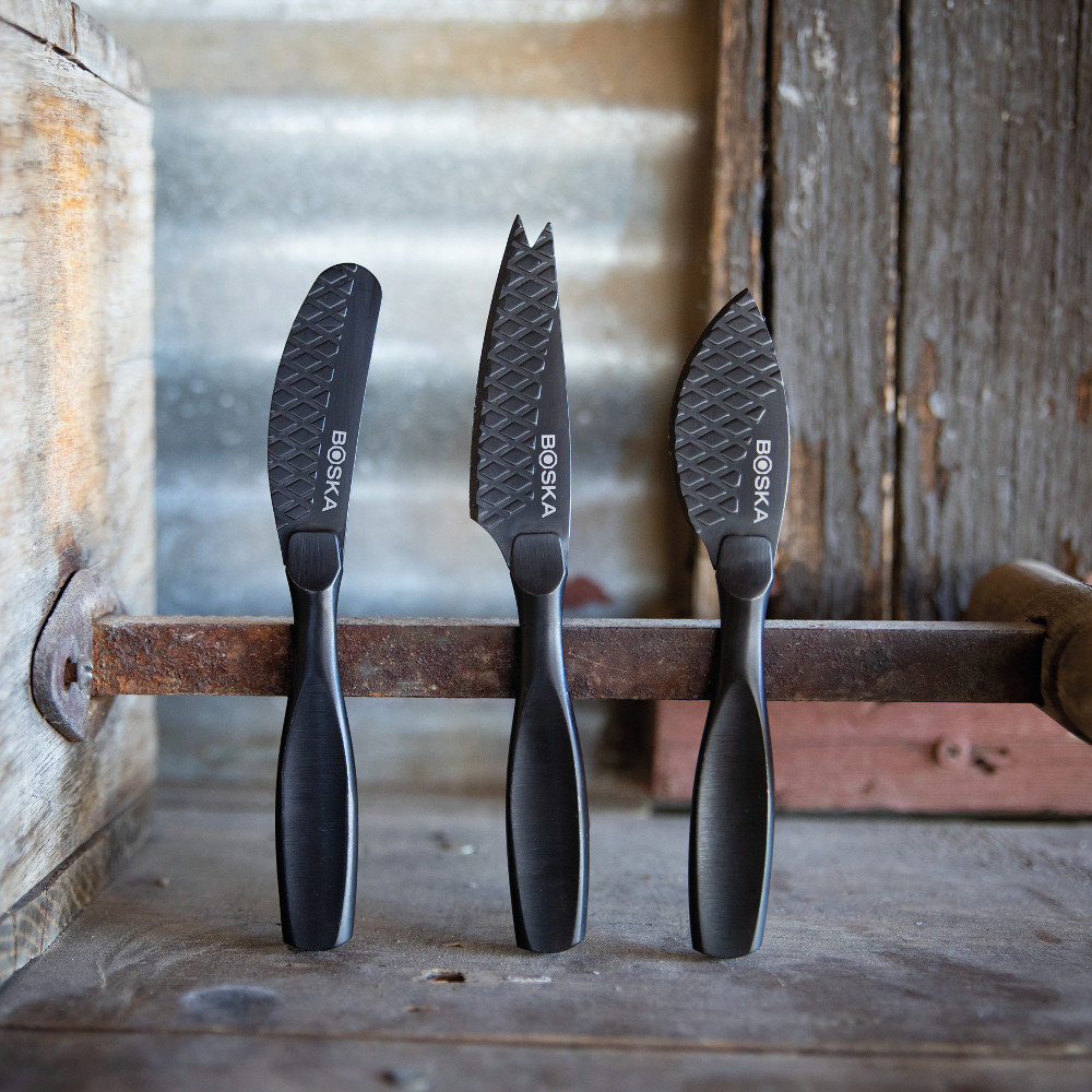 Noże są wykonane w całości ze stali nierdzewnej, pokrytej antracytową nieprzywierającą powłoką, dodatkowo specjalny wzór na klindze, przypominającym pikowanie, sprawia, że ser nie przylega w trakcie krojenia.