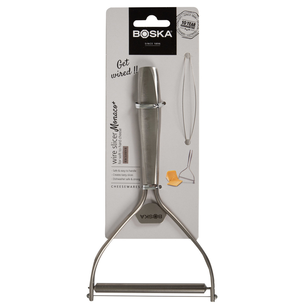 Krajalnica strunowa Monaco + przeznaczona jest krojenia młodych serów bez skórki. Nawet jeśli przypadkowo się ześlizgnie, drut tnący nie spowoduje obrażeń. Możesz ustawić krajalnicę do sera na dwie różne grubości plastrów. Krajalnica strunowa jest częścią kolekcji Monaco +. W zestawie 2 struny zapasowe.