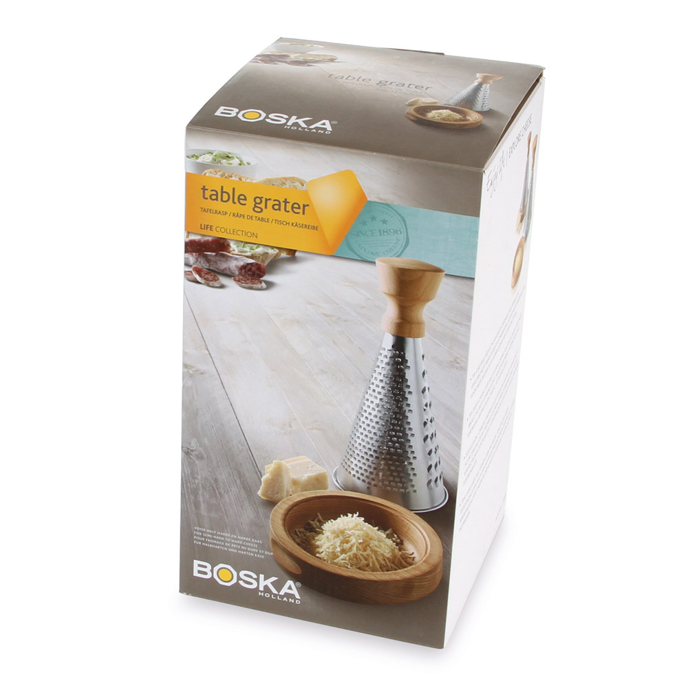 Tarka stożek do sera twardego i półtwardego łączy w sobie elegancki wygląd z funkcjonalnością. Tarka została zaprojektowana tak by cieszyć oko, a jednocześnie jest wygodna w użytkowaniu. Szeroki uchwyt na górze zapewnia komfort podczas pracy, podstawa drewniana jest jednocześnie miseczką na stary ser a do tego trzy rodzaje oczek, do starcia sera grubo, drobno lub na proszek. Drewniane elementy zostały wykonane z dębu.