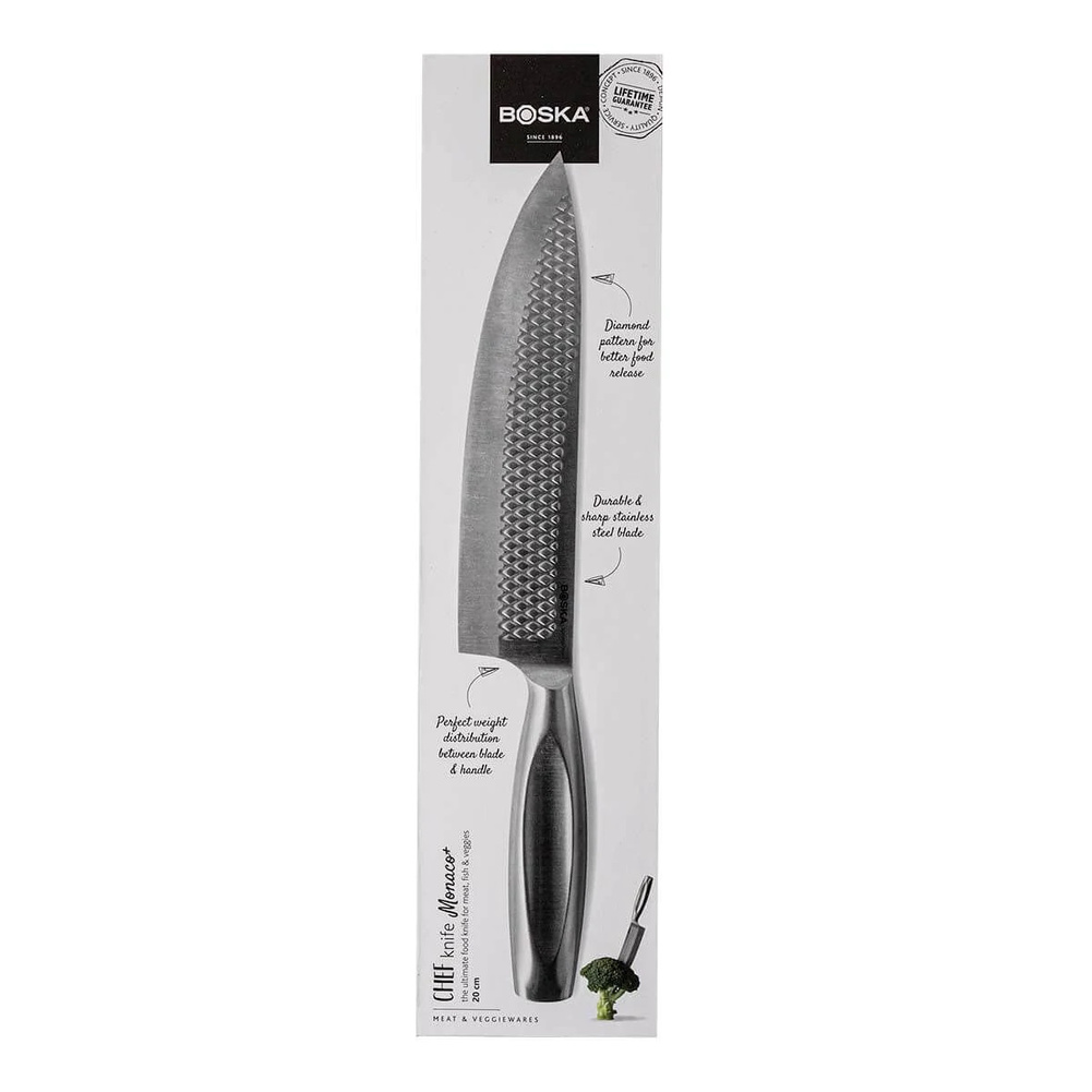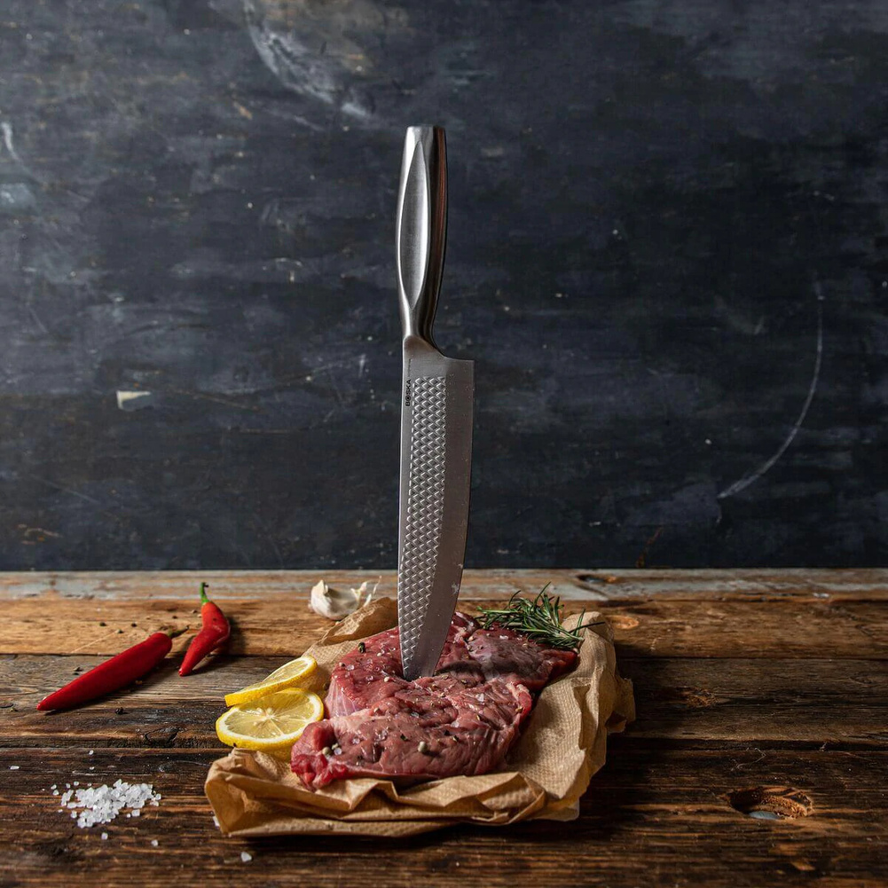 Nóż szefa kuchni – do krojenia wszystkiego! Ostrze wykonane zostało z dobrej jakości stali nierdzewnej o optymalnej twardości. Dzięki temu nóż pozostanie ostry przez długi czas. Jest łatwy w utrzymaniu i ostrzeniu. Dodatkowo charakterystyczny wzór rombu na ostrzu zapewnia mniejszy opór podczas cięcia. Nóż doskonale leży w dłoni, dzięki idealnemu wyważeniu ciężaru rękojeści i ostrza. Nóż należy myć ręcznie po użyciu. Wystarczy odrobina ciepłej wody i płynu do mycia naczyń. Koniecznie osusz nóż natychmiast po umyciu. Materiał: stal nierdzewna. Opakowanie: kartonowe pudełko.