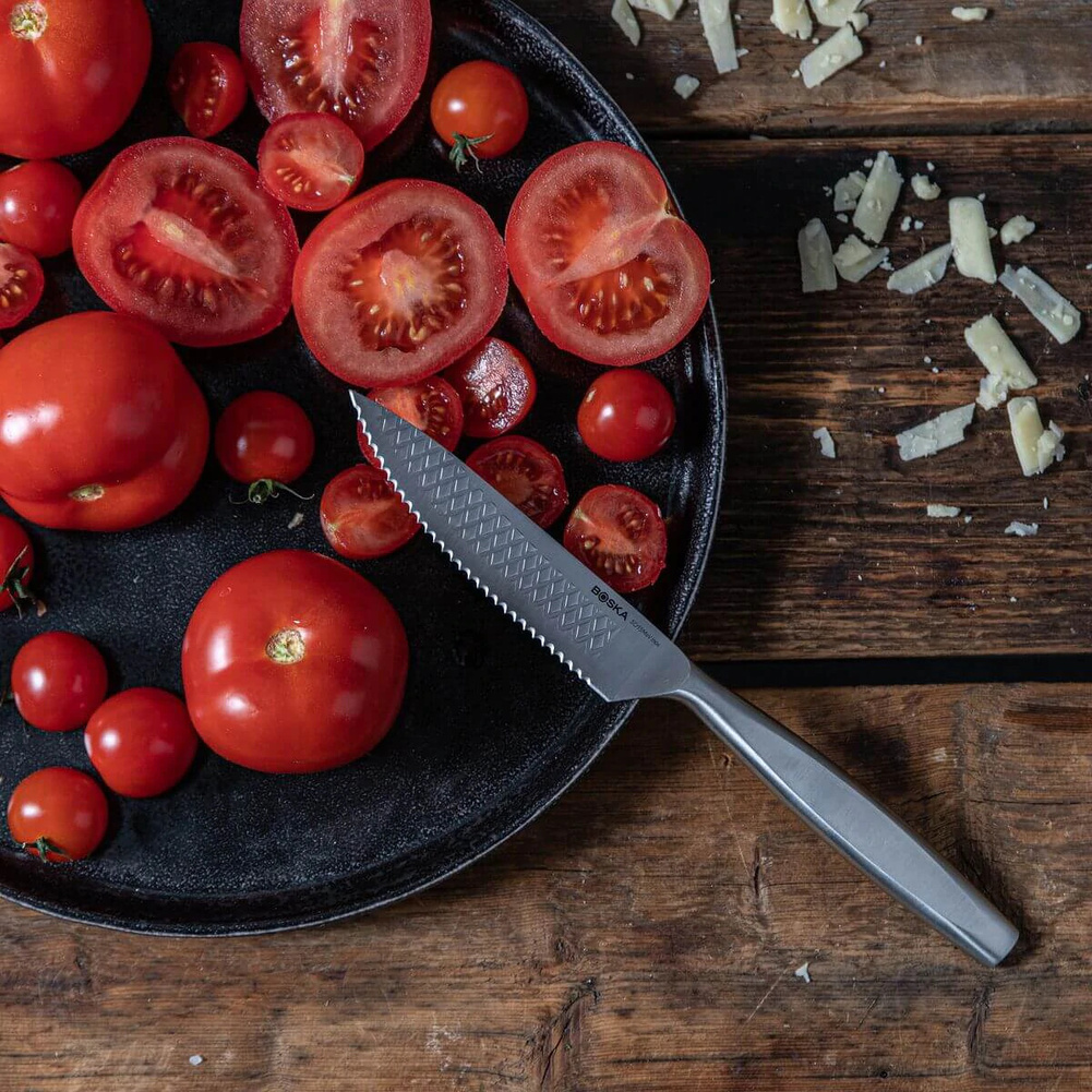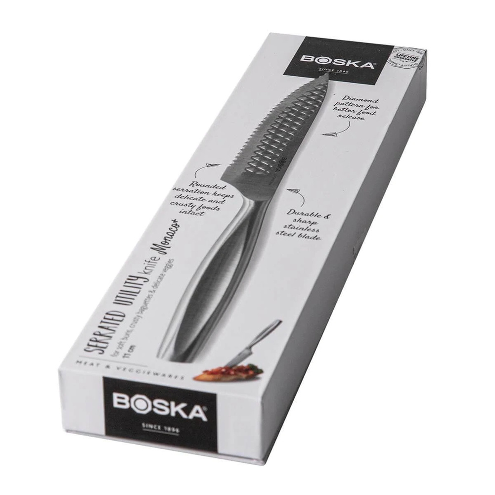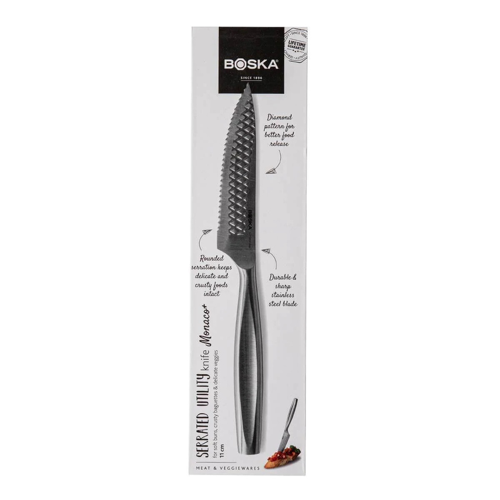 Ząbkowany nóż Monaco+ to idealny nóż do drobnych zadań, takich jak krojenie pomidorów czy bułek. Ten poręczny nóż z lekko zaokrąglonymi ząbkami zapewnia zachowanie struktury twardych bagietek, miękkich pomidorów oraz innych delikatnych warzyw. Ostrze wykonane jest z dobrej jakości stali nierdzewnej o optymalnej twardości. Dzięki temu nóż będzie ostry przez długi czas i jest łatwy w utrzymaniu. Dodatkowo charakterystyczny wzór rombu na ostrzu zapewnia mniejszy opór podczas cięcia. Nóż doskonale leży w dłoni, dzięki idealnemu wyważeniu ciężaru rękojeści i ostrza. Nóż należy myć ręcznie po użyciu. Wystarczy odrobina ciepłej wody i płynu do mycia naczyń. Koniecznie osusz nóż natychmiast po umyciu. Materiał: stal nierdzewna. Opakowanie: kartonowe pudełko.