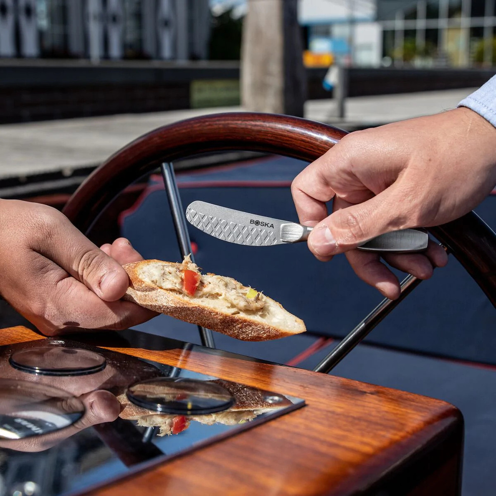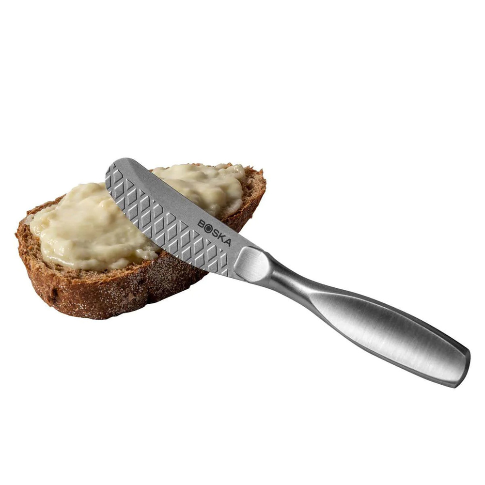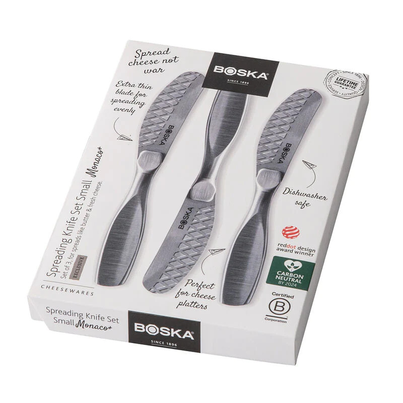 Zestaw składa się z trzech noży wykonanych w całości ze stali nierdzewnej. Spłaszczona rękojeść pewnie leży w dłoni a elastyczne ostrze noża delikatnie wygina się, co sprawia, że rozsmarowywanie jest dużo łatwiejsze. Noże są idealne do świeżych serów, pesto, masła itp. Dzięki ostrzu o strukturze plastra miodu rozprowadzanie past i serów po pieczywie jest jeszcze prostsze! Jakkolwiek noże można myć w zmywarce, to zaleca się mycie ręczne. Przybliżone wymiary noża do smarowania: całkowita długość - 14,5cm, długość ostrza - 6,5cm, szerokość - 2cm. Przybliżone wymiary brutto: wysokość - 17,5cm, długość - 12,3cm, szerokość - 1,8cm. Przybliżona waga brutto: 0,218kg. Opakowanie: kartonowe pudełko prezentowe.