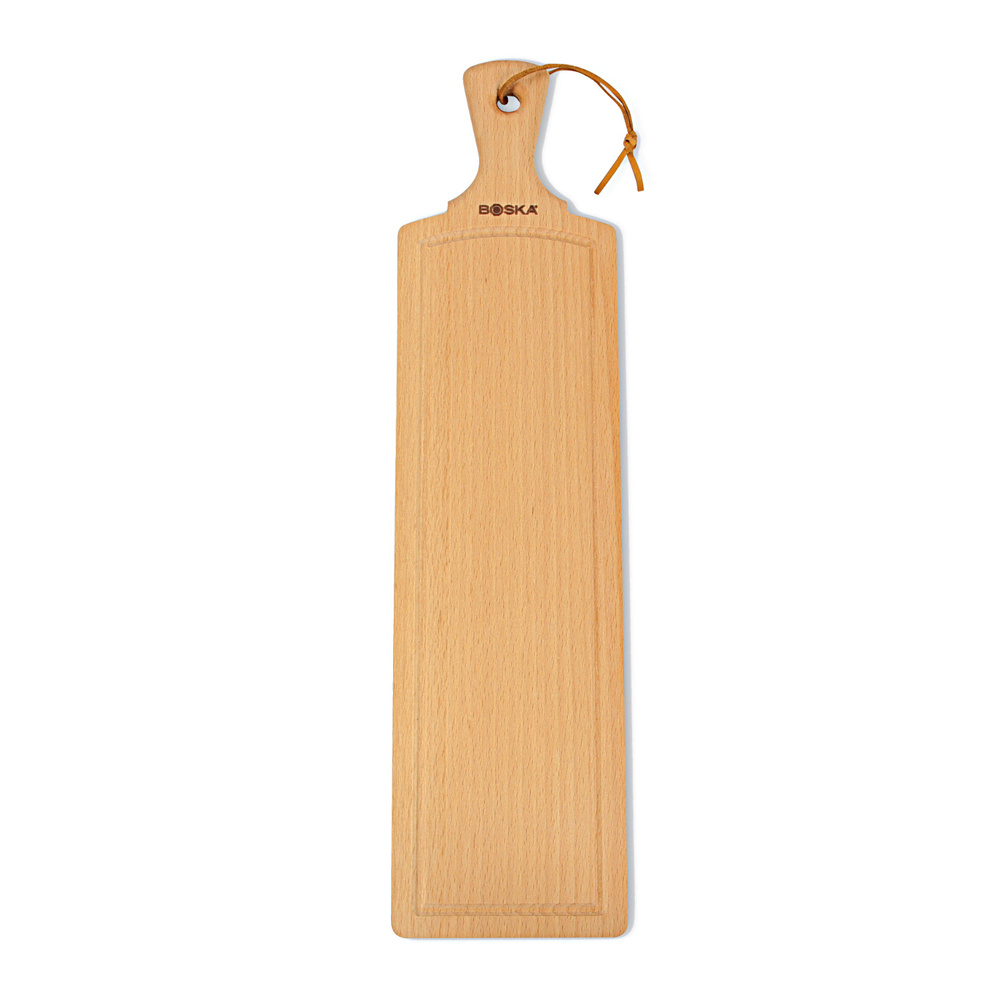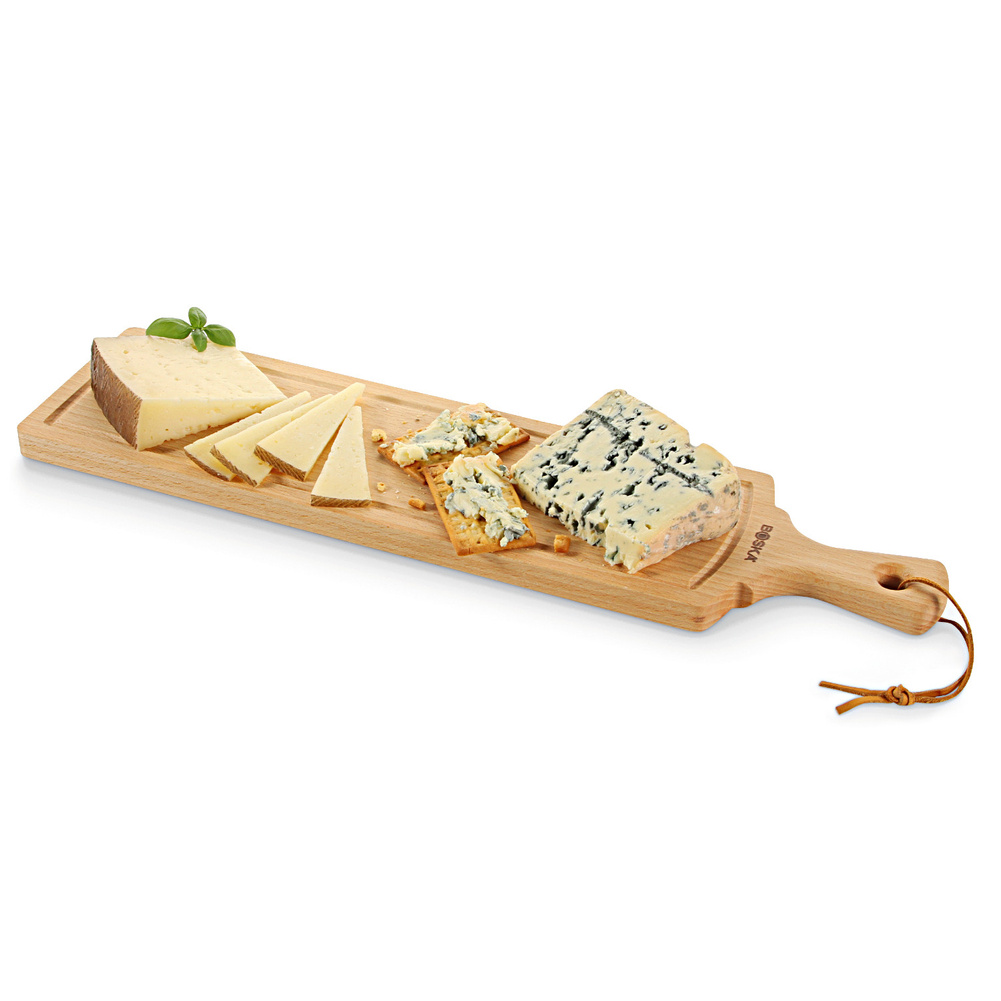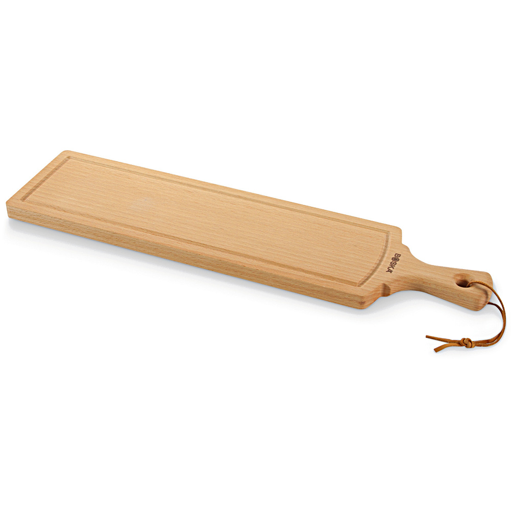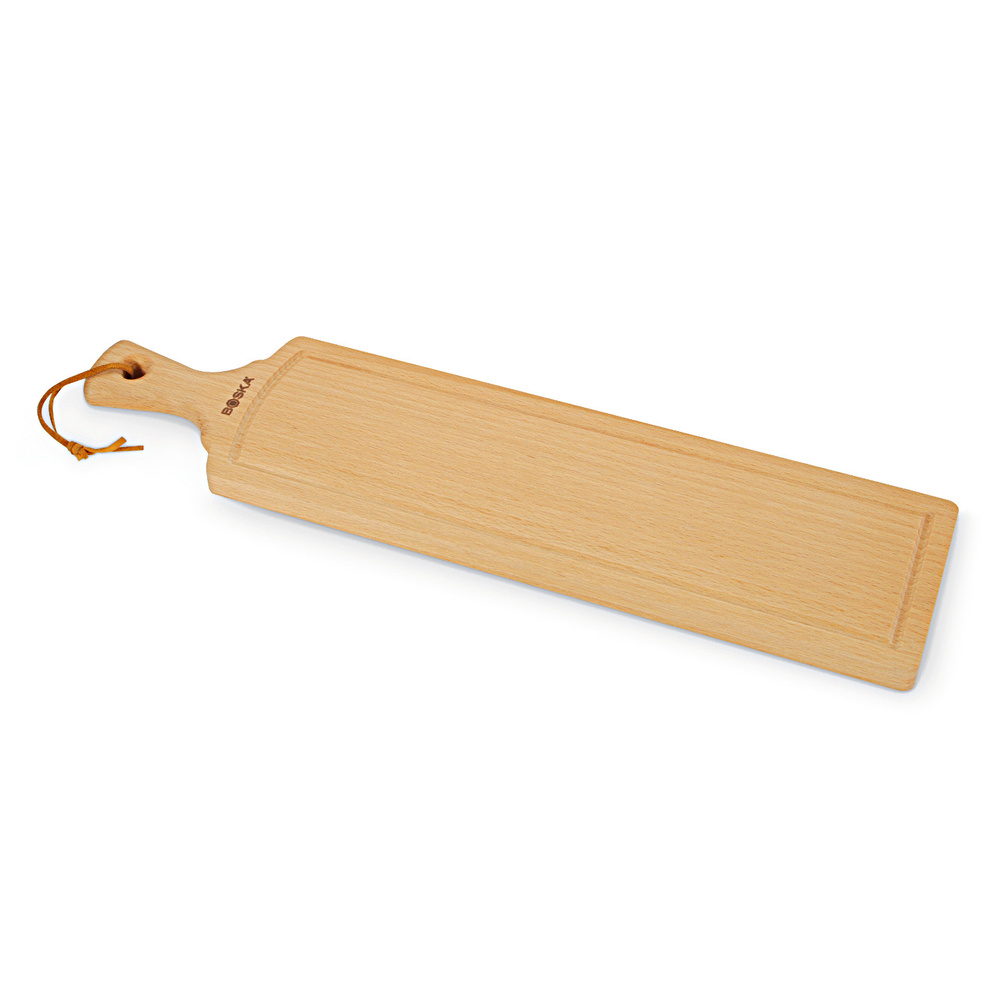 Bukowa deska do serwowania przekąsek o długości 44,5 cm! Deska ma wprost wymarzony kształt do serwowania przekąsek z sera, które prezentują się na niej po królewsku. Grubość deski to 1,5cm,całkowita długość 44,5cm a szerokość 11 cm a powierzchnia do serwowania to 33 cm na 8 cm! Przed pierwszym użyciem deskę należy solidnie naoliwić, pozwolić by drewno chłonęło olej przez kilka dni. Potem czynność należy powtarzać co jakiś czas. Deskę myjemy ręcznie z dodatkiem łagodnych detergentów,