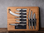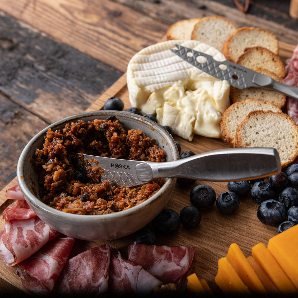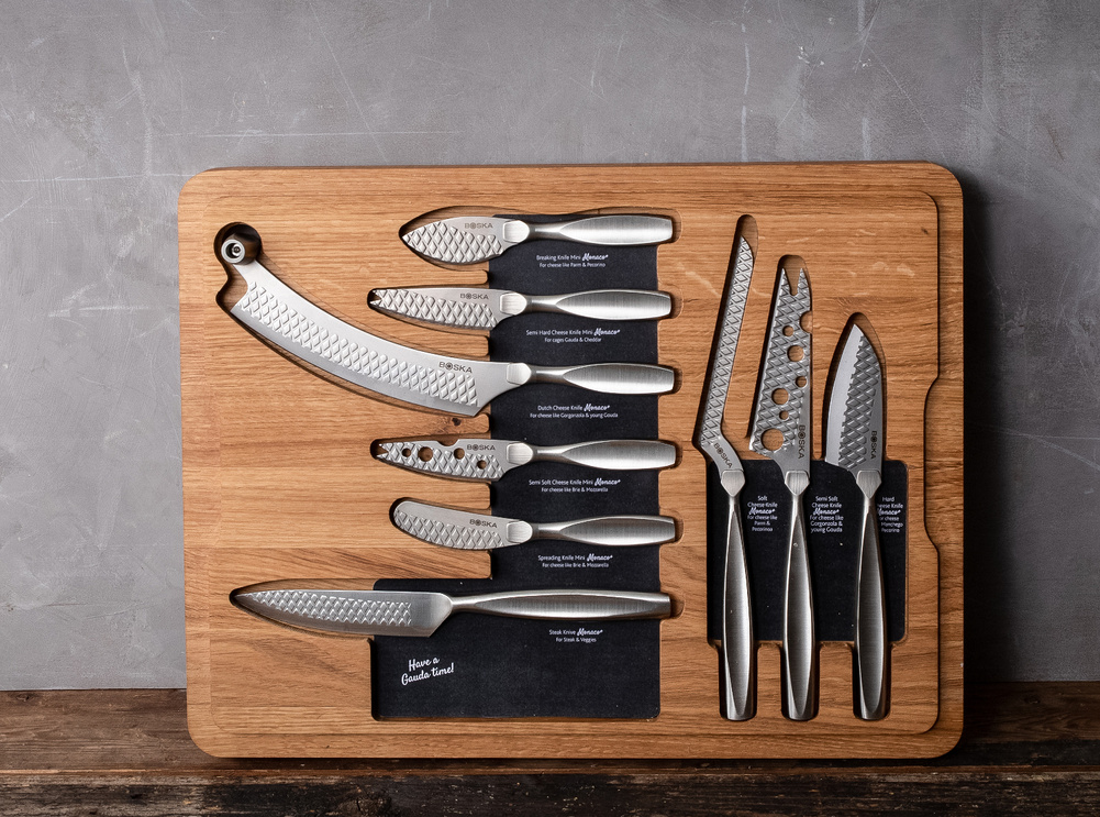 Zestaw Ultimate Charcuterie Set Monaco+ 8 noży do sera + 1 nóż do steków w drewnianej kasecie - desce. Szukasz najlepszego prezentu dla smakosza sera? W takim razie nie wahaj się i wybierz kompaktowy zestaw do serów i steków Ultimate Monaco+ z Boski. To kompletny zestaw: 9 – w tym 4 małych – noży do sera ze stali nierdzewnej oraz noża do steków. Teraz z łatwością dobierzesz odpowiedni nóż do serwowanych na stylowej, dębowej desce smakołyków. Deska wykonana jest z drewna dębowego, jej ponadczasowy design z łatwością wpisze się w każdy wystrój domu. Z boku deski wgłębienia dla łatwiejszego transportu. Drewniana deska składa się z dwóch części i została zaprojektowana tak, aby można było w niej przechowywać wszystkie noże do sera. Dzięki temu zawsze będziesz mieć wszystko pod ręką. W skład zestawu wchodzi 9 noży z czego 4 to mini noże. Dzięki powłoce BSF™ ser nie przywiera do noża. Noże są wykonane ze stali nierdzewnej i można je myć w zmywarce, ale po zakończeniu cyklu należy je natychmiast wyjąć i osuszyć jak każde stalowe narzędzie. Pamiętaj, aby myć drewnianą deskę ręcznie i pozostawić do wyschnięcia w pozycji pionowej. Co miesiąc spryskaj drewno olejem do desek BOSKA, aby zabezpieczyć je przed pękaniem, przebarwieniami i nieprzyjemnym zapachem. Przybliżone wymiary noża do steków: całkowita długość - 23,5cm, długość ostrza - 11cm, szerokość - 2,5cm. Przybliżone wymiary noża mini do smarowania: całkowita długość - 15cm, długość ostrza - 6,5cm, szerokość - 2cm. Przybliżone wymiary noża mini do półtwardych serów: całkowita długość - 16cm, długość ostrza - 7cm, szerokość - 2cm. Przybliżone wymiary noża mini cheesy: całkowita długość - 16cm, długość ostrza - 6,8cm, szerokość - 2,2cm. Przybliżone wymiary noża holenderskiego: całkowita długość - 25cm, długość ostrza - 14cm, szerokość - 2,7cm. Przybliżone wymiary noża mini do sera twardego: całkowita długość - 14,5cm, długość ostrza - 5cm, szerokość - 2,5cm. Przybliżone wymiary noża do sera pleśniowego: całkowita długość - 26cm, długość ostrza - 11,3cm, szerokość - 1cm. Przybliżone wymiary noża cheesy do sera miękkiego: całkowita długość - 24,2cm, długość ostrza - 9,5cm, szerokość - 3cm. Przybliżone wymiary noża do sera twardego: całkowita długość - 21cm, długość ostrza - 7,5cm, szerokość - 3,1cm. Przybliżone wymiary deski: wysokość - 2,7cm, długość - 40,7cm, szerokość - 30,7cm. Przybliżone wymiary całości: wysokość - 4,5cm, długość - 40,7cm, szerokość - 30,7cm. Przybliżone wymiary brutto: wysokość - 6,3cm, długość - 44cm, szerokość - 34cm. Waga brutto: 5,5kg. Opakowanie: kartonowe pudełko prezentowe, karton szary.