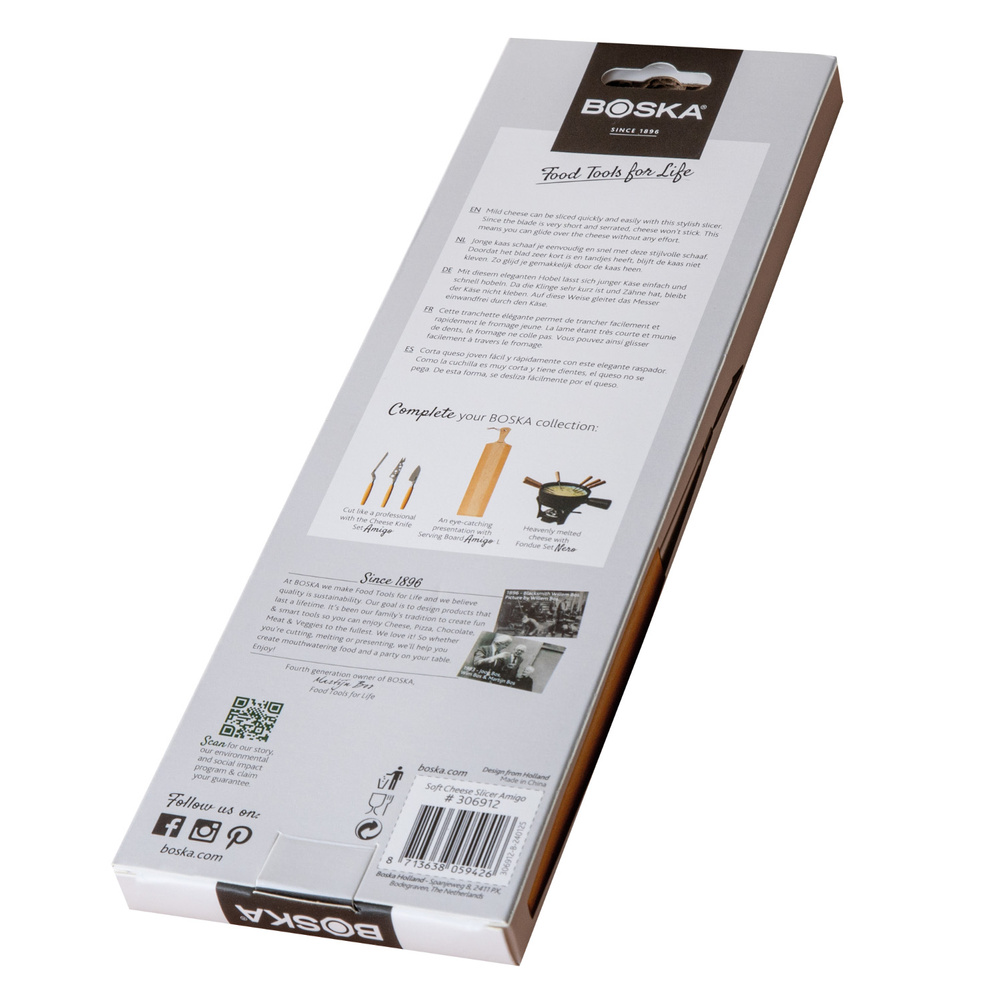 Krajacz do sera miękkiego rączką z drewna bukowego nadaje się do serów miękkich. Zębate ostrze zostało wykonane ze stali nierdzewnej pokrytej powłoką BSF™ co zapobiega przywieraniu sera podczas krojenia. Zaleca się myć ręcznie. Materiał: stal nierdzewna, drewno bukowe. Przybliżone wymiary: długość - 17,5cm, szerokość całkowita - 7,5cm, szerokość ostrza - 5,5cm. Przybliżone wymiary brutto: wysokość - 29cm, długość - 9,2cm, szerokość - 1,5cm. Przybliżona waga brutto: 0,108kg. Opakowanie: kartonowe pudełko prezentowe/ zawieszka z okienkiem.