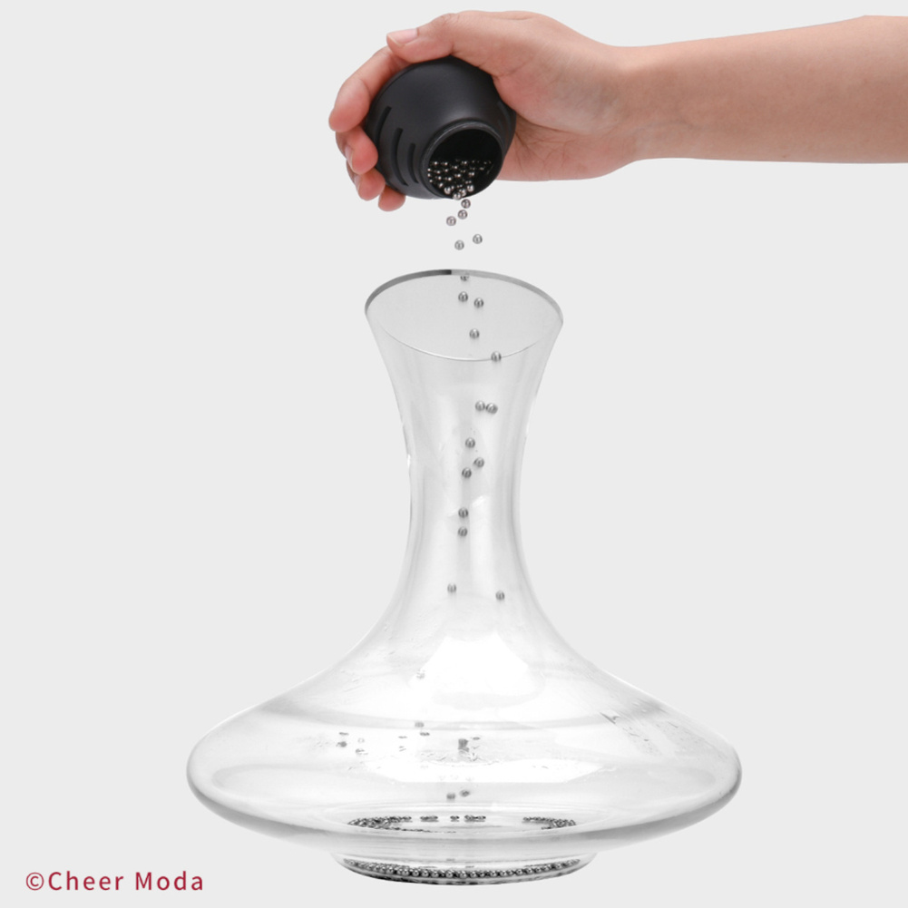 Wykonane z polerowanej stali nierdzewnej perły można wsypać do różnych naczyń (karafek, dekanterów, butelek), dodając odrobinę wody i ułatwić sobie ich wyczyszczenie, usuwając plamy i inne pozostałości. Perły są przechowywane w “muszli”, niewielkim pojemniku o odpowiednim wyprofilowaniu, ułatwiającym „przelewanie” pereł do naczynia. Shell to łatwy i solidny sposób na wyczyszczenie dekantera. Uwaga: Perły to nie zabawka i nie są przeznaczone dla dzieci! Po użyciu perełki należy dokładnie osuszyć. Pereł nie należy moczyć zbyt długo w wodzie. Po czyszczeniu karafki należy upewnić się, że żadna perła nie pozostała w karafce. Materiał: PP, stal nierdzewna. Opakowanie: kartonowe pudełko prezentowe.