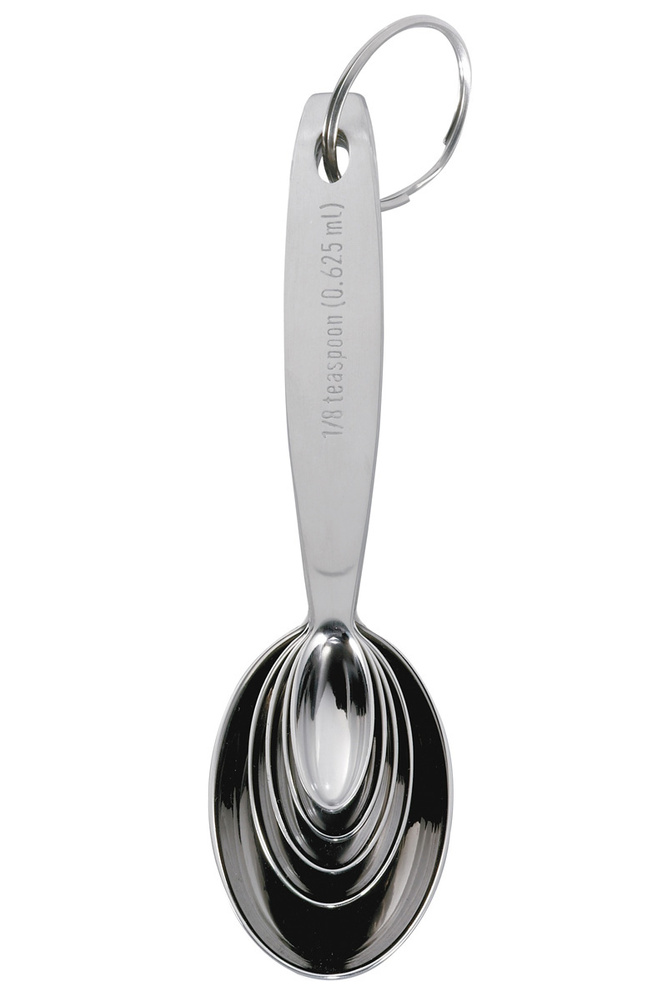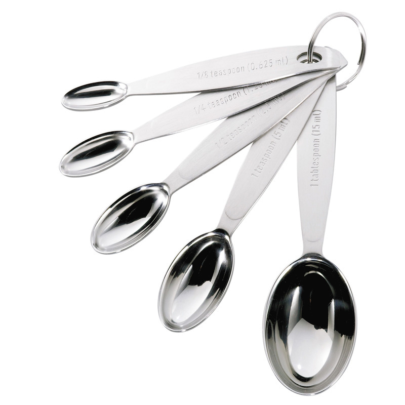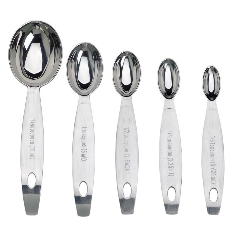 Zestaw 5 łyżek - miarek wykonanych ze stali nierdzewnej. Przydadzą się w każdej kuchni. Owalny kształt miarek sprawia, że dużo łatwiej jest je włożyć do niewielkich słoiczków i pojemników. W zestawie znajdują się łyżki o pojemności: 1/8 łyżeczki (0,625 ml), 1/4 łyżeczki (1,25 ml), 1/2 łyżeczki (2,5 ml), 1 łyżeczka (5 ml), 1 łyżka (15 ml). Wytrzymała konstrukcja miarek jest odporna nawet na duży nacisk, więc nie ma obawy, że złamie się nawet kiedy nabierany jest twardy cukier czy duża porcja mąki. Miarki są wytwarzane z najtwardszej stali nierdzewnej. Cechy miarek: - lekko wygięte pod spód rączki pozwalają ustawić miarki bezpiecznie na blacie, bez obawy wysypania zawartości. - każda z miarek posiada oczko do zawieszenia lub spięcia specjalnym klipsem. - klips do połączenia miarek w zestawie, pozwala przechowywać je w jednym miejscu. - można włożyć jedną miarkę w drugą, co pozwala łatwiej je przechowywać i zaoszczędzi miejsca w szufladzie. - wykonane z solidnej stali nierdzewnej. Można myć w zmywarce.