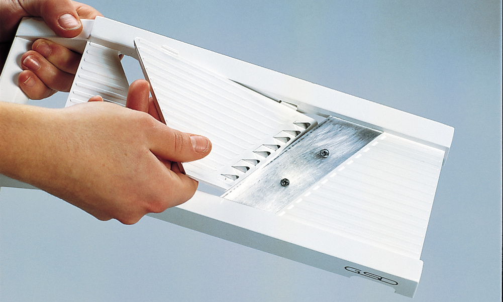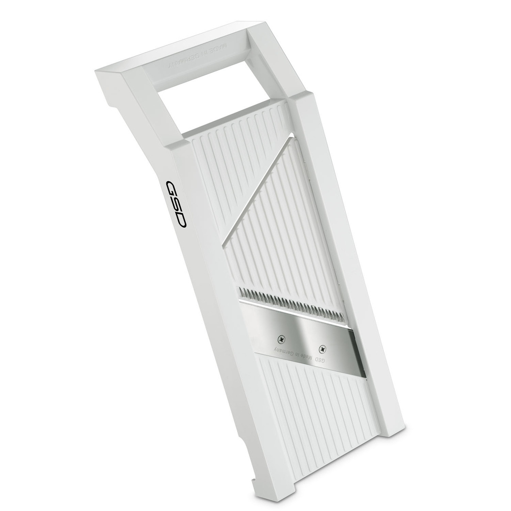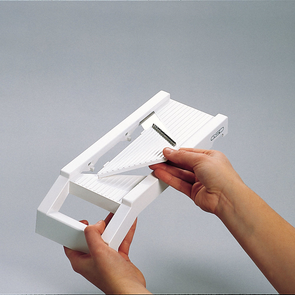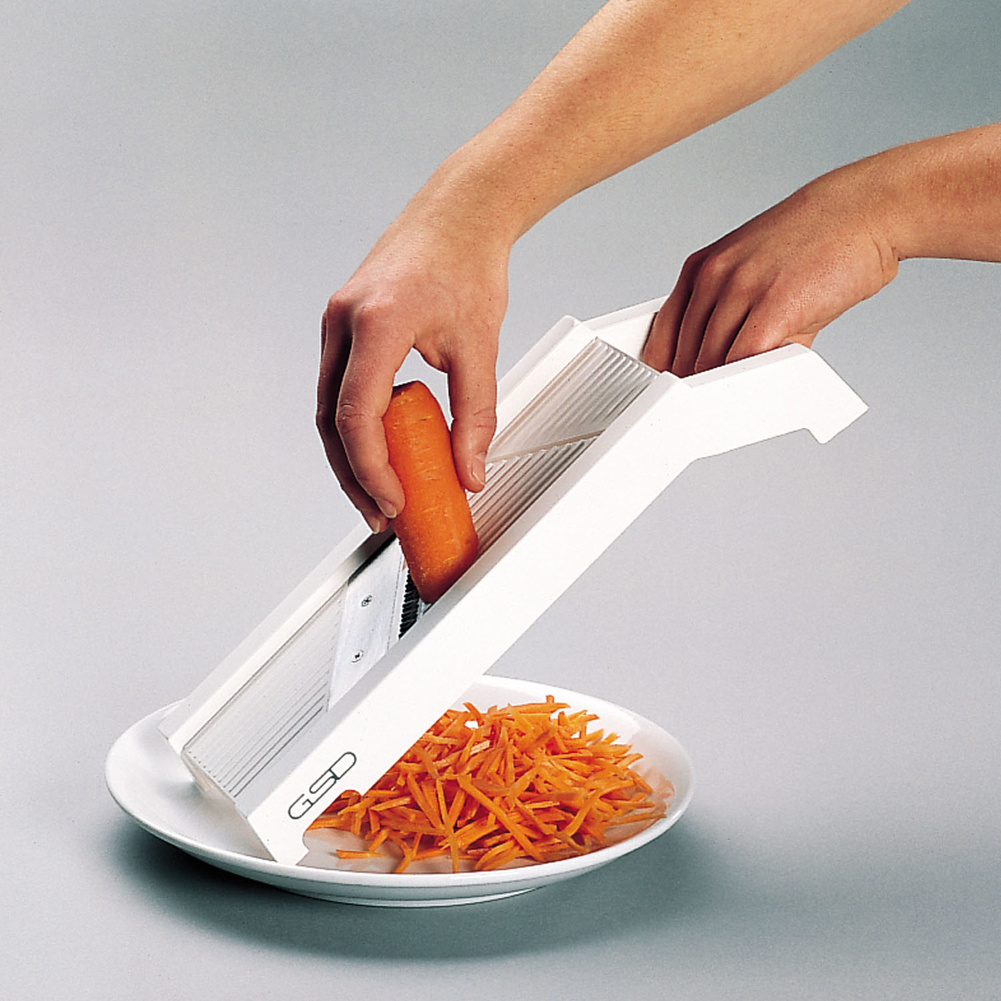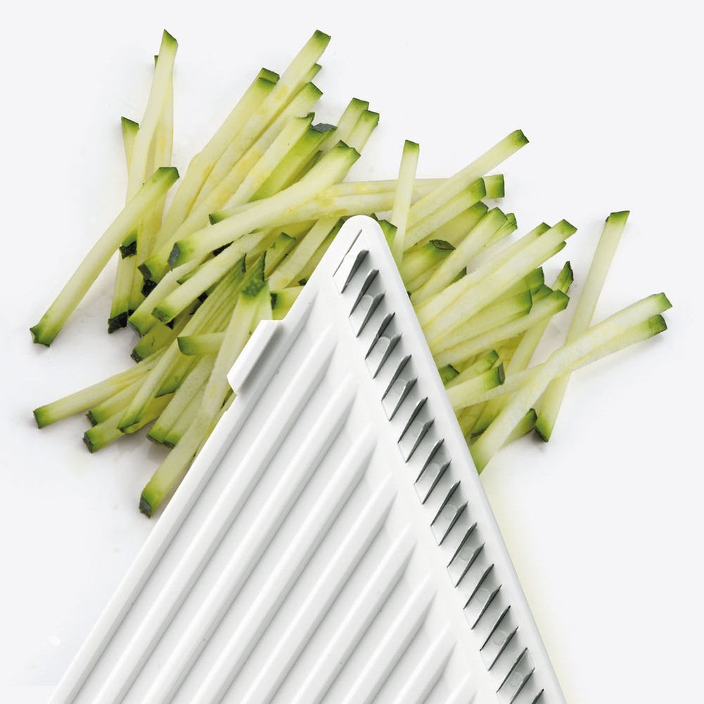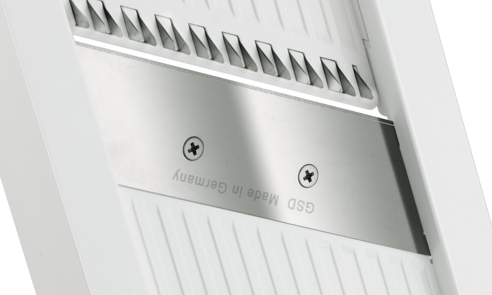 Uniwersalna szatkownica do warzyw 2w1 w kolorze białym posiada wysokiej jakości ostrze ze stali nierdzewnej wykonane w Niemczech. Dodatkowo posiada dwie wymienne wkładki umożliwiające cięcie plastrów o grubościach 2mm, 3mm oraz pasków o grubości około 2,3mm i szerokości 1mm. Żadne warzywo nie oprze się tej szatkownicy. A oprócz warzyw można na niej kroić dojrzały ser. Dzięki poręcznemu kształtowi i kompaktowej formie szatkownica wygodnie spoczywa w dłoni i z łatwością mieści się w kuchennej szufladzie, nie zajmując wiele miejsca. Rama została wykonana z wysokiej jakości tworzywa sztucznego. Zalecane jest mycie ręczne. Produkt wykonany w Niemczech.