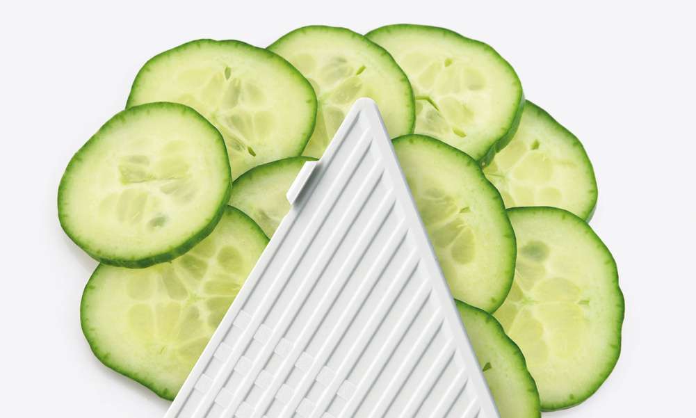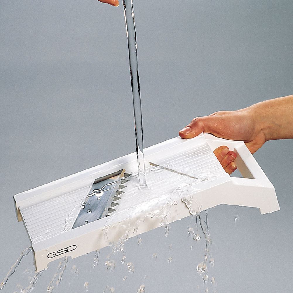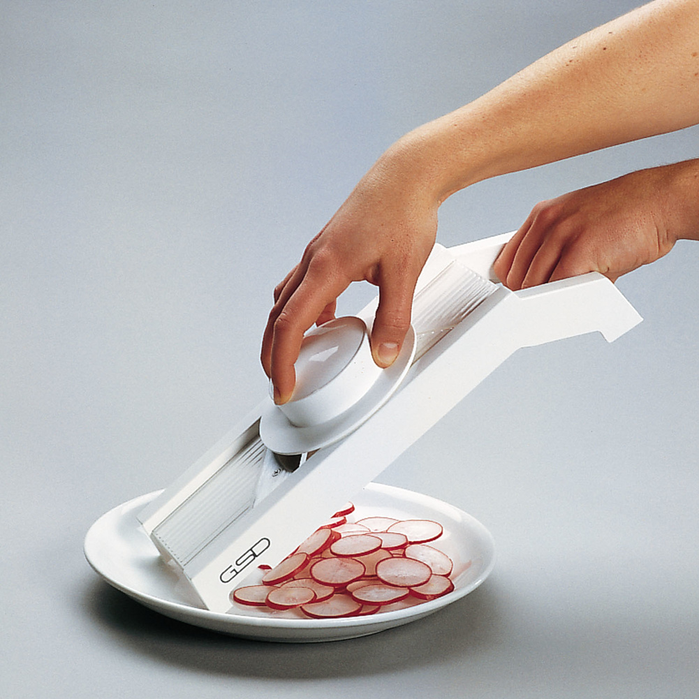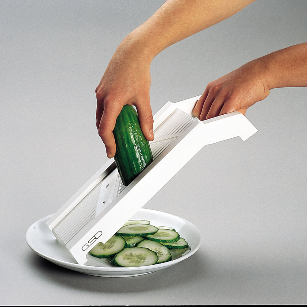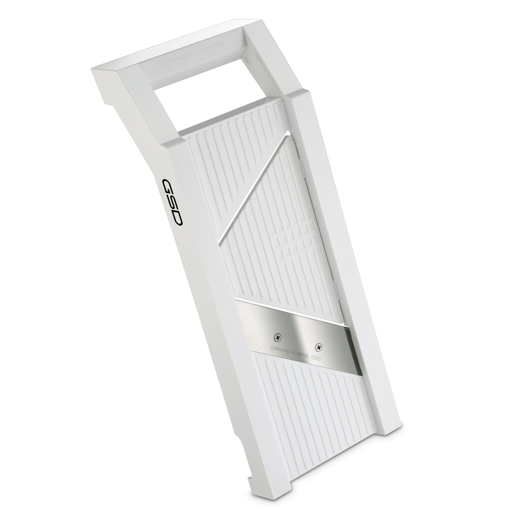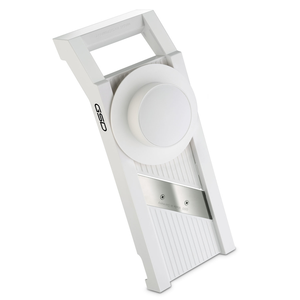 Uniwersalna szatkownica do warzyw 2w1 w kolorze białym posiada wysokiej jakości ostrze ze stali nierdzewnej wykonane w Niemczech. Dodatkowo posiada dwie wymienne wkładki umożliwiające cięcie plastrów o grubościach 2mm, 3mm oraz pasków o grubości około 2,3mm i szerokości 1mm. Żadne warzywo nie oprze się tej szatkownicy. A oprócz warzyw można na niej kroić dojrzały ser. Dzięki poręcznemu kształtowi i kompaktowej formie szatkownica wygodnie spoczywa w dłoni i z łatwością mieści się w kuchennej szufladzie, nie zajmując wiele miejsca. Rama została wykonana z wysokiej jakości tworzywa sztucznego. Zalecane jest mycie ręczne. Produkt wykonany w Niemczech.