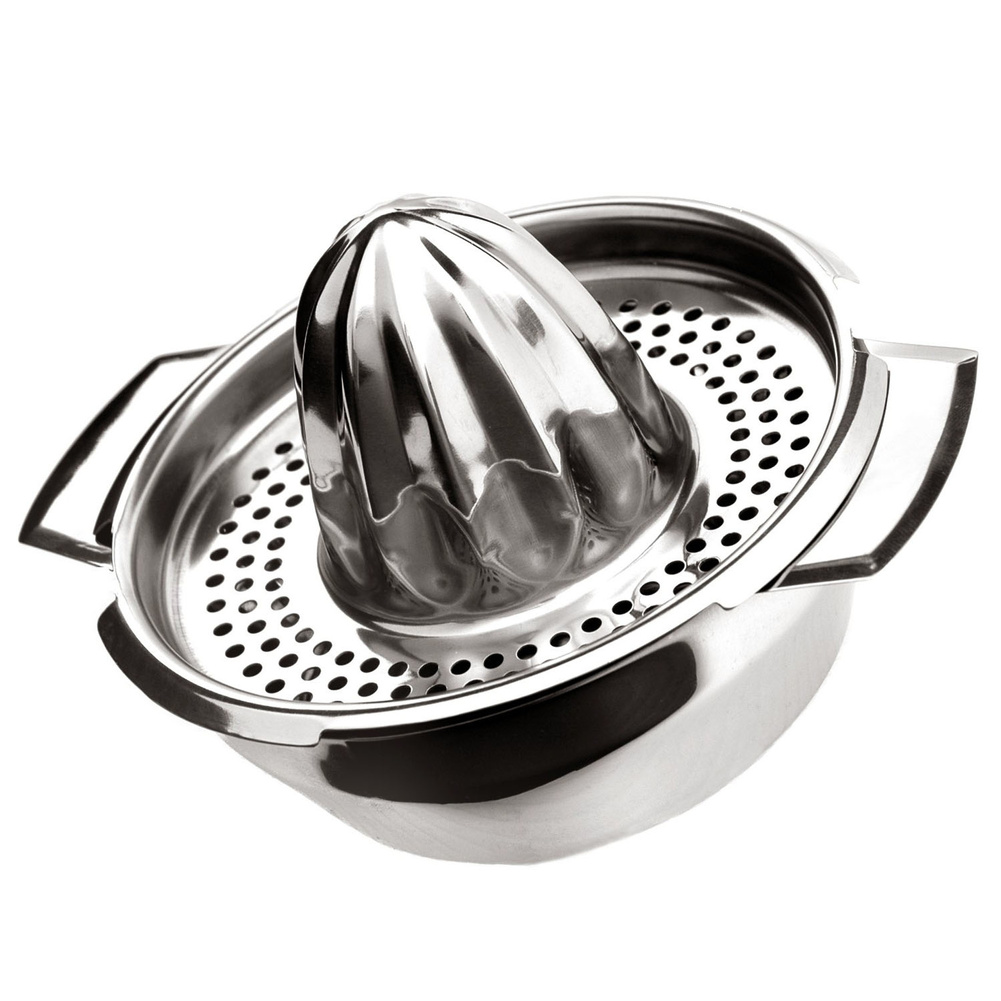 SQUIZITO jest wyciskaczem do cytrusów wykonanym ze stali nierdzewnej. Otwory w filtrze pozwalają w łatwy sposób oddzielić sok od miąższu z nasionami. Dwa boczne uchwyty zapewniają bezpieczny chwyt. Wyciskacz jest bardzo łatwy w czyszczeniu. Można myć w zmywarce. Produkt może nosić ślady produkcyjne, które w żaden sposób nie wpływają na jego walory użytkowe. Materiał: stal nierdzewna.