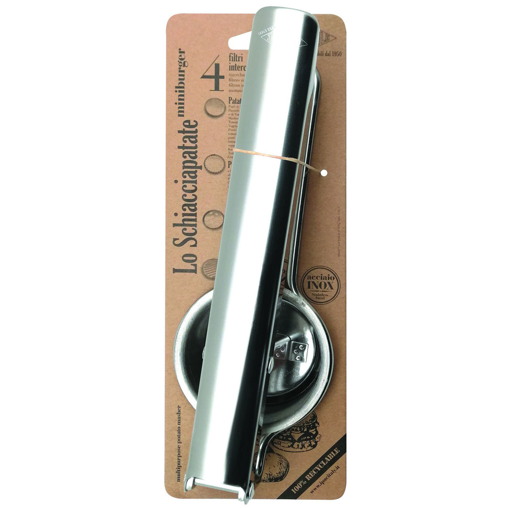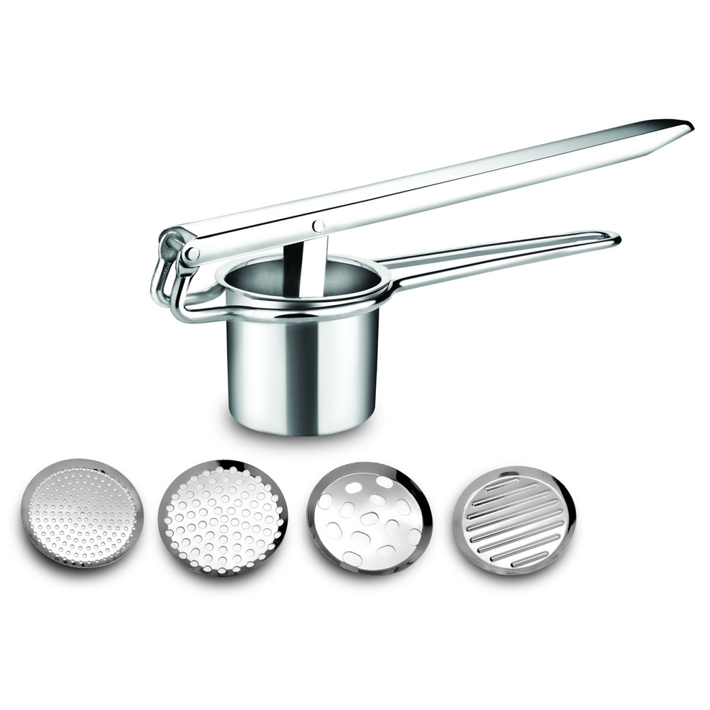 Praska do ziemniaków ze stali nierdzewnej z czterema wymienialnymi filtrami: - do prasowania ziemniaków, - do przygotowywania włoskiego Passatelli, - do przygotowywania gnocchi i spätzle, - do przygotowywania domowych mini hamburgerów. Łatwa w czyszczeniu. Można myć w zmywarce. Produkt może nosić ślady produkcyjne, które w żaden sposób nie wpływają na jego walory użytkowe. Materiał: stal nierdzewna. Wymiary netto: 27,2x10x14cm. Wymiary brutto: 11,5x31x14cm. Waga brutto: 0,592kg. Waga netto: 0,570kg.