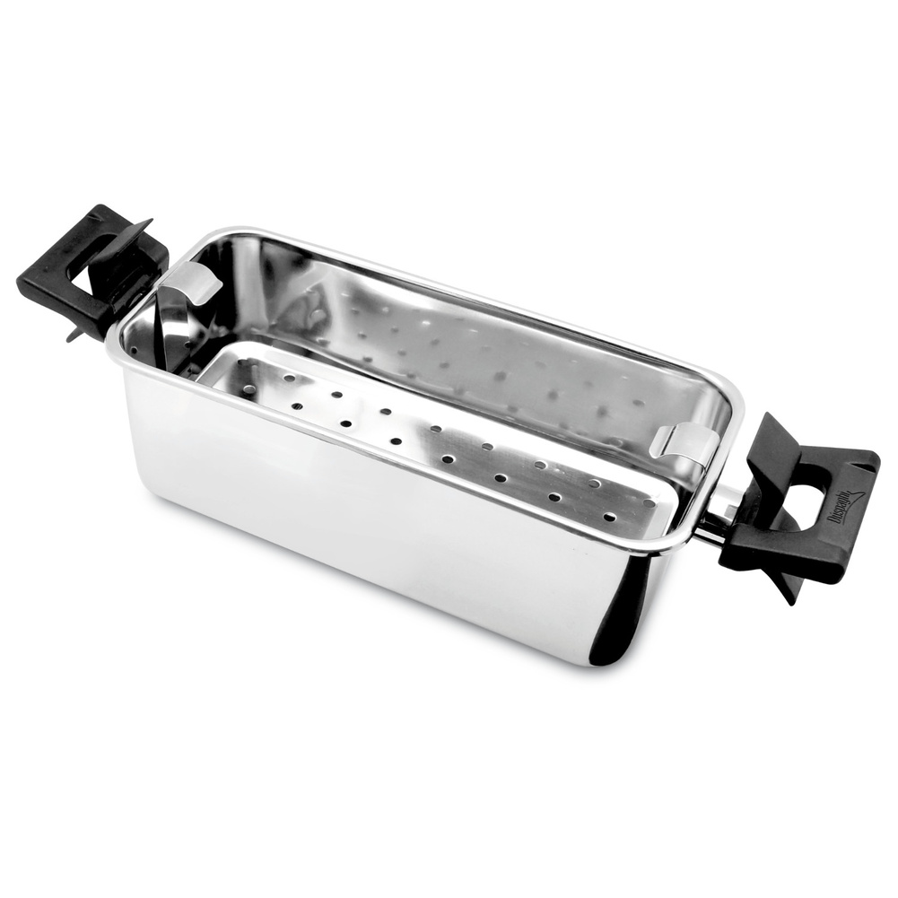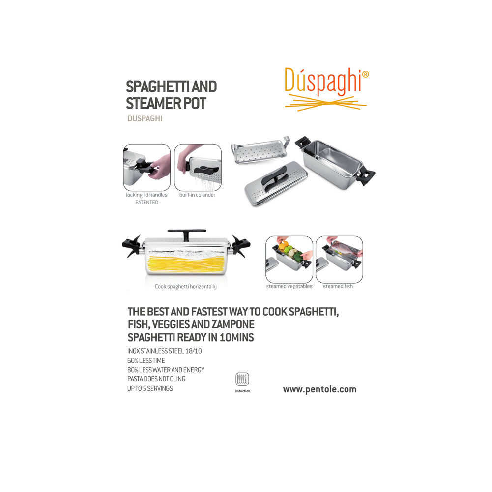 Gotując spaghetti w tym podłużnym garnku oszczędzasz wodę, energię i czas. Uchwyt został zaprojektowany tak, że z łatwością, bezpiecznie odlejesz wodę przez dziurki w pokrywie bez rękawic i dodatkowych gadżetów do odcedzania. W naczyniu przyrządzisz zdrowe i smaczne potrawy na parze. Smażenie, pieczenie i grillowanie mogą nawet do 30% obniżać zawartość witaminy B. Gotowanie na parze warzyw, ryb zatrzymuje soki w potrawie, zachowując większość wartości odżywczych. Dzięki wkładce bez problemu wyjmiesz przygotowane potrawy w całości, które będą nie tylko rewelacyjnie smakować, ale też wyglądać. Podłużny garnek z pokrywą oraz wkładka wykonane są ze stali nierdzewnej, uchwyt z tworzywa. Podczas gotowania na parze upewnij się, że woda jest poniżej wkładki. Para nie powinna być zbyt intensywna, ponieważ skóra, tuszka może pęknąć. Aby zapobiec przywieraniu zalecamy stosowanie papieru do pieczenia. Zaleca się myć ręcznie przy użyciu łagodnego detergentu, po umyciu należy dokładnie osuszyć naczynie. Opakowanie: karton.
